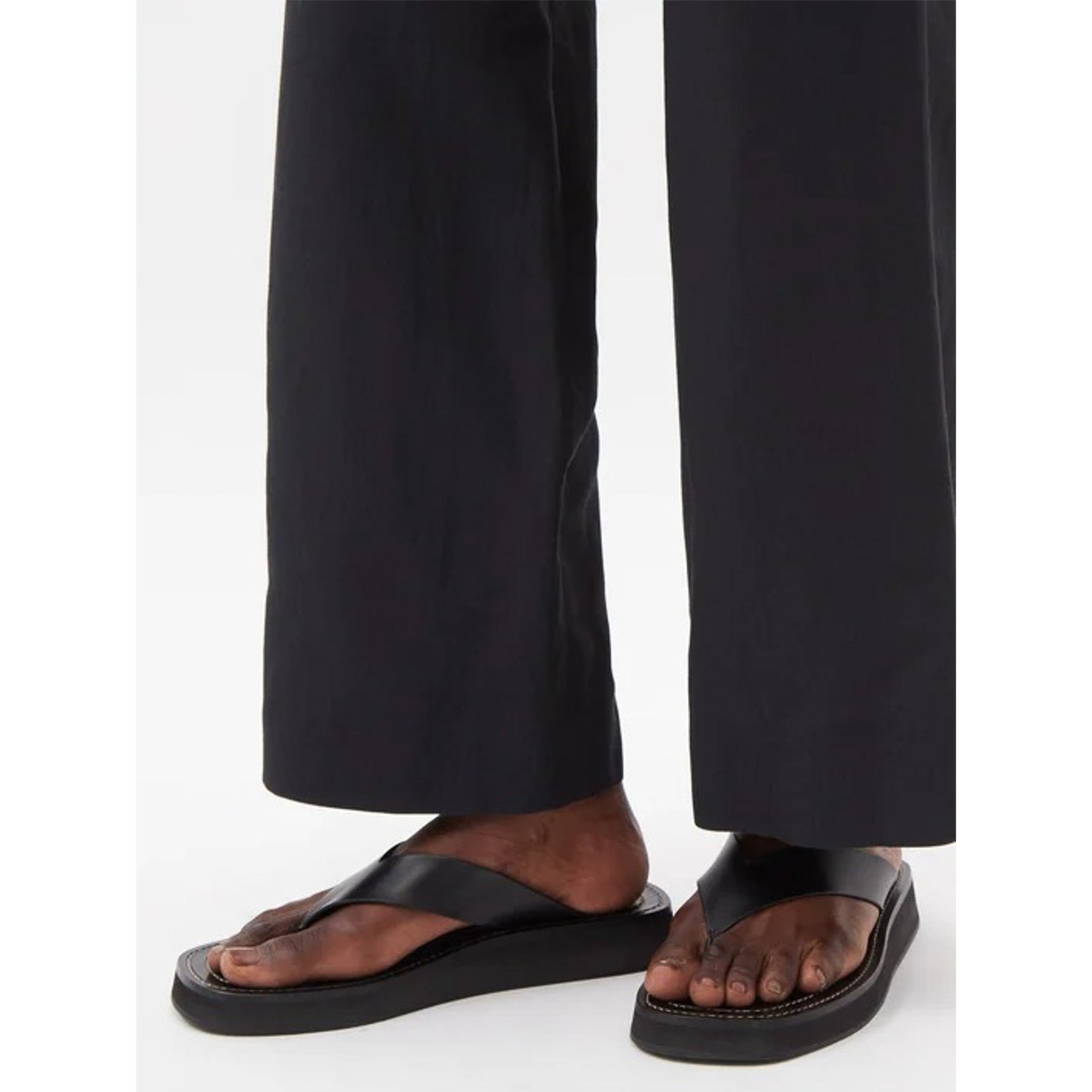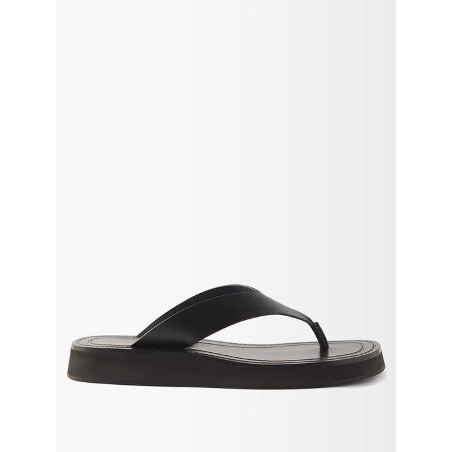 まず最初にご紹介するのは、ミニマムなデザインに心惹かれる「ザ?ロウ(The Row)」のギンザサンダル。美しいブラックレザーで仕立てられた一足は、計算されたチャンキーシルエットとこだわりのディテールで、センスの良さとスタイルアップを叶えます。