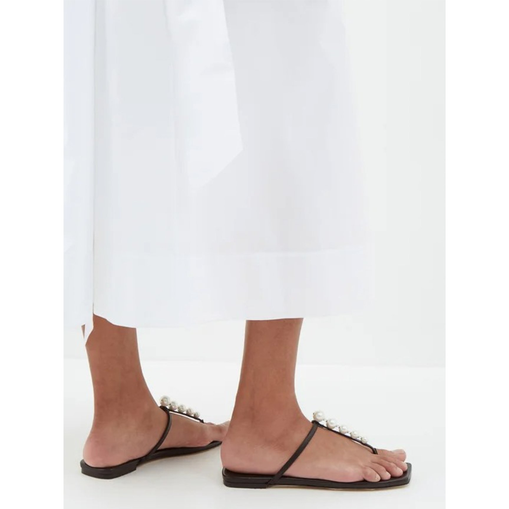 イミテーションパールとスワロフスキーがリュクスに輝く、「ジミー チュウ(JIMMY CHOO)」のサンダル。スクエアトゥのカットディテールと華奢なトングストラップがフェミニンな一足で、優雅なエフォートレススタイルを完成させてはいかが?