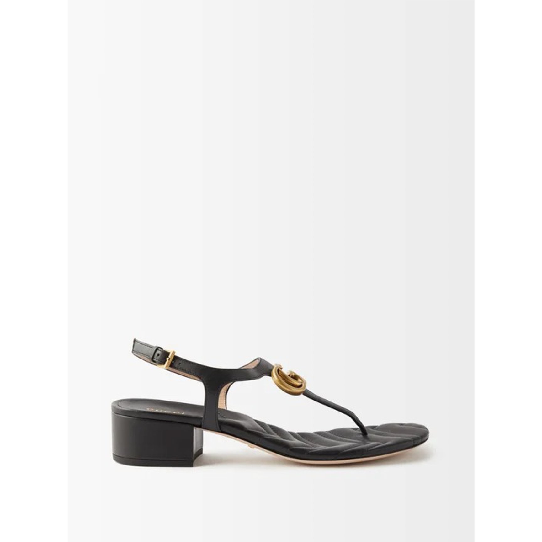 ヒールタイプのサンダルがお好みなら、「グッチ(GUCCI)」のエレガントな一足がおすすめ。ブロックヒールが安定感のある闊歩を叶え、ドレスアップにも夏のカジュアルスタイルにもマッチ。ゴールドのGGマーモントがリュクスなポイントに。