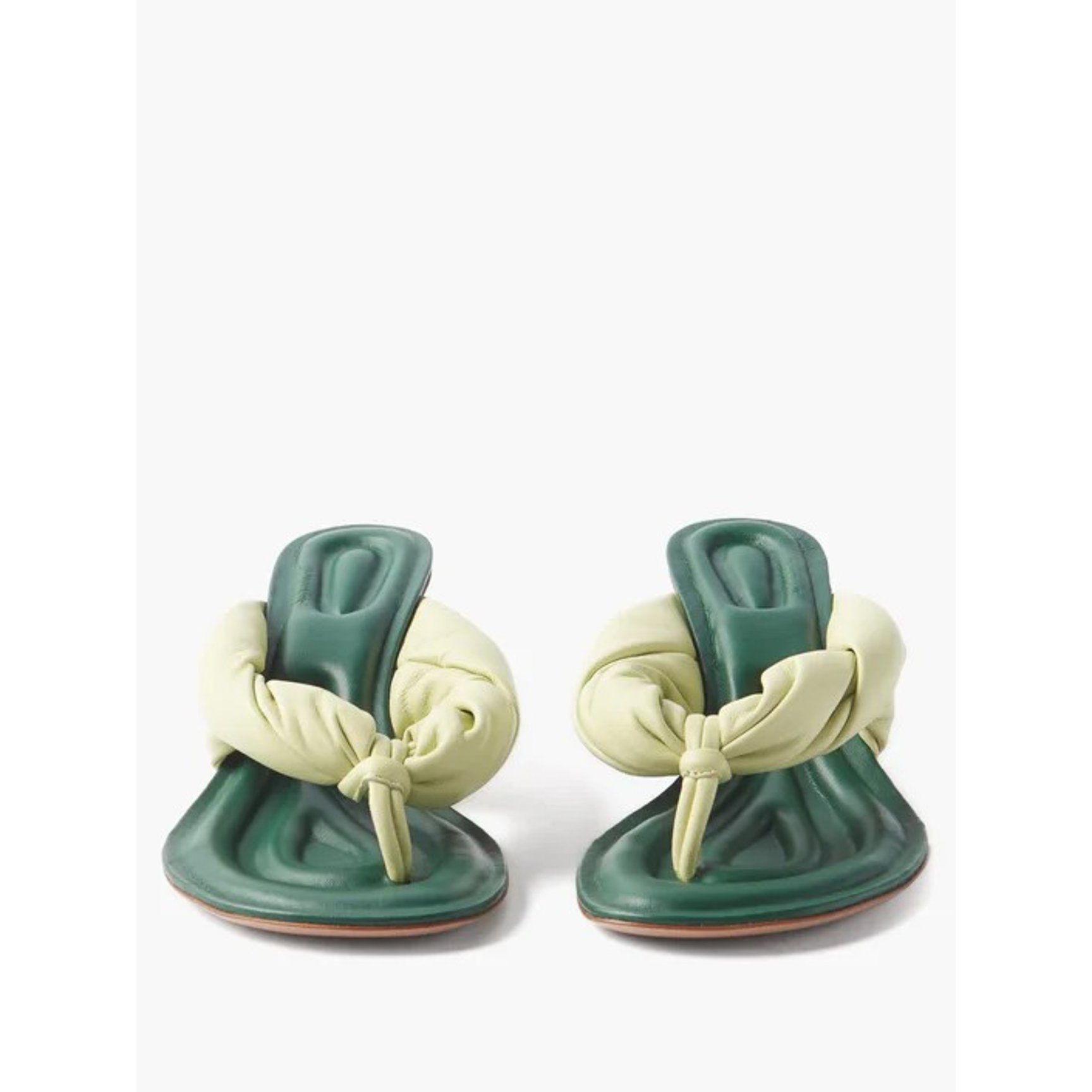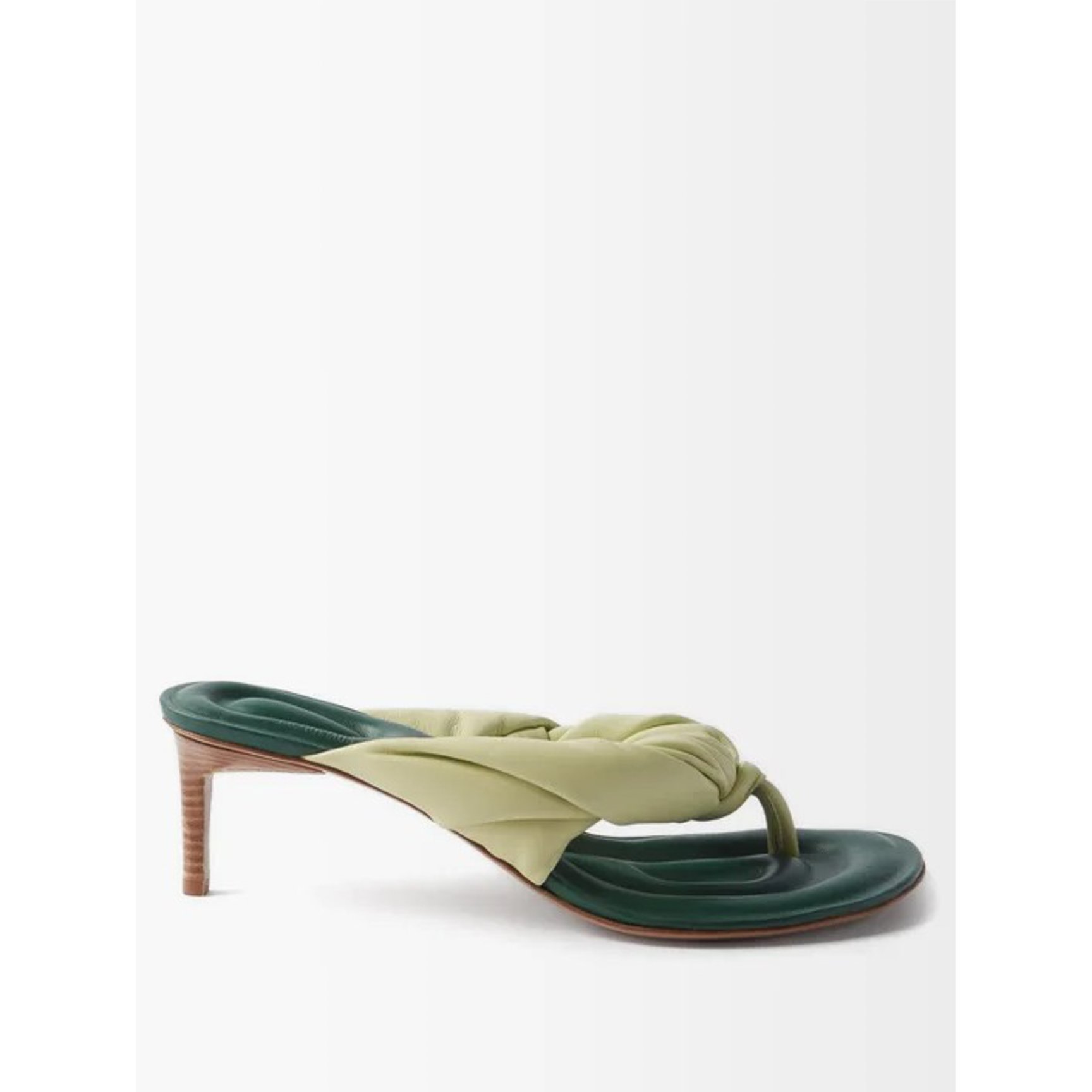 最後にご紹介するのは、カラーサンダルにモダンなディテールを加えた「ジャックムス(JACQUEMUS)」のトングサンダル。滑らかにねじれたツイストレザーストラップが、 ウッディなスティレットヒールと融合しナチュラルでおしゃれなムードを演出します。