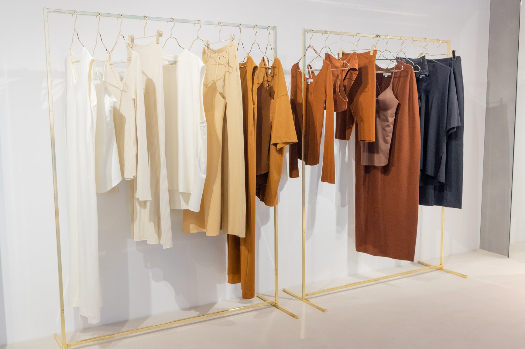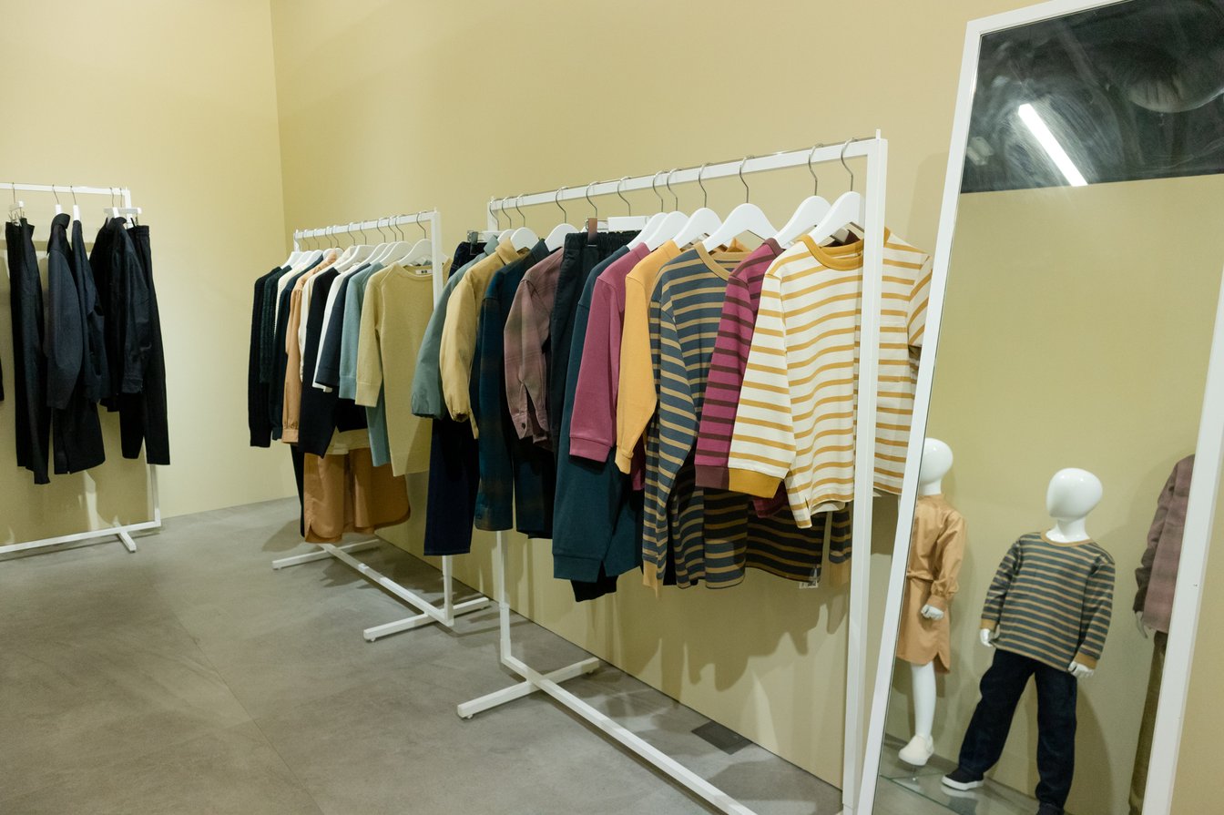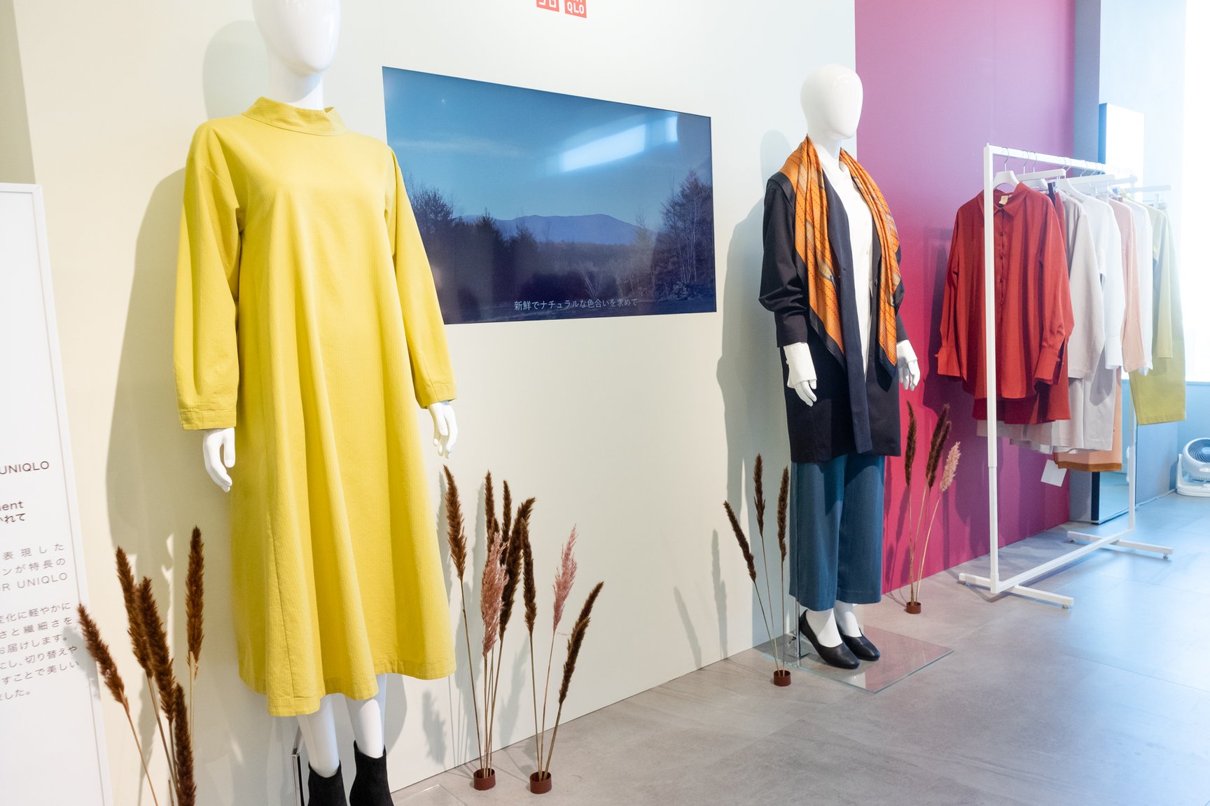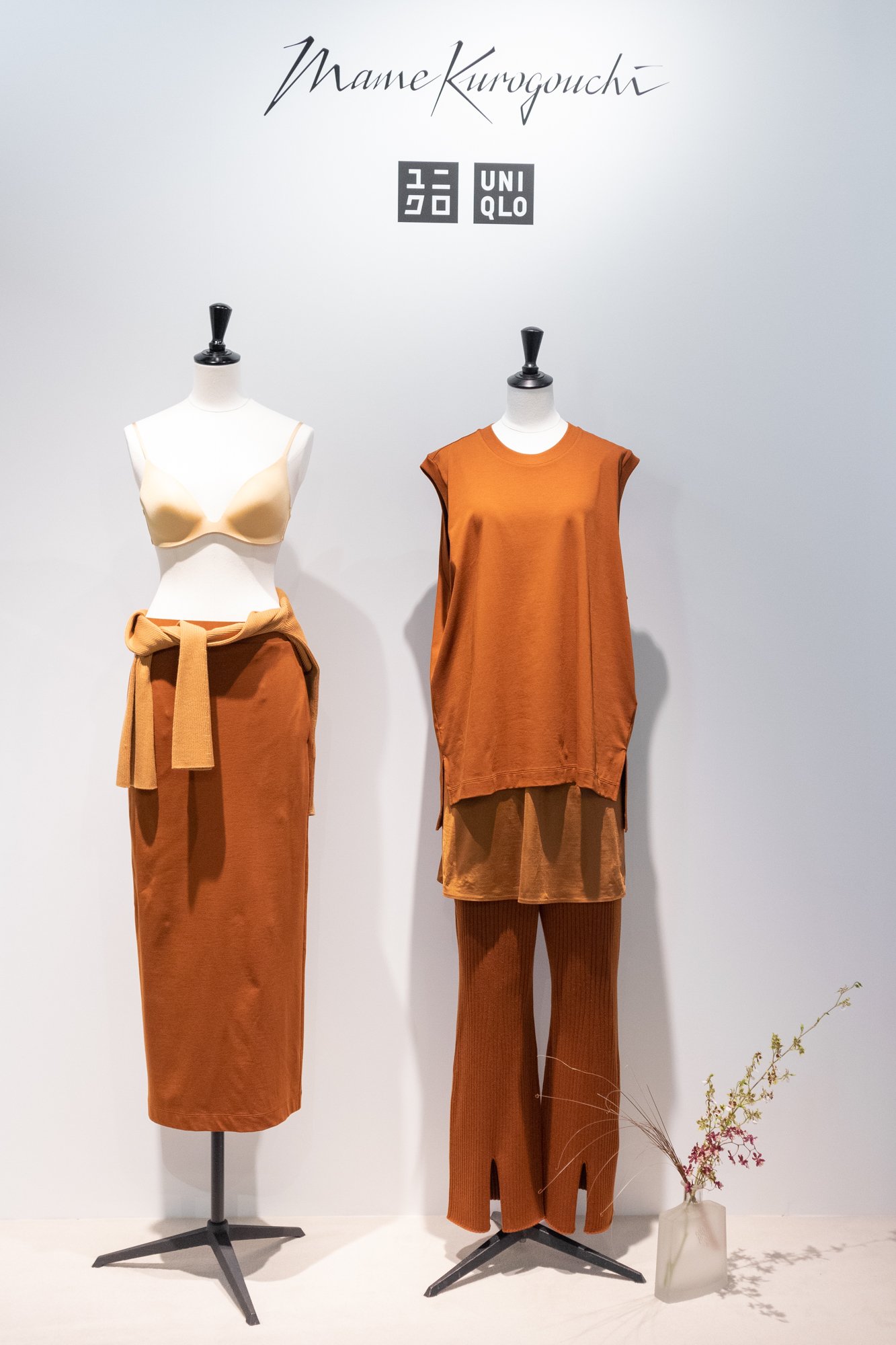 インナーウェアにフォーカスした「Uniqlo and Mame Kurogouchi」では、黒、白、ヘ?ーシ?ュ、フ?ラウンの様々なスキントーンに合うベーシックカラーでアイテムを製作。ブラウンやベージュの中でもトーンが様々で、繊細なカラーバランスがよりアイテムの魅力を引き立てていました。