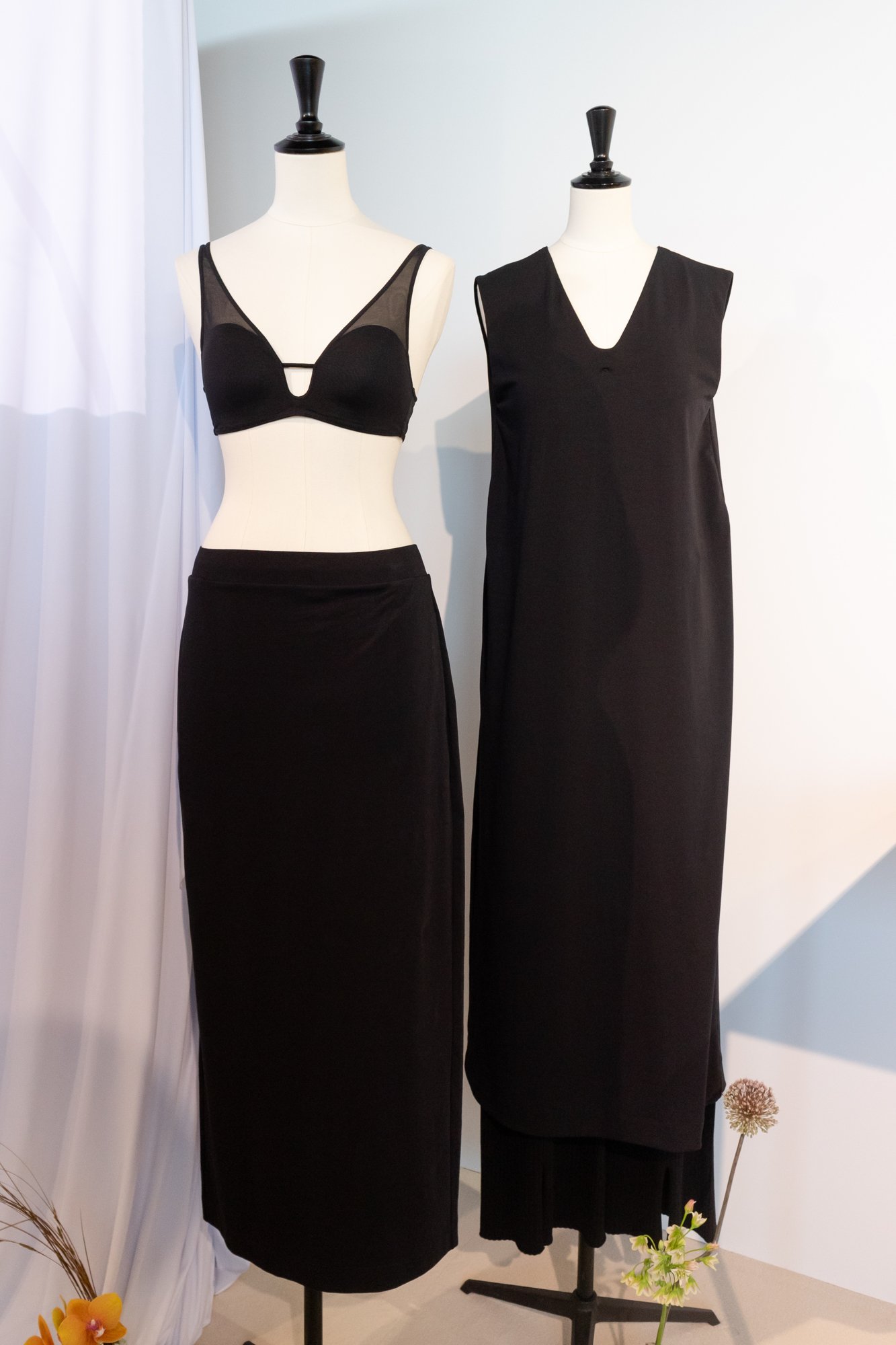 テーマの「下着と服の境界線をホ?ータ?レスに」を体現しているブラスリップとブラキャミソール。下着としての機能性を保ちつつ、レイヤードなどで服の下から見えることも考慮してデザインされたアイテムで、ファッション業界人からの注目も集めているそうです。