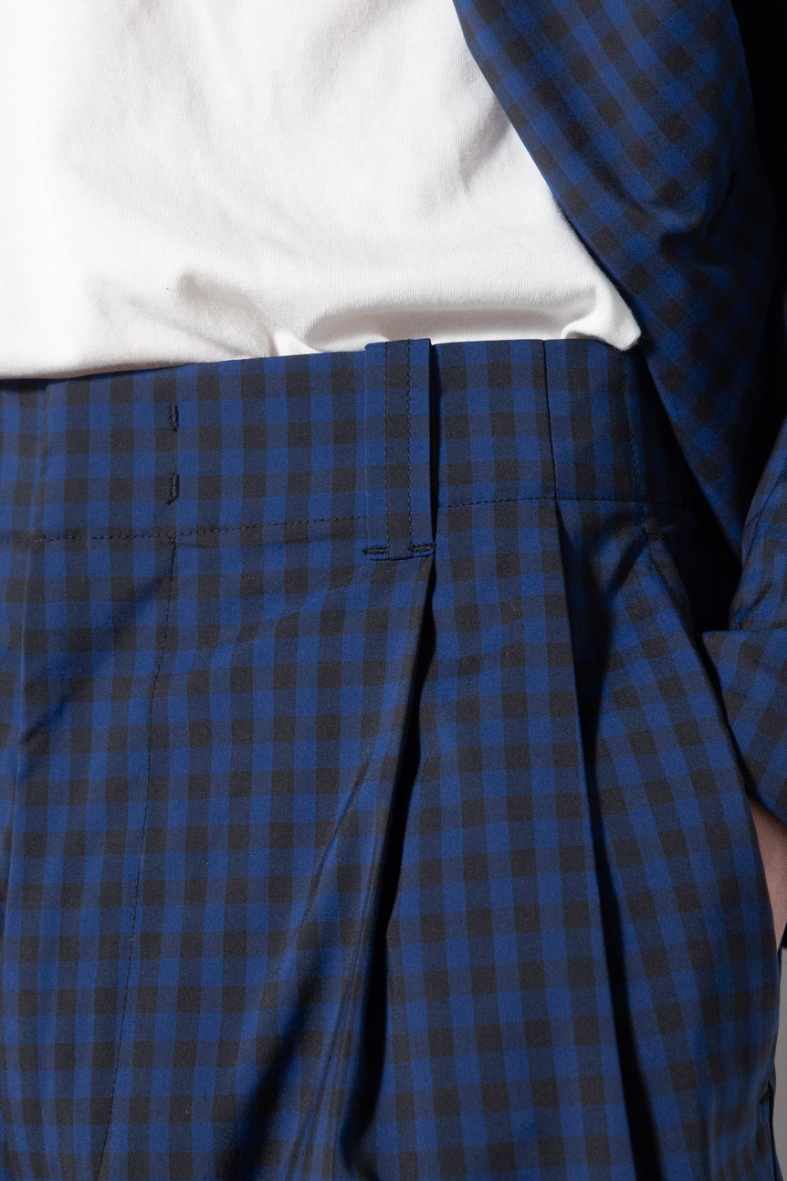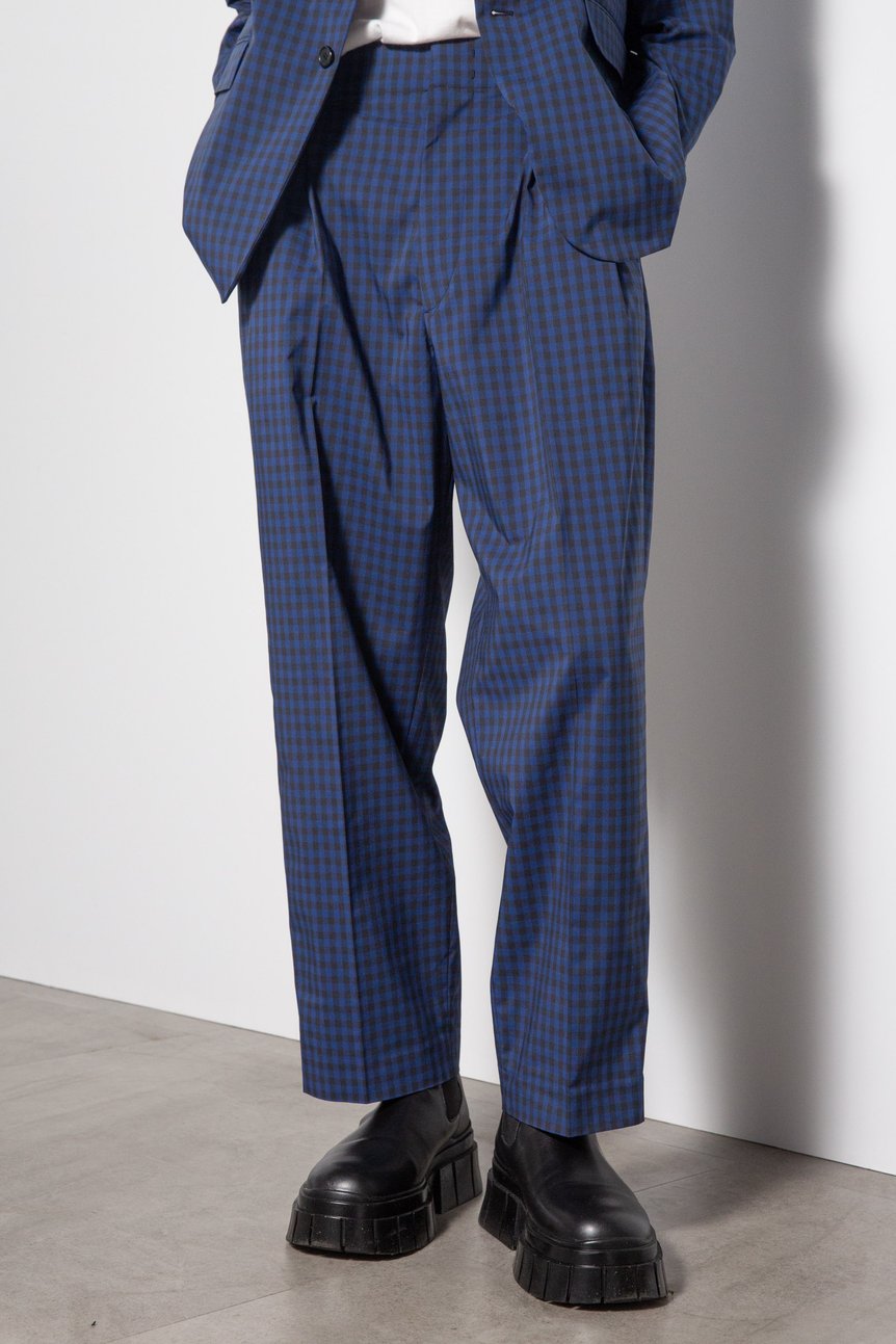 メンズで最も人気なのは、アンケートで「絶対にワイドフィットタックパンツでお願いします!」と熱烈な要望もあったワイドフィットタックパンツ。「テーラード ジャケット」とのセットアップでも提案しているため、合わせて着用してみました。無地の「57 OLIVE」と「68 BLUE」、コラボオリジナルのチェック柄の「42 YELLOW」と「67 BLUE」の4色展開で、今回は無地の「68 BLUE」とチェック柄の「67 BLUE」のXLサイズを着用しています。素材はそれぞれ異なり、無地はジャケットとパンツ共にポリエステル100%。チェック柄はジャケットが表地ポリエステル54%と複合繊維46%、裏地ポリエステル100%、パンツがポリエステル54%と複合繊維46%で製作されています。