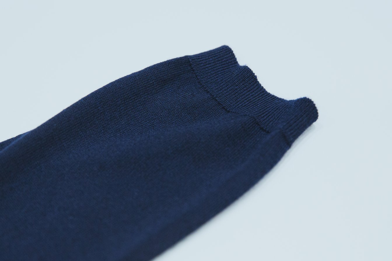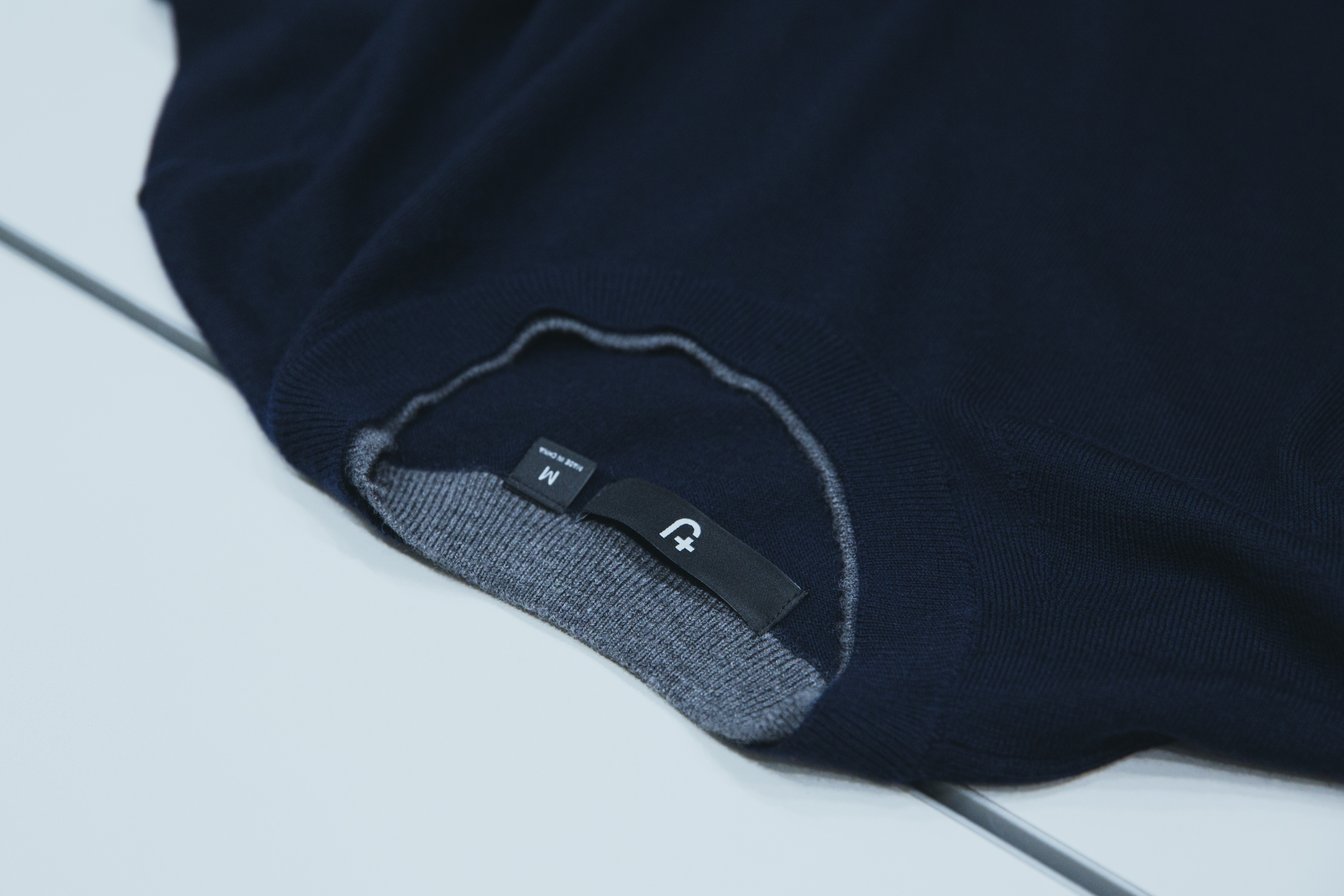 編集B:個人的には襟にラインがあるデザインはあまり好まないですが、これはさりげない感じです。ひとつ気になったのは、あまり見ない袖のリブの長さ。少し短めで、好みが分かれるポイントかもしれません。