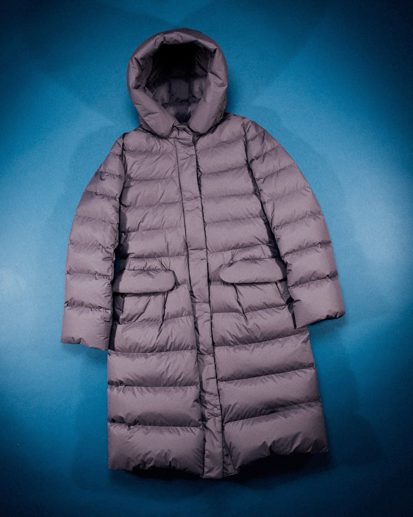 編集A:収納までしなくても、脱いだ時にまるめてもかさばらないのは良いんじゃないでしょうか。あと実は手洗いできる、というのがポイント高い。シルエットはウエストから下が軽いフレアですね。モコモコし過ぎるとミシュランマンみたいになる気がして苦手なので、このくらいソフトならコート感覚で着られそう。