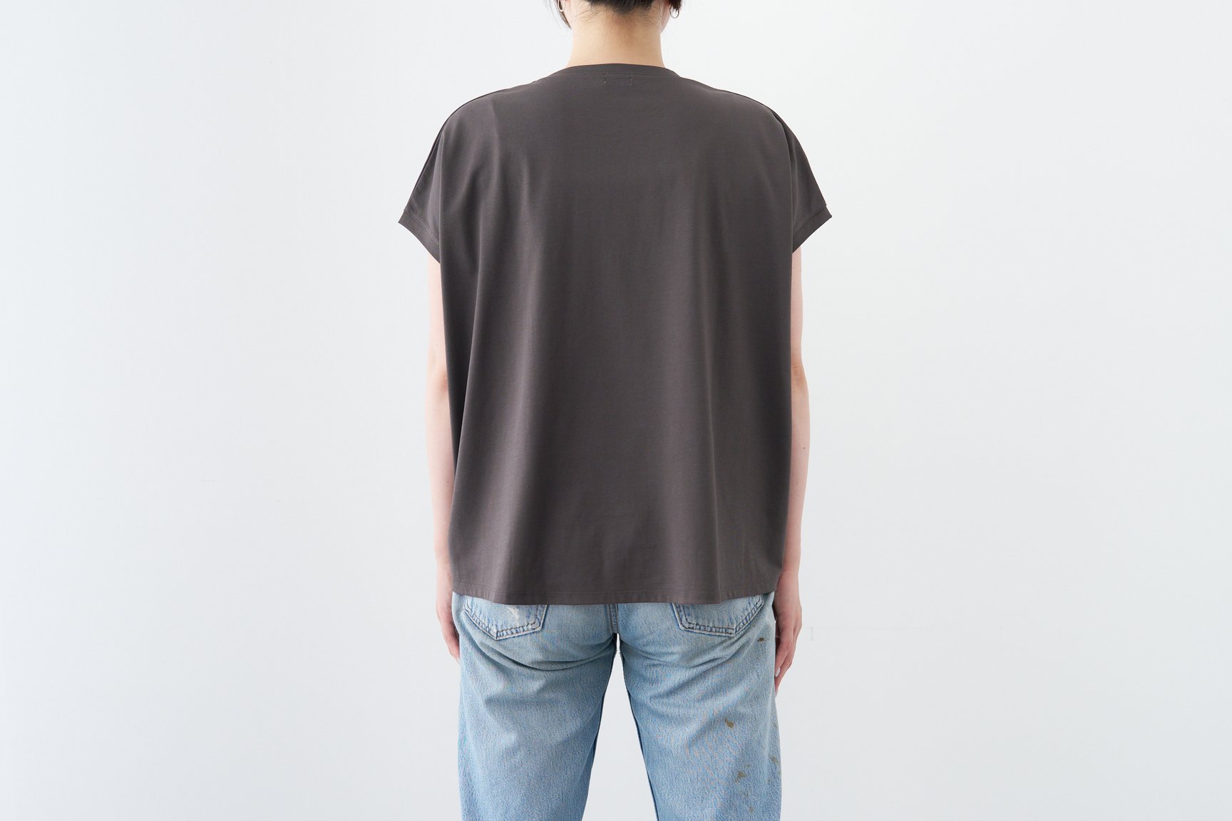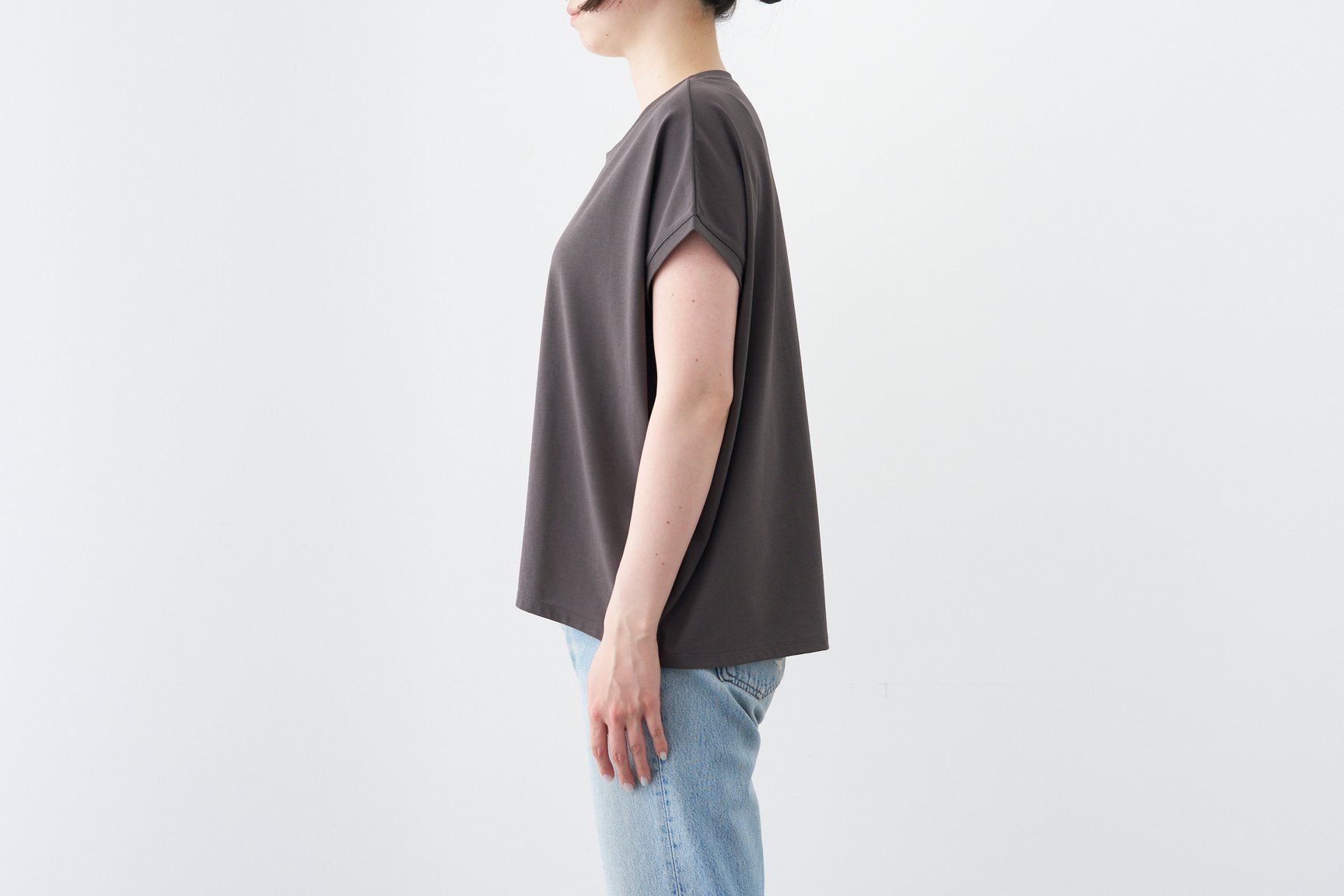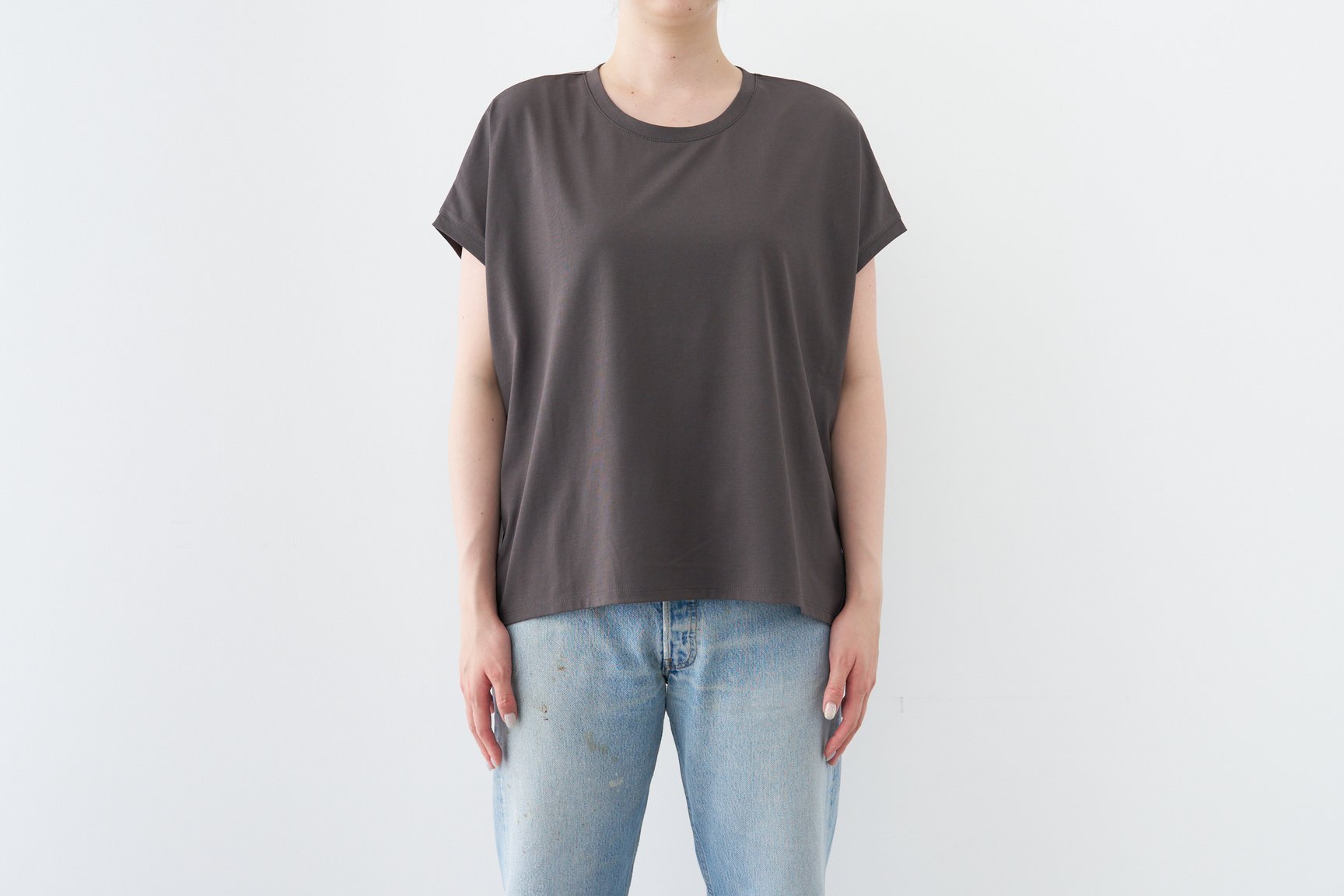 今回検証したTシャツは、オフホワイト、チャコール、ライトグレーの3色展開で、サイズはMサイズのみ。身長170cmの編集部員が着用してみると、身幅が広めで着やすく、全体的にゆったりとしている印象。ヒップが程よく隠れる丈感も女性にはうれしいデザインです。ドルマンスリーブの特性上、腕を上げると脇がやや大きく開くデザインなので、インナーの見え方には注意が必要ですが、それも含めて「大人が一枚でもおしゃれに着られるTシャツ」といえるでしょう。