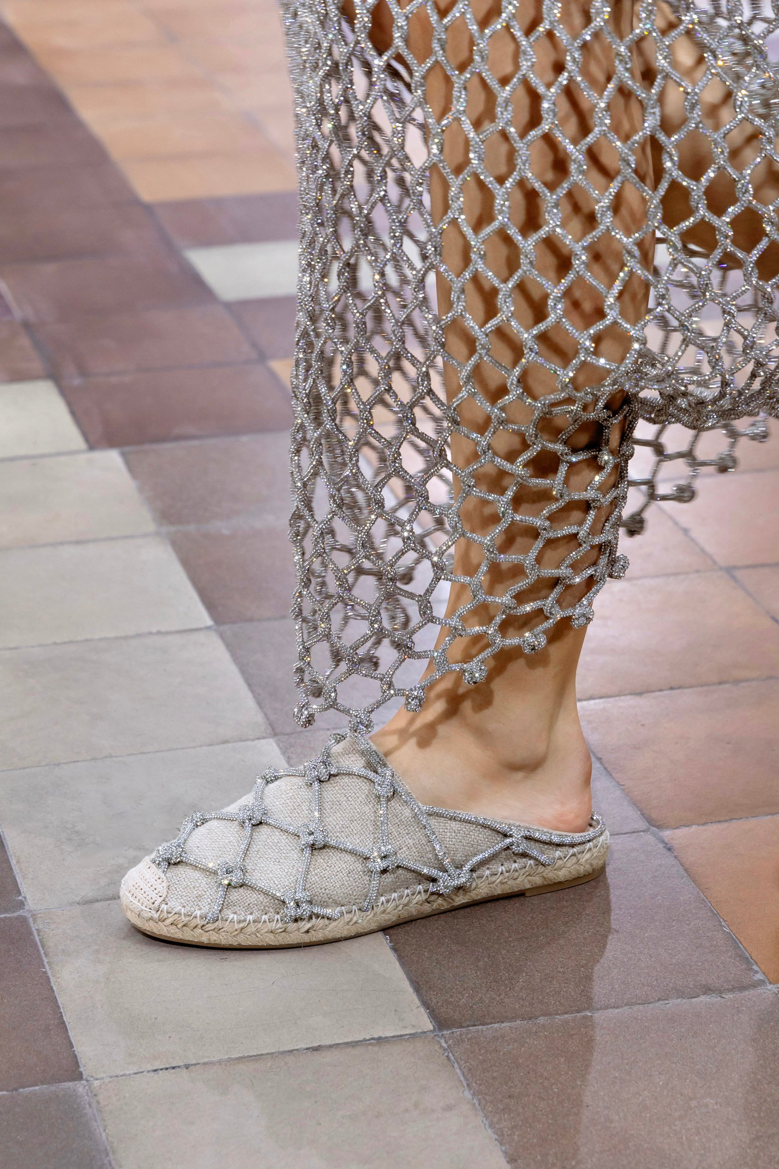 アクセサリー類でも女性の自由を強調したといい、動きやすさを確保するためシューズのヒールは1cmに満たないほど低く設計。ヴァレンティノ ガラヴァーニ V ロゴ ムーン バッグはしなやかに体になじみ、楕円形の「V」があしらわれたチェーンが手首を包むようデザインされている。