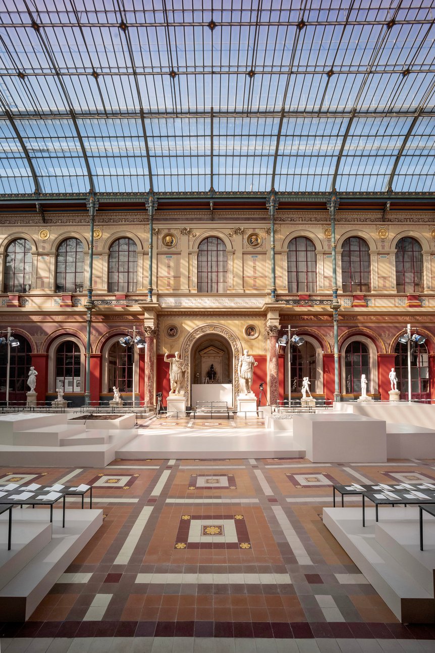 「自然な状態として存在する裸」となるために、ピッチョーリが見出した答えは肌そのものをファブリックにすること。学校を意味する「レコール」と題した2024年春夏コレクションは、彫像が並ぶパリの国立高等美術学校エコール?デ?ボザールで行われたわけだが、ファーストルックをはじめ随所に彫像のような服が登場した。これは、ヴァレンティノが名付けた新しいテクニックだという「アルトリリエーヴォ(高浮き彫り)」によって生み出されたもので、細かい布のパーツを手作業で立体的に縫い、縫い目も極力なくすことで彫像のようなフォルムに仕上げている。アダムとイヴがイチジクの葉をつなぎ合わせて恥部を隠したことのメタファーか、モチーフにはハイビスカスやイチジク、ハトなどを選び、それにより肌の露出によって完成する衣服を作り上げた。アダムとイヴが知恵の樹の実を食べ、裸でいることに羞恥だけを覚えたあの瞬間こそが身体の自然な状態なのだと言わんばかりに。