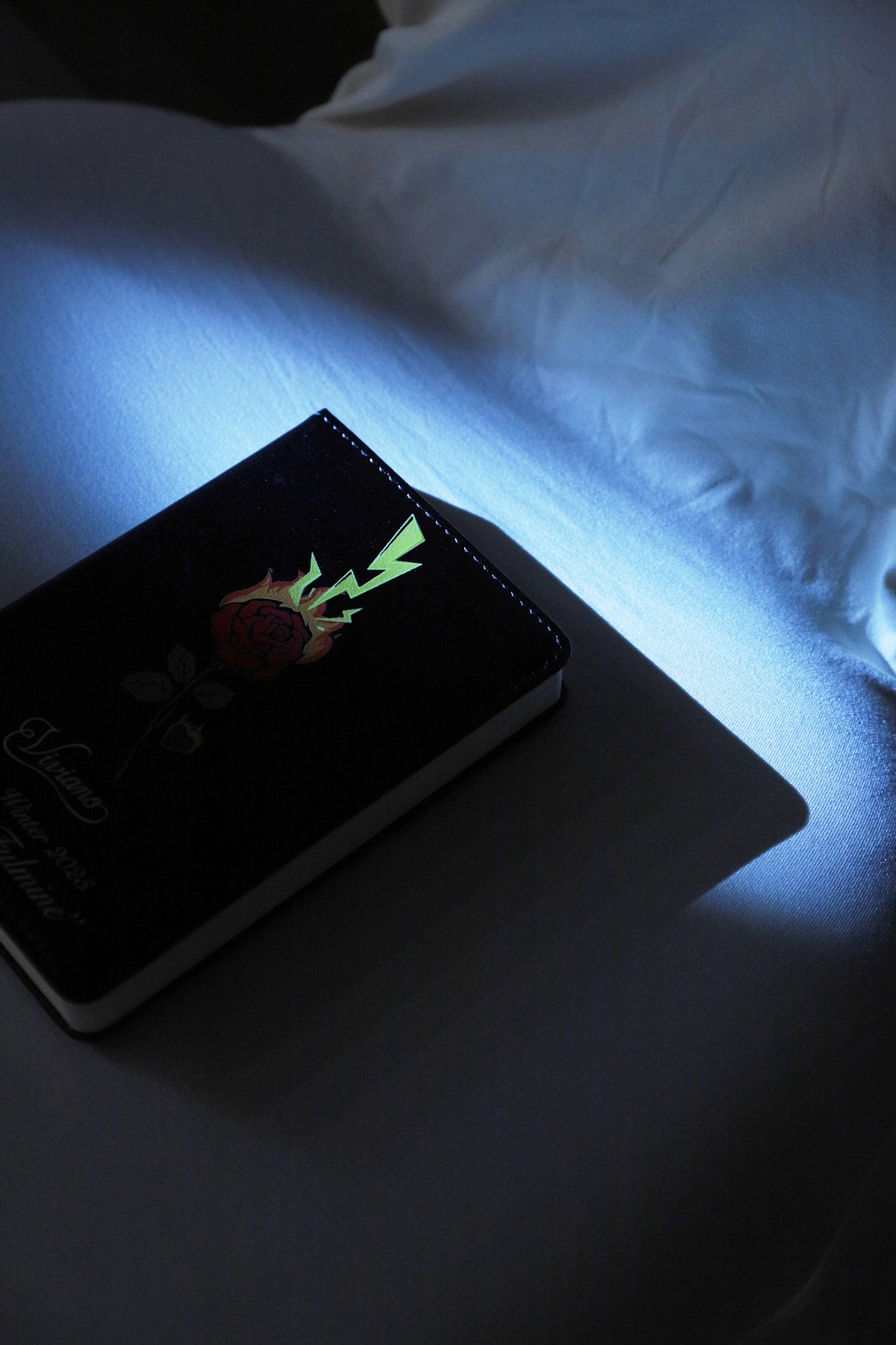座席には稲妻に打たれた薔薇が描かれたノートがお土産として置かれていた