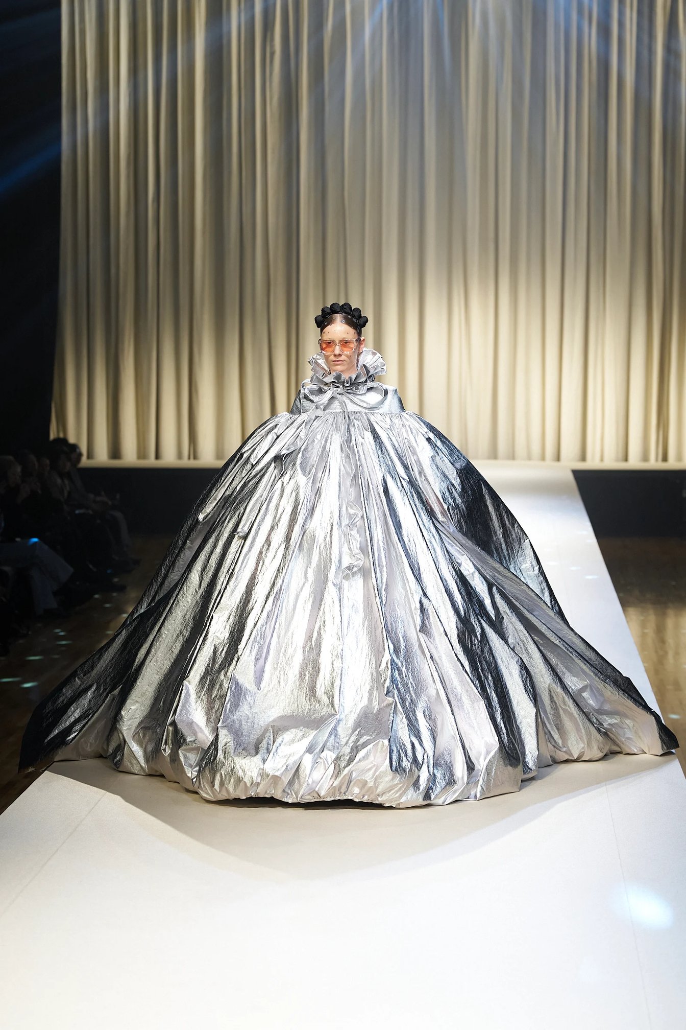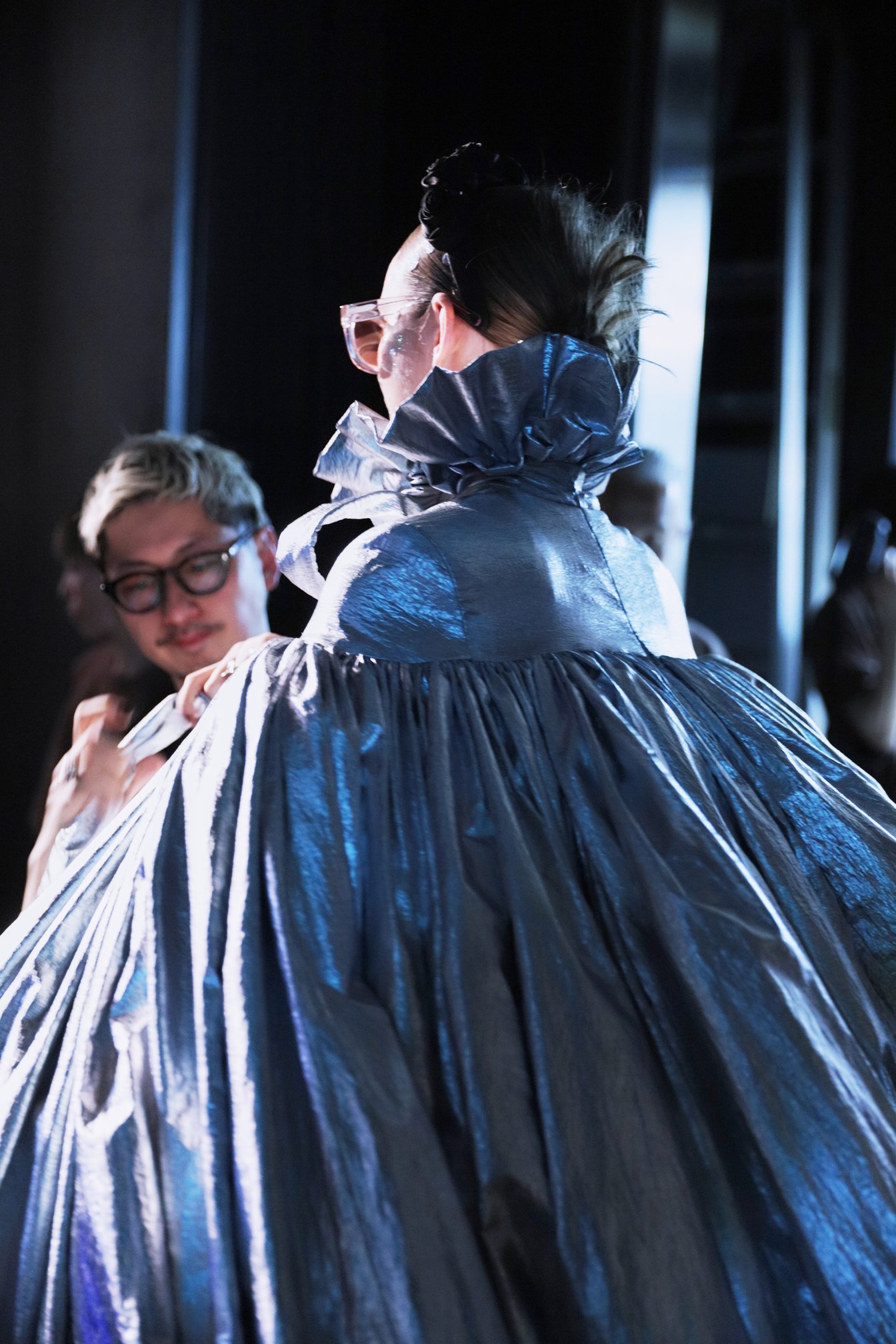 特にシルバーのドレスは、50メートルものオーガンザを贅沢に使用しており、ランウェイの床を覆うほど大きい。その迫力と同時に緻密な構造設計と繊細な素材によって、軽やかさも感じされる不思議なドレスだ。