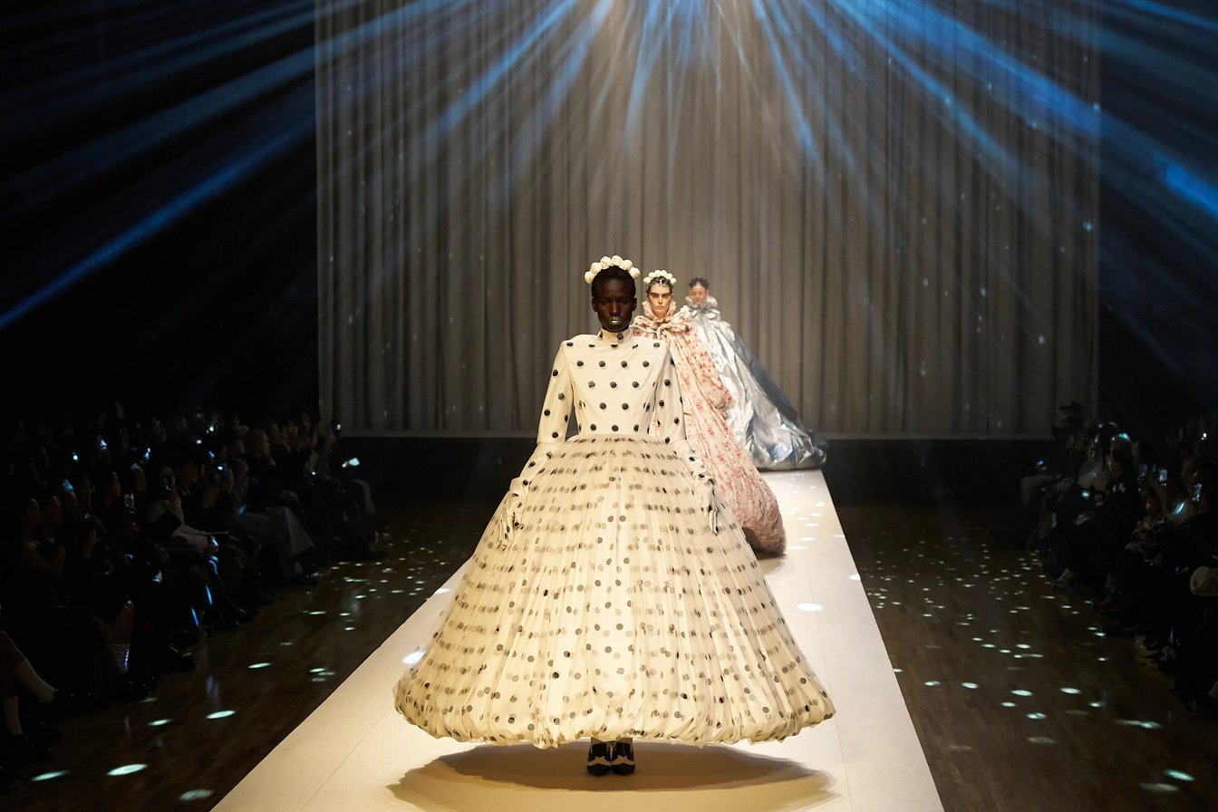 ショーのハイライトは、ラストに登場した3体の巨大なドレス。ドットと花柄、シルバーの3種類で、優美に膨らんだシルエットが大胆さと遊び心に満ちている。