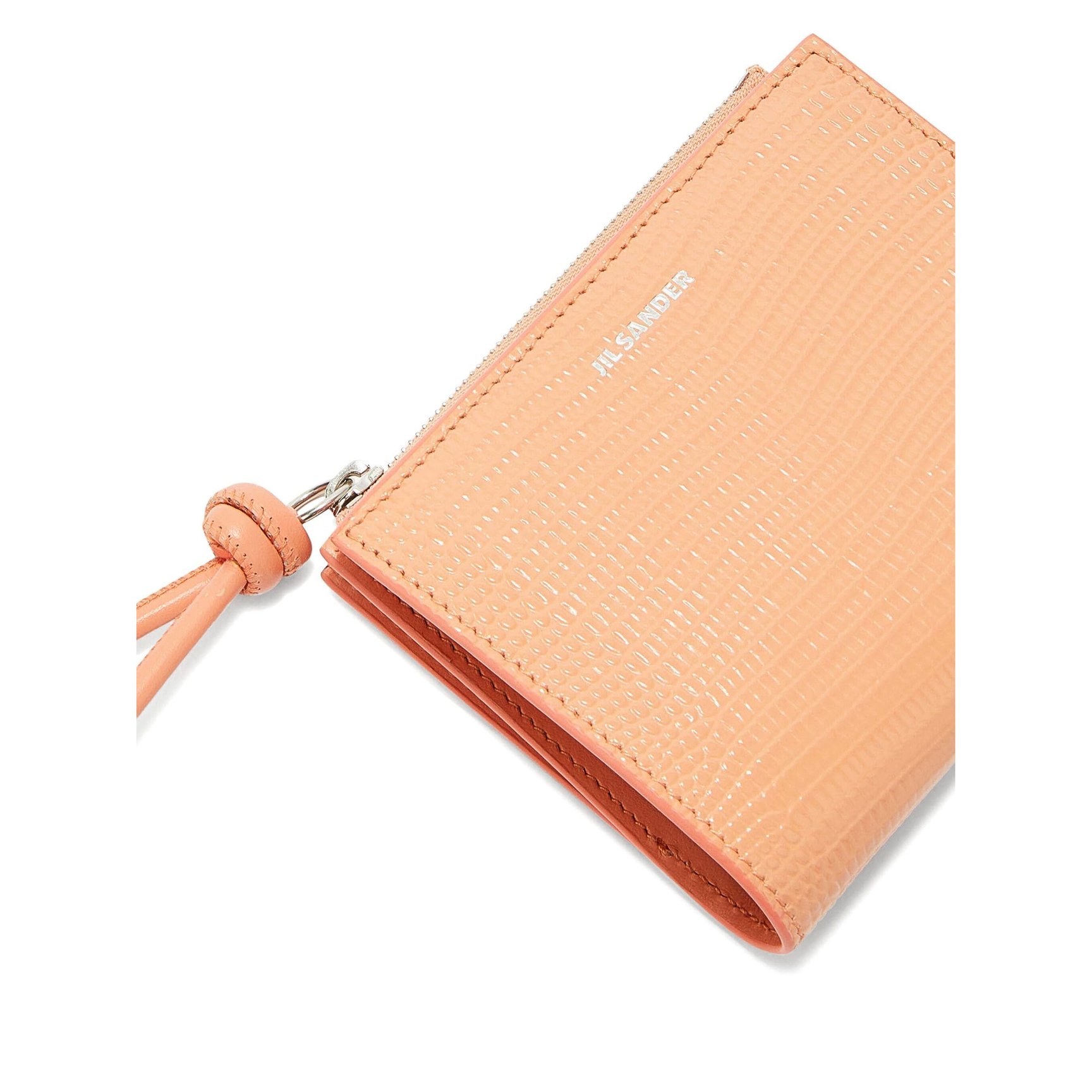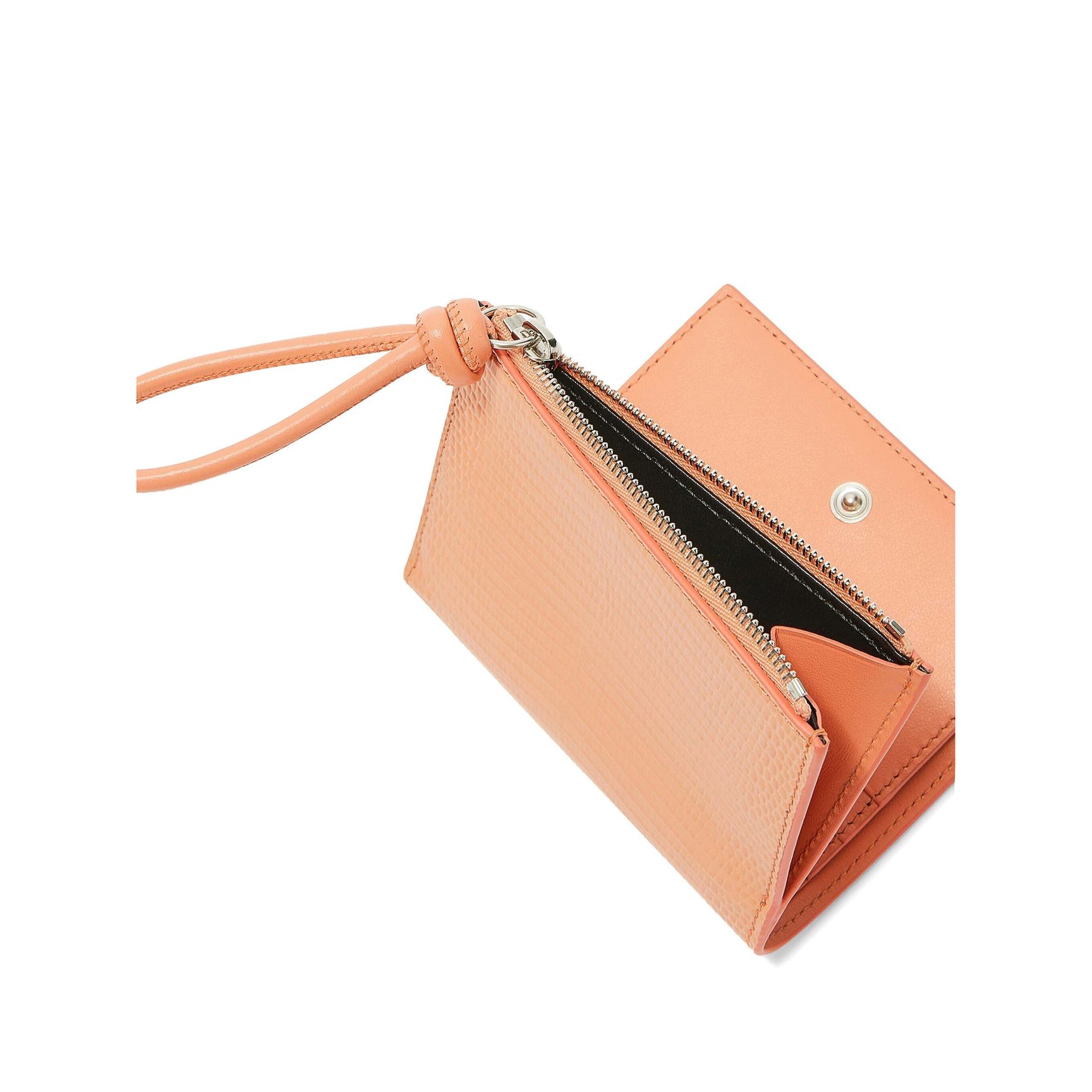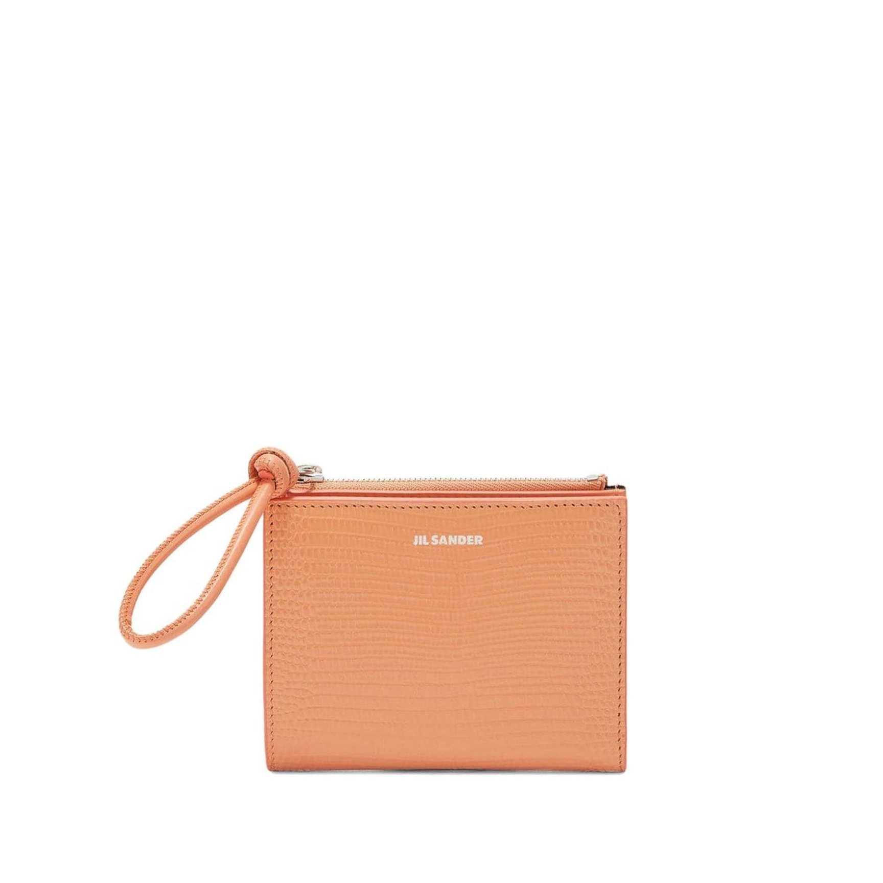 リザード柄の型押しレザーをフレッシュなピーチオレンジに染めた、「ジル サンダー(JIL SANDER)」の二つ折り財布。本体を開かずに使えるノット付きのコインポケットが使いやすい、内側に6つのカードスロットと札入れを並べたアイテムです。色違いには新緑を思わせるライトグリーンを展開。