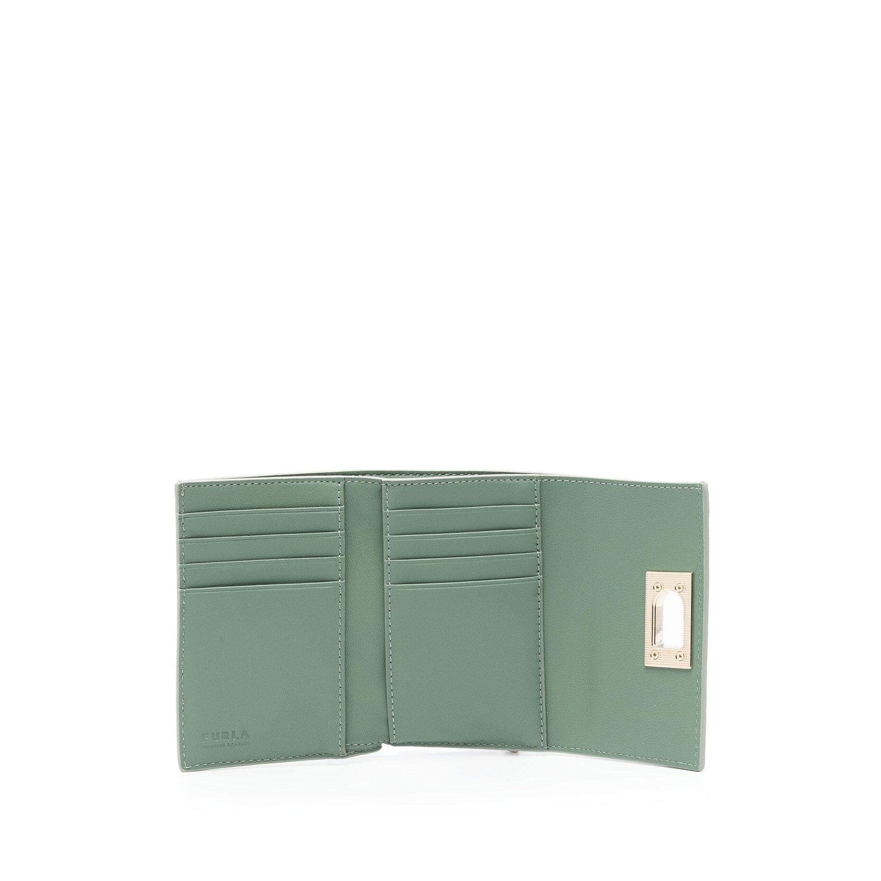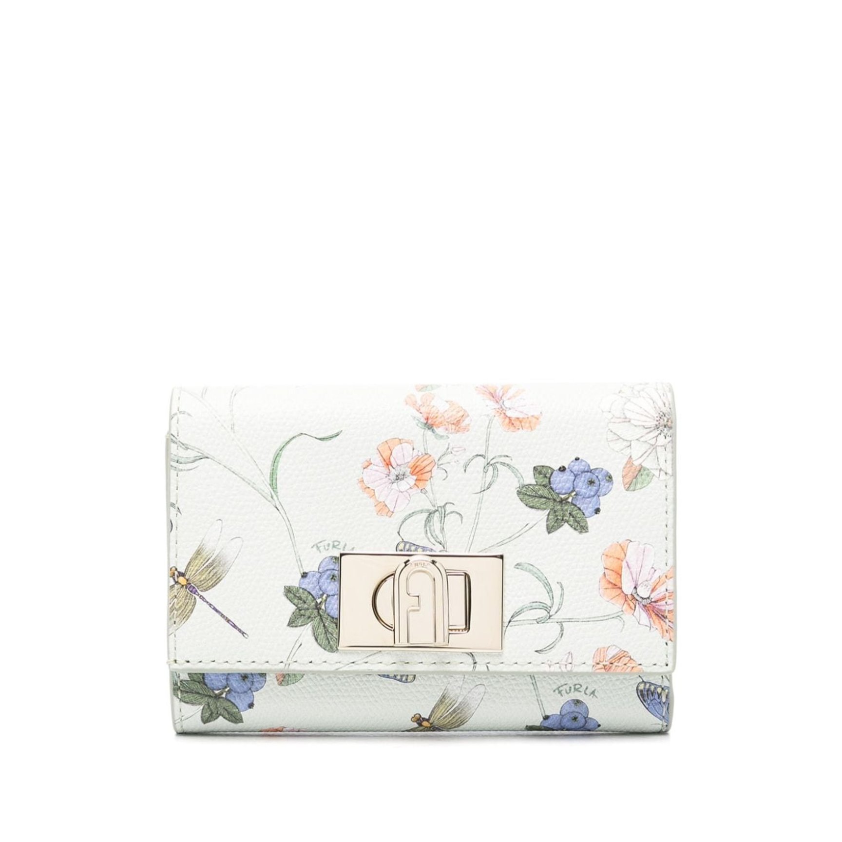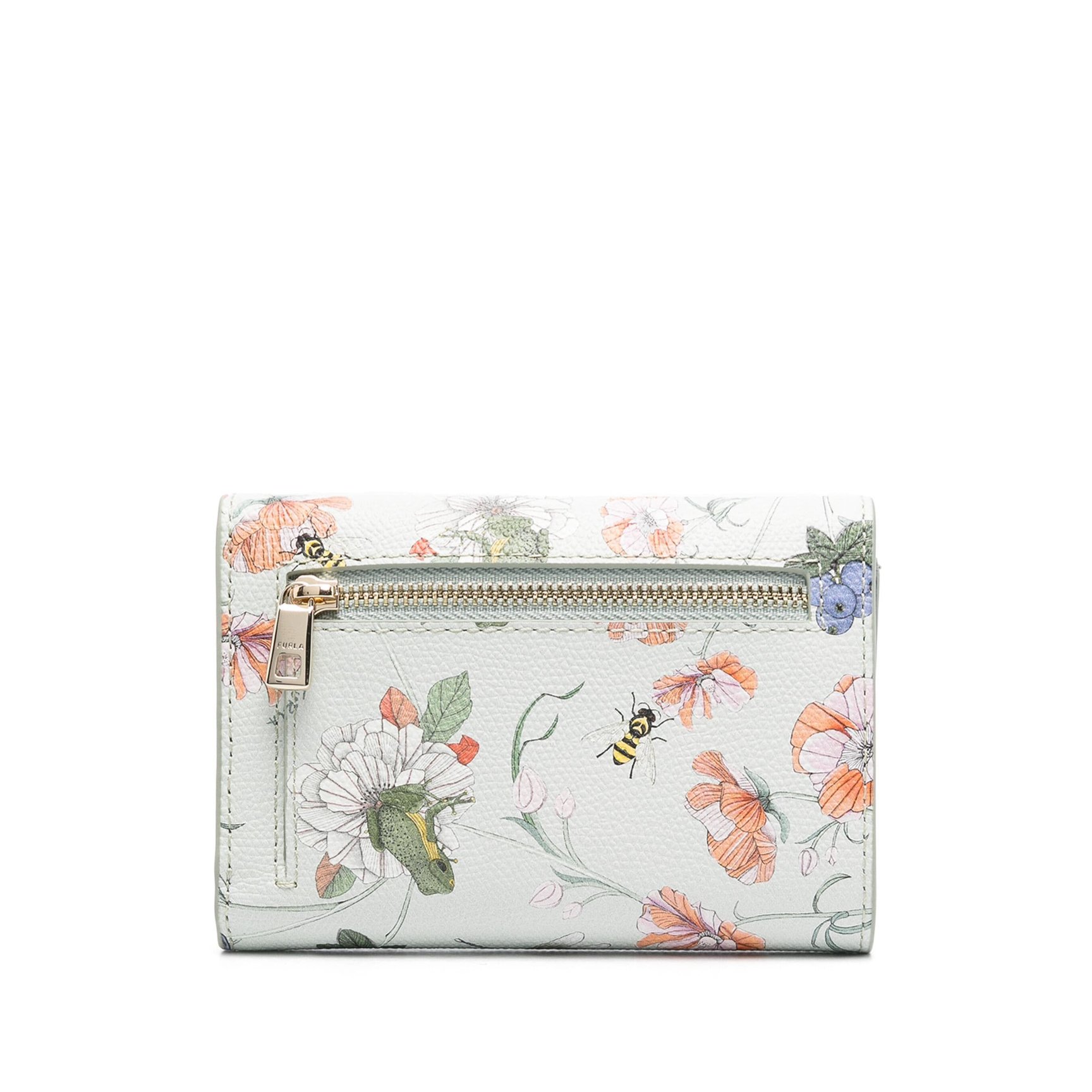春の息吹を感じるキュートな模様をプリントした、「フルラ(FURLA)」の三つ折り財布。フラップに光る刻印入りのツイストクロージャーを開くと爽やかなミントグリーンがお目見えする、札入れと8つのカードスロット&2つのサイドポケット、背面にコインポケットを配した機能的なモデルです。