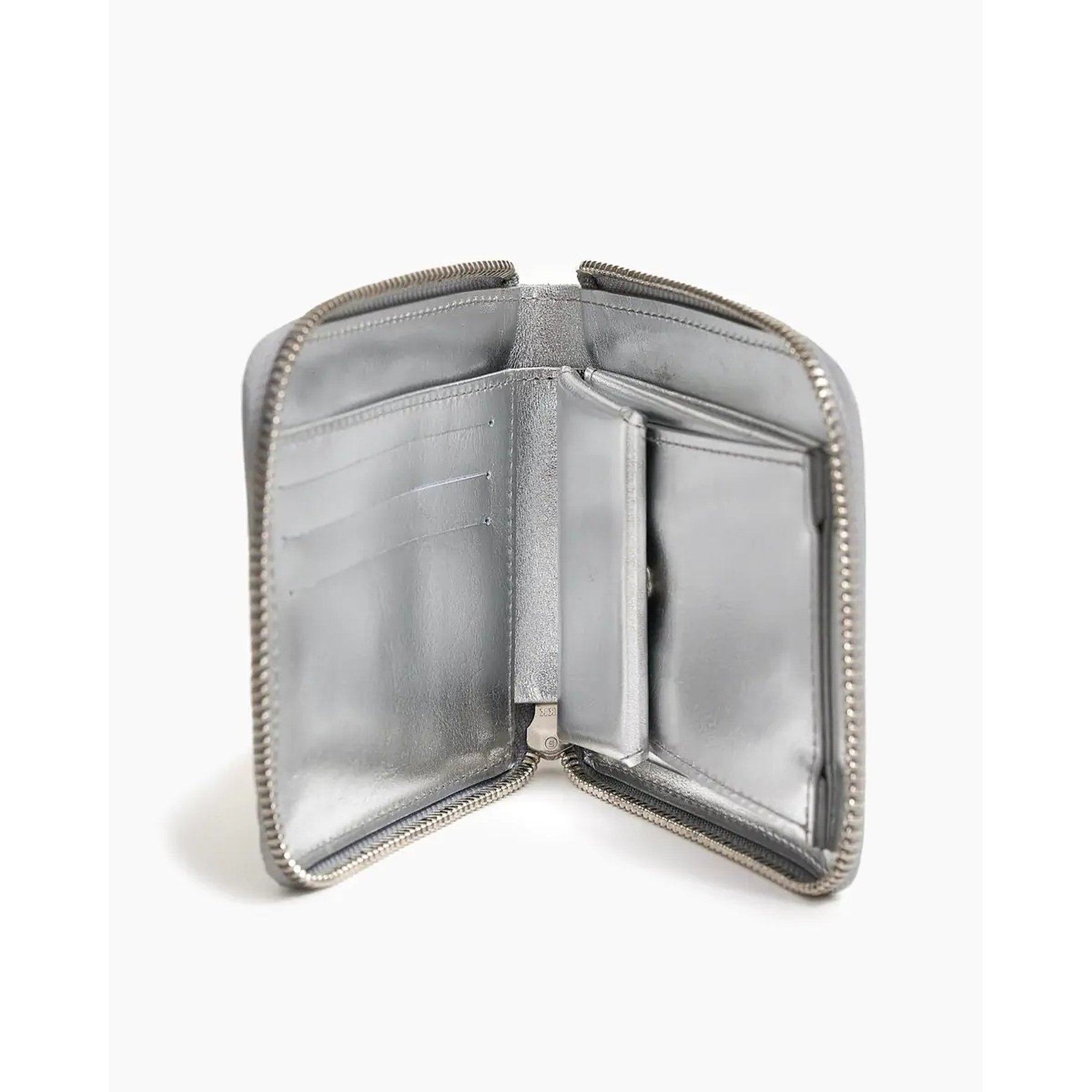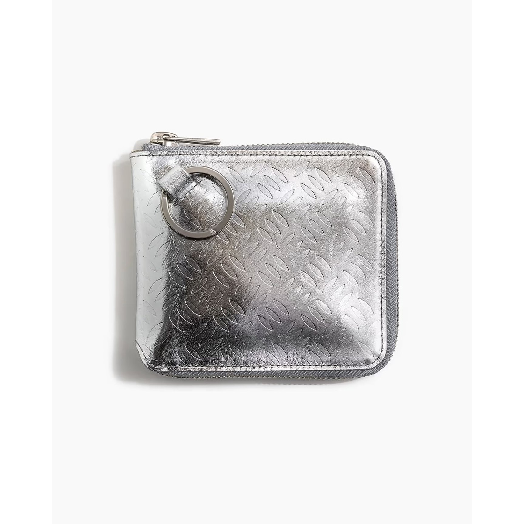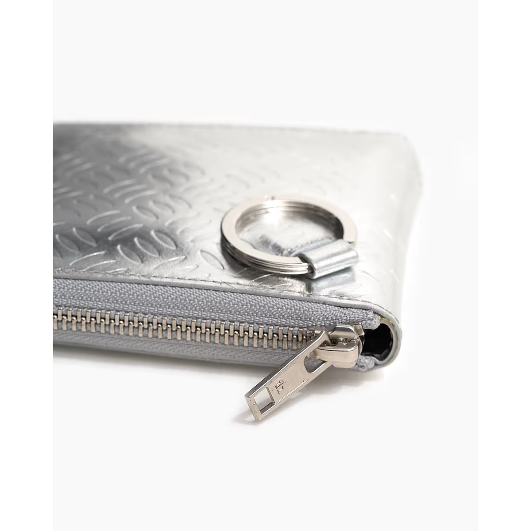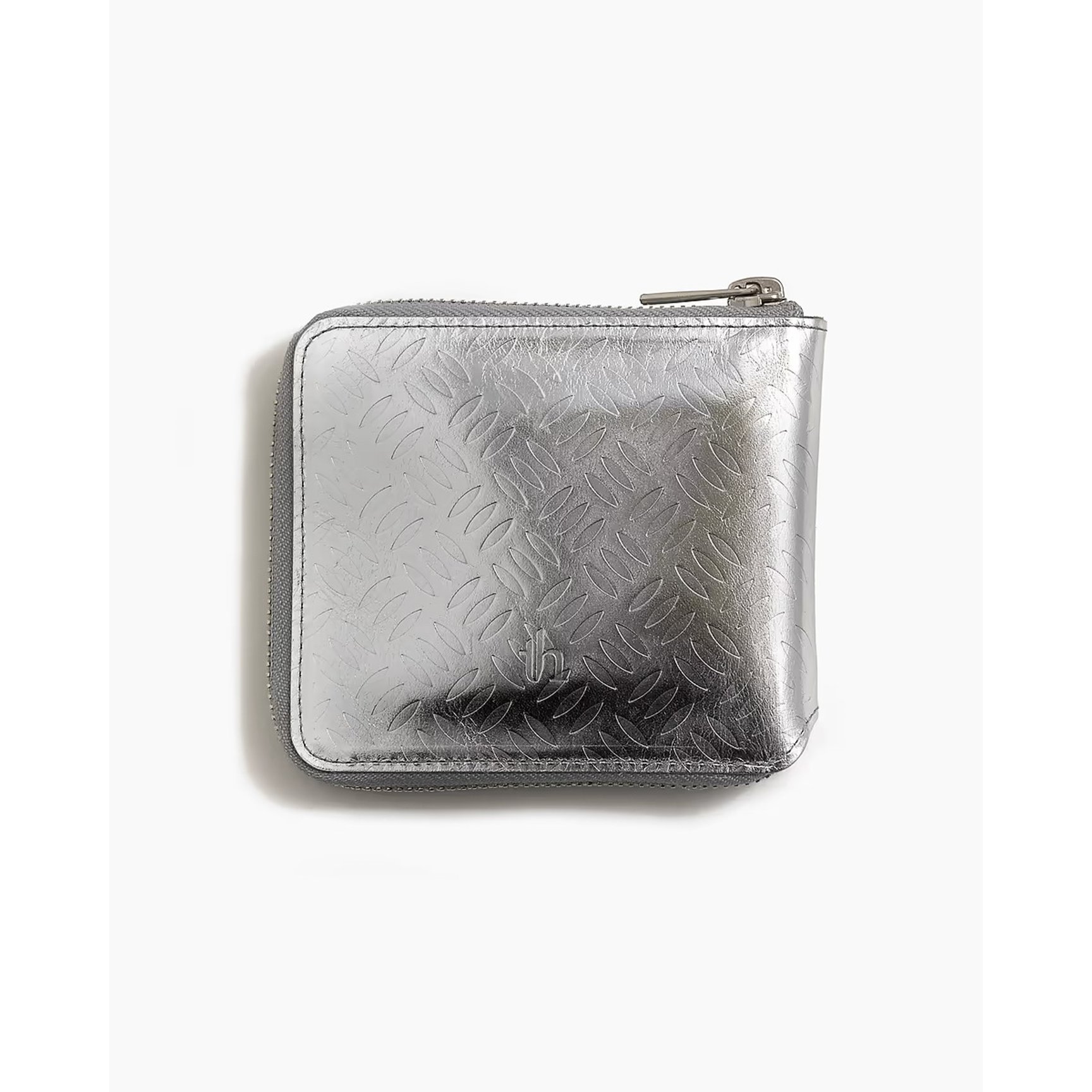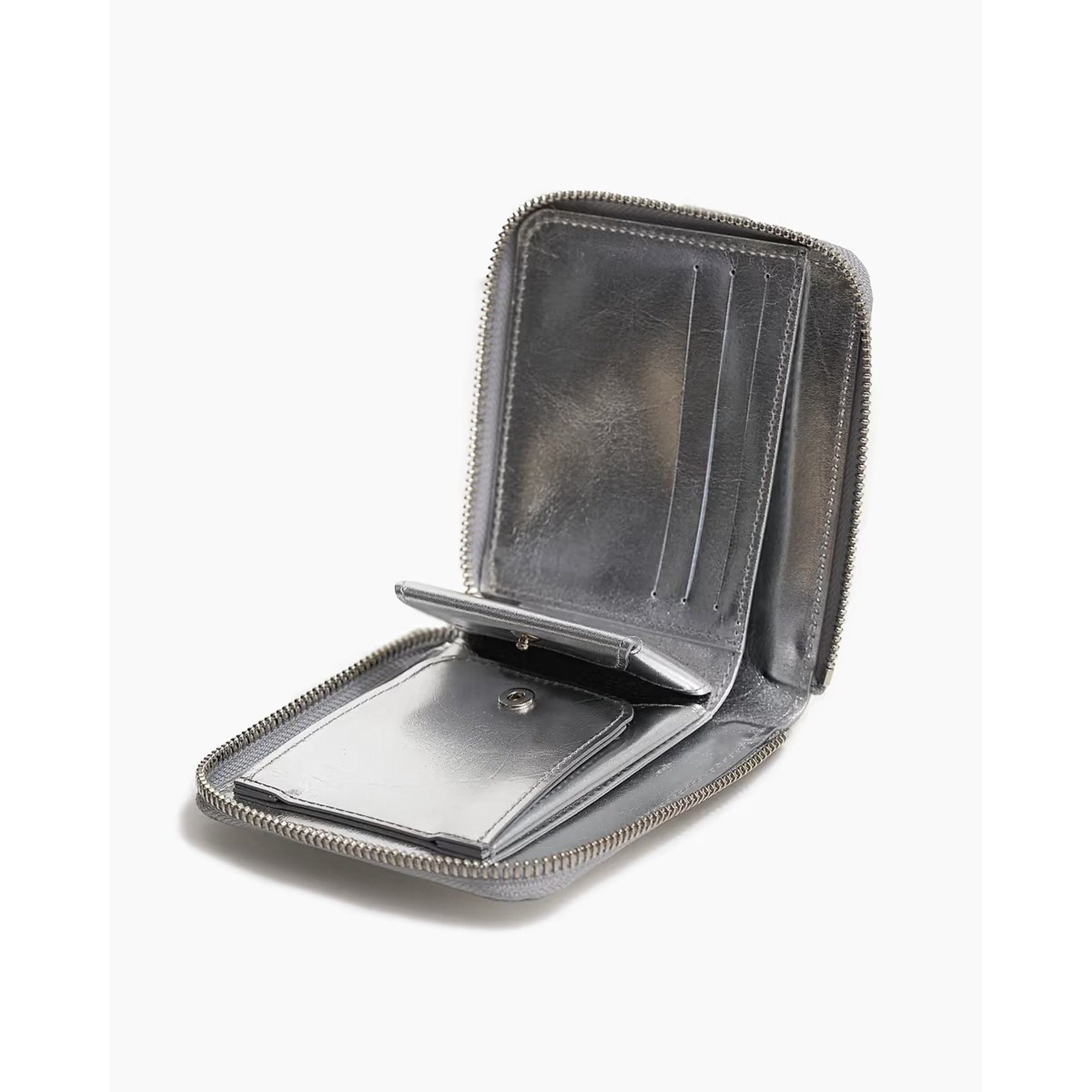 シルバーの箔を圧着した眩いレザー素材に魅了される、「ティーエイチ プロダクツ(th products)」の二つ折り財布。札入れとコインポケット、3つのカードスロットを包み込む安心感のあるジップアラウンドデザインで、別売りのキーネックレスを連結すると首から下げての持ち運びも可能です。