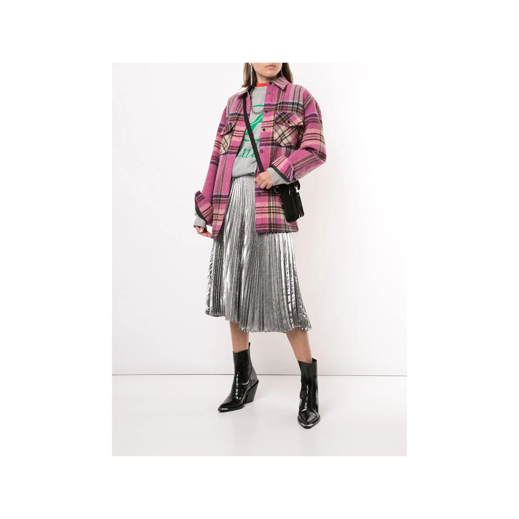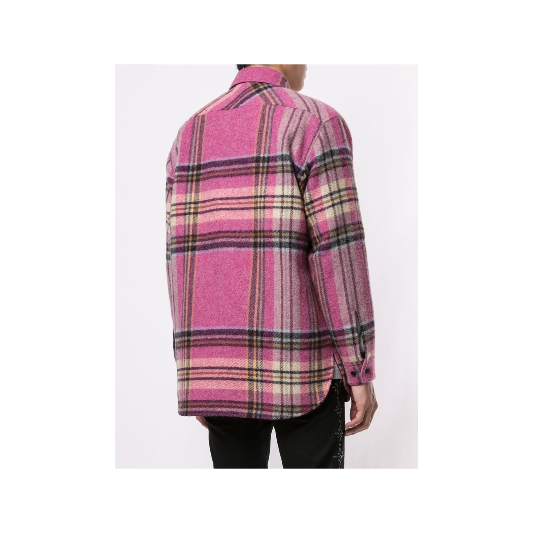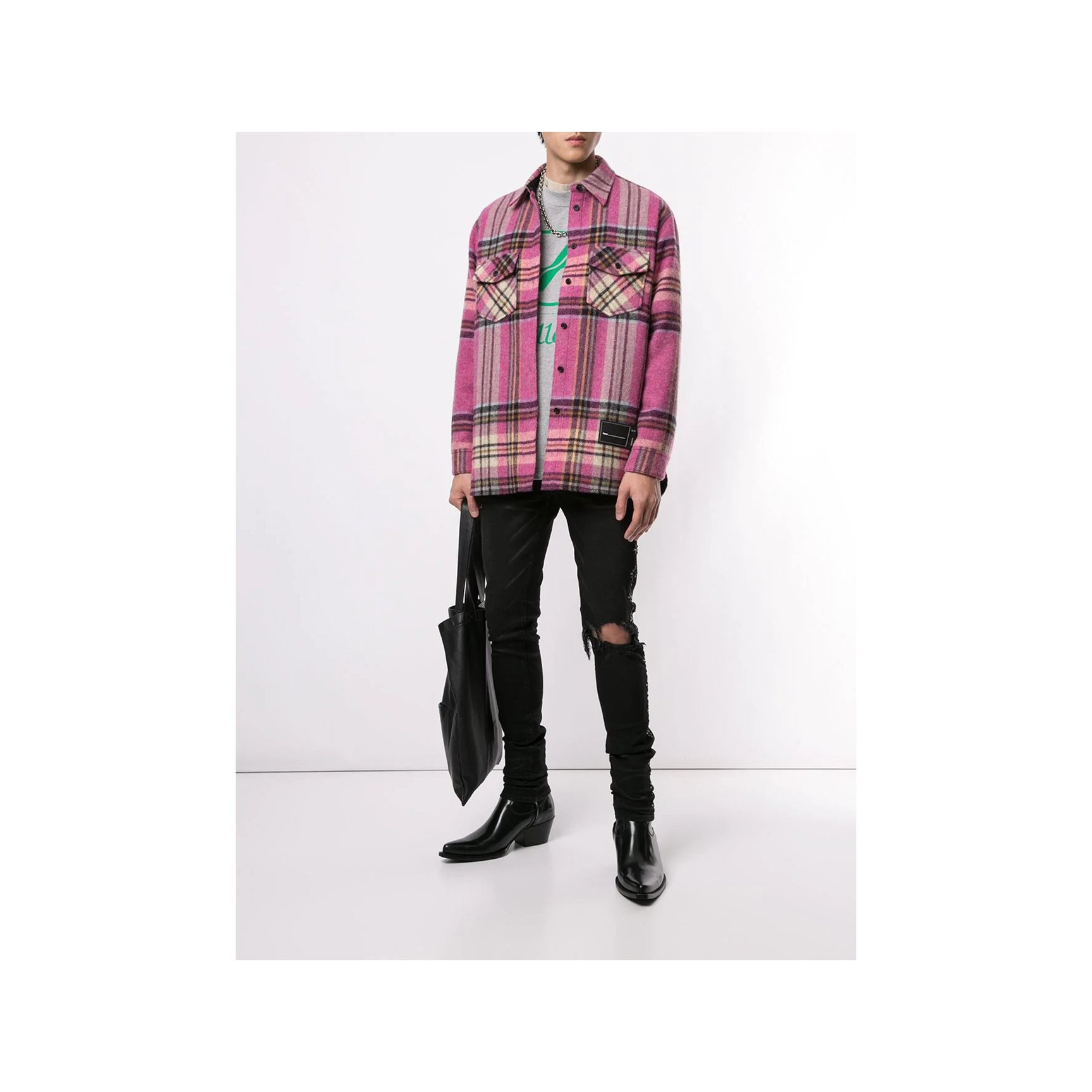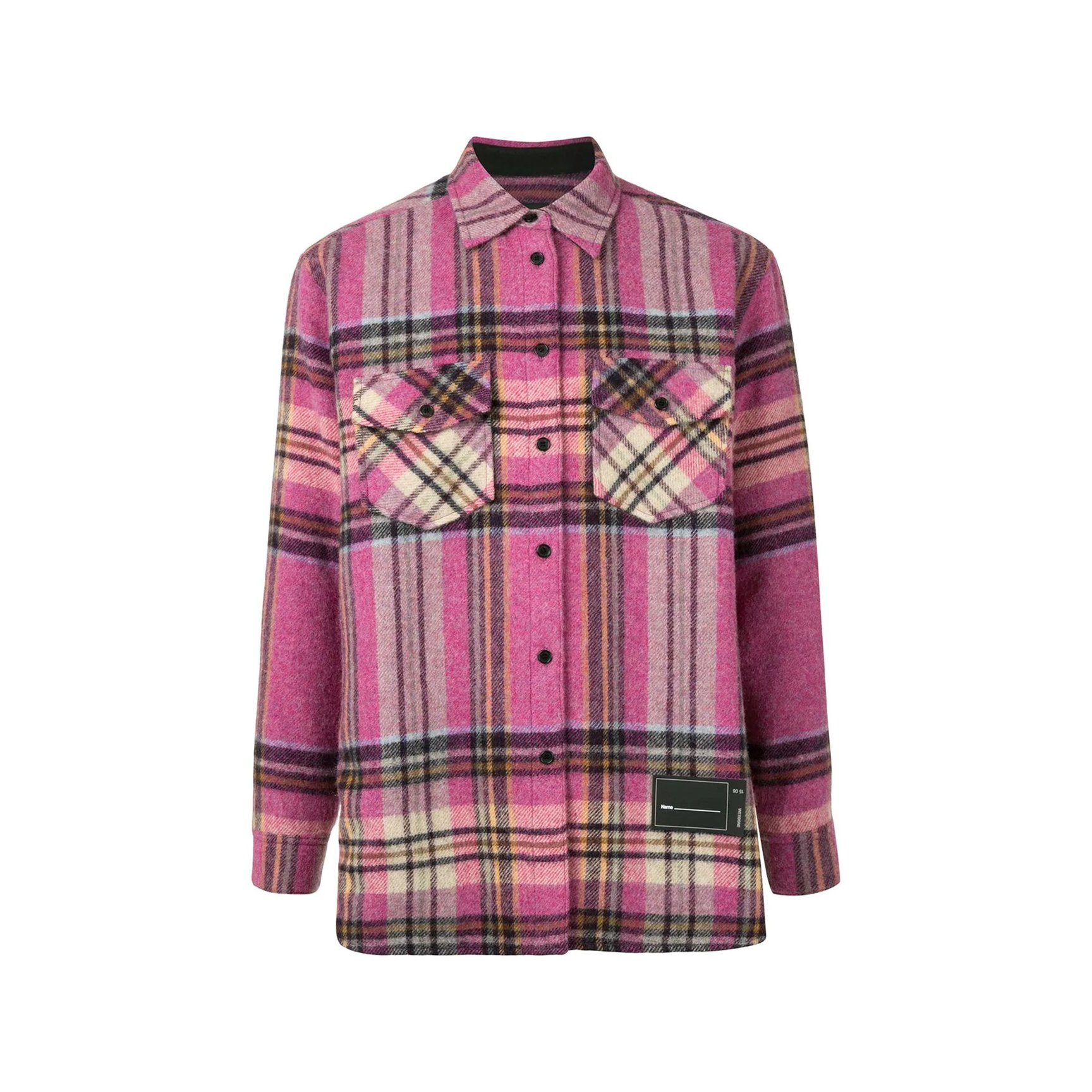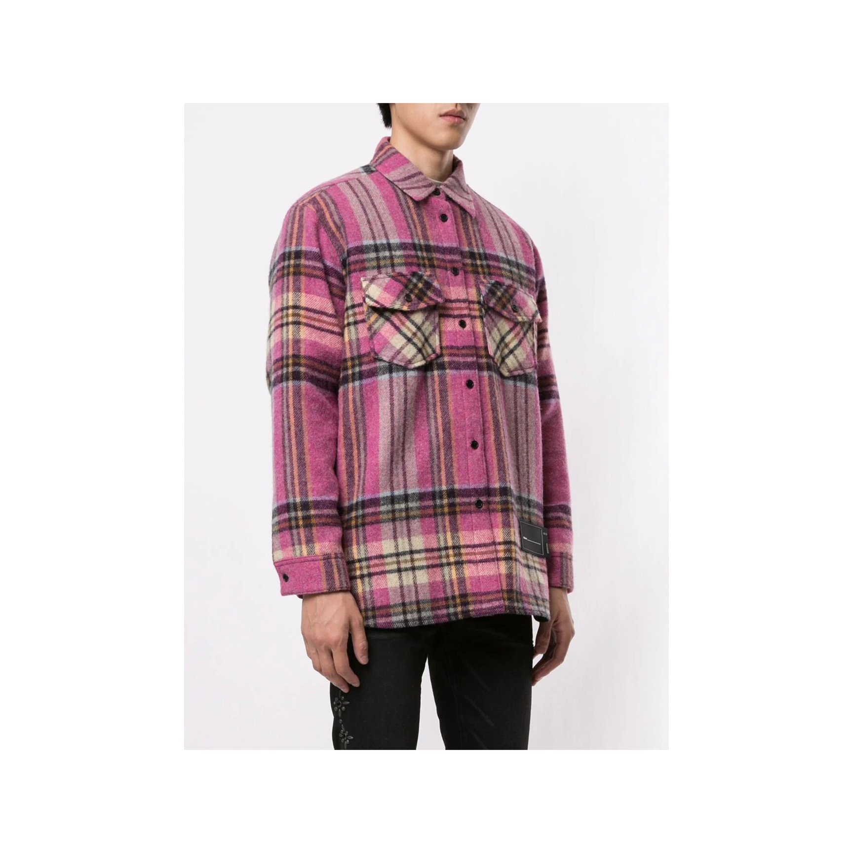 ハリのある素材感のウール100%シャツです。こちらもよく見ると個性的なチェックパターンになっています。フロントのブランドパッチがネームタグになっているのもユニークですね。