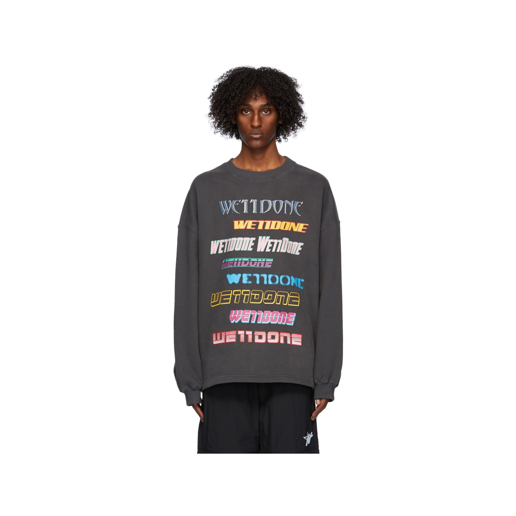 ? 書体もデザインも異なるさまざまな「ウェルダン」のブランドロゴがプリントされたグレーのスウェット。モノトーンスタイルに遊び心をプラス。