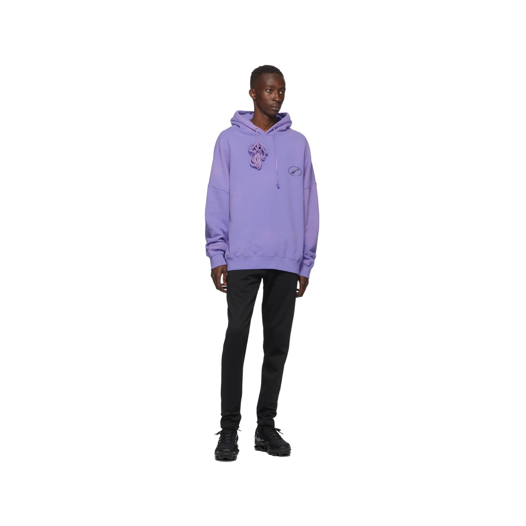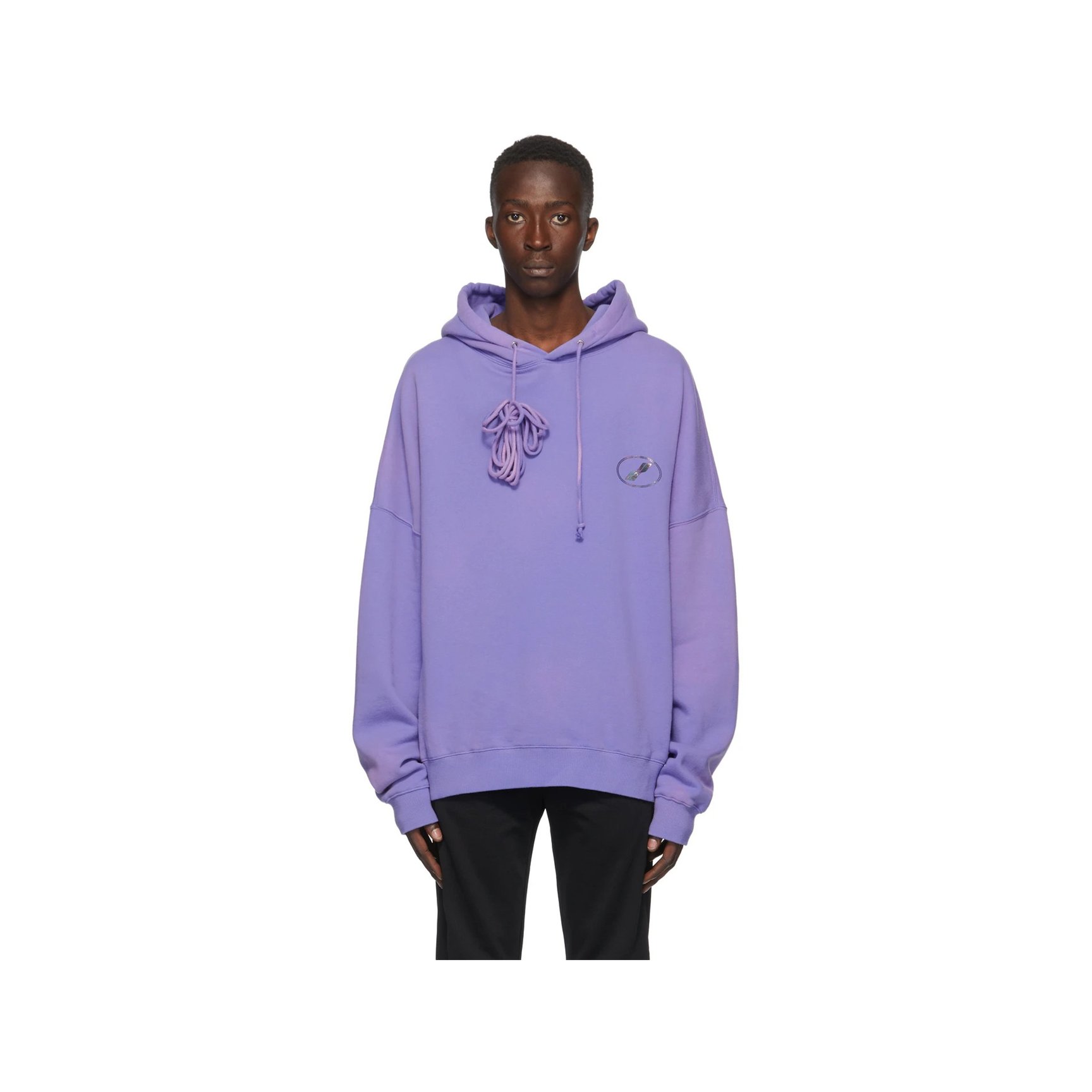 スーパーロングなドローストリングのフード付きスウェットです。背中のロゴプリントやレインボーメタリックの胸元のロゴなど、カラフルにまとめられています。全体のハンドブリーチ加工の風合いも楽しめます。こちらのパープルの他にもピンクやグリーンなどの豊富なカラーバリエーションから好みの一着をチョイスしてみては。