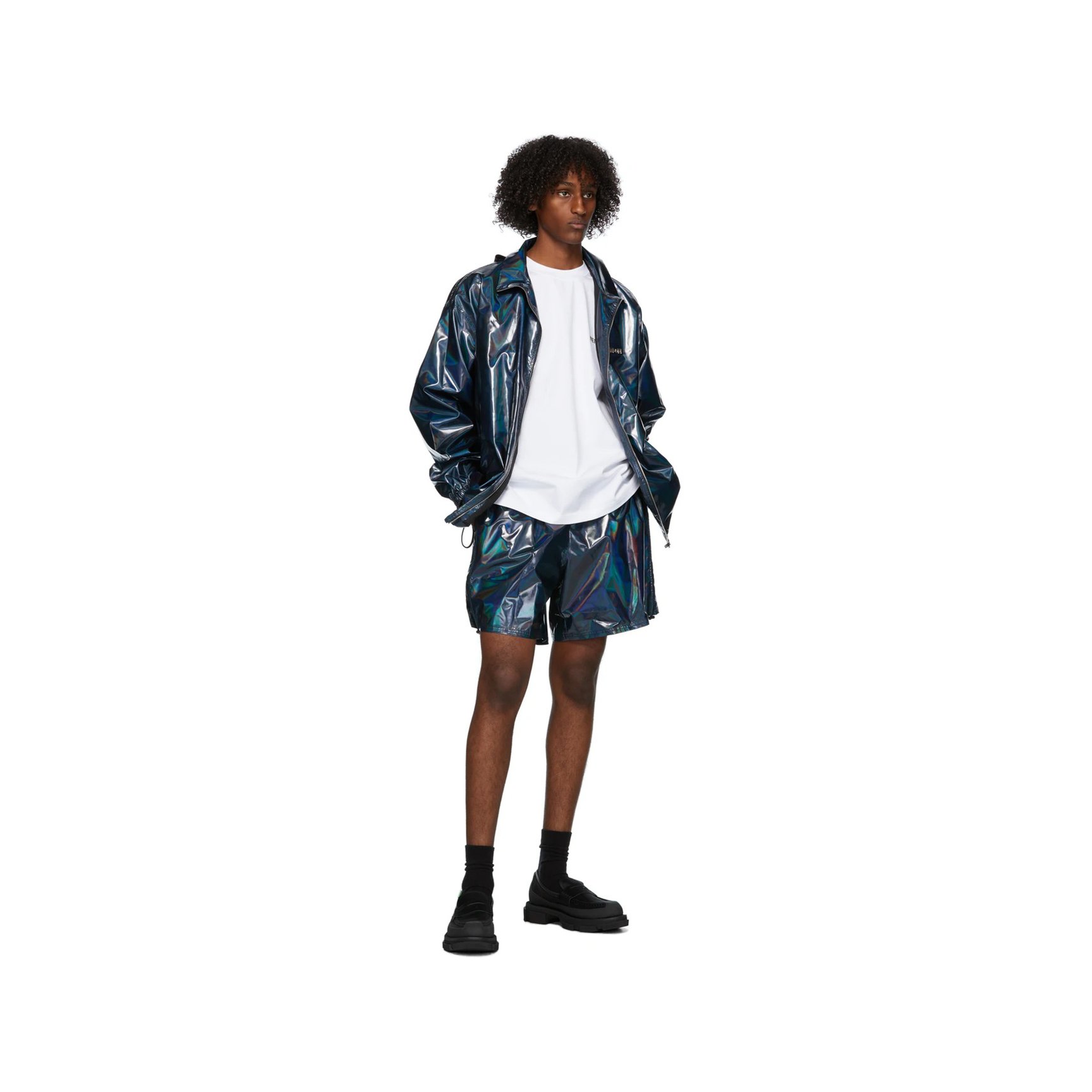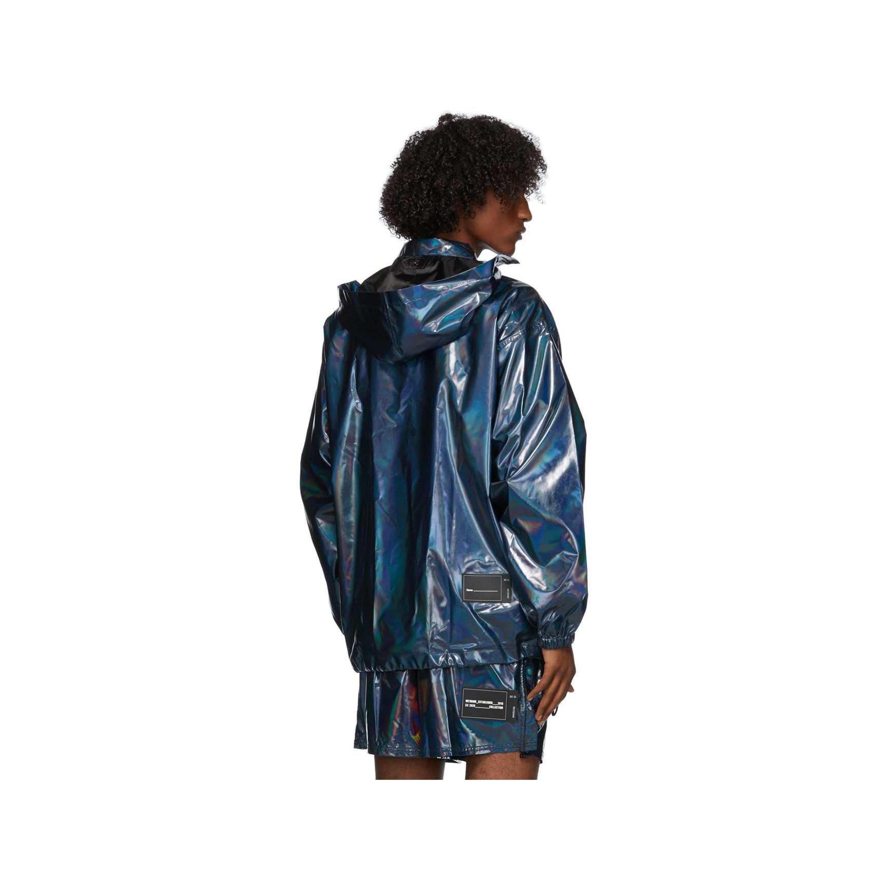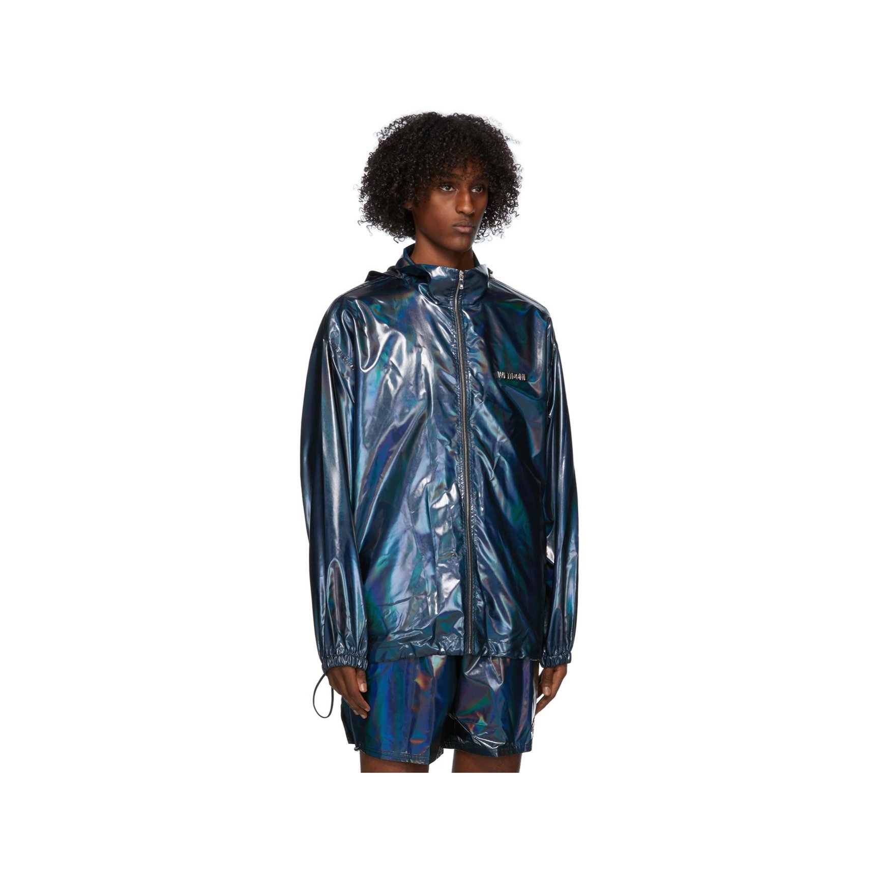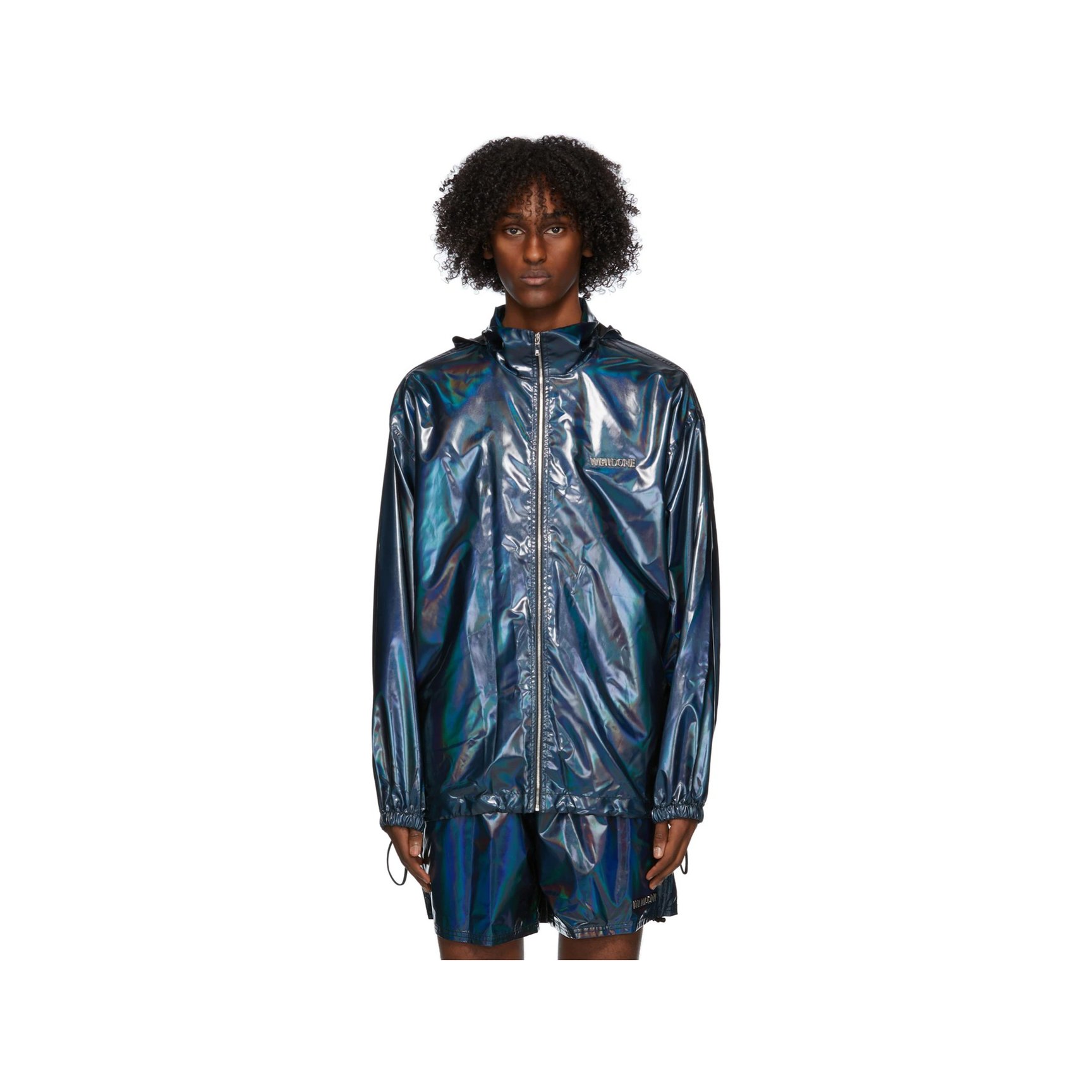サテン素材のウィンドブレーカーは、レインボーメタリックが近未来的な一着。
