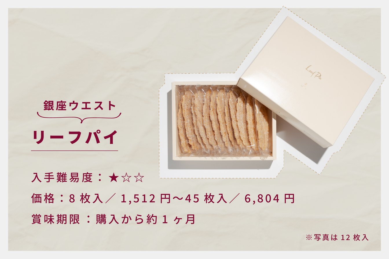 銀座ウエストは、銀座本店に加え、表参道の「青山ガーデン」、横浜高島屋の「ベイカフェ ヨコハマ」の3店舗を展開しているほか、日本橋三越や伊勢丹新宿店などの百貨店、公式オンラインストアでも販売しているので、入手難易度は「★☆☆」。今回は12枚入りをセレクトしましたが、8枚?最大で45枚入りまであるので、お歳暮から自分用まで用途に合わせて選ぶことができます。店頭ではもちろん、オンラインストアでも熨斗紙や短冊の細かい指定ができるので、さまざまなお祝い事で利用できるのも魅力の一つです。