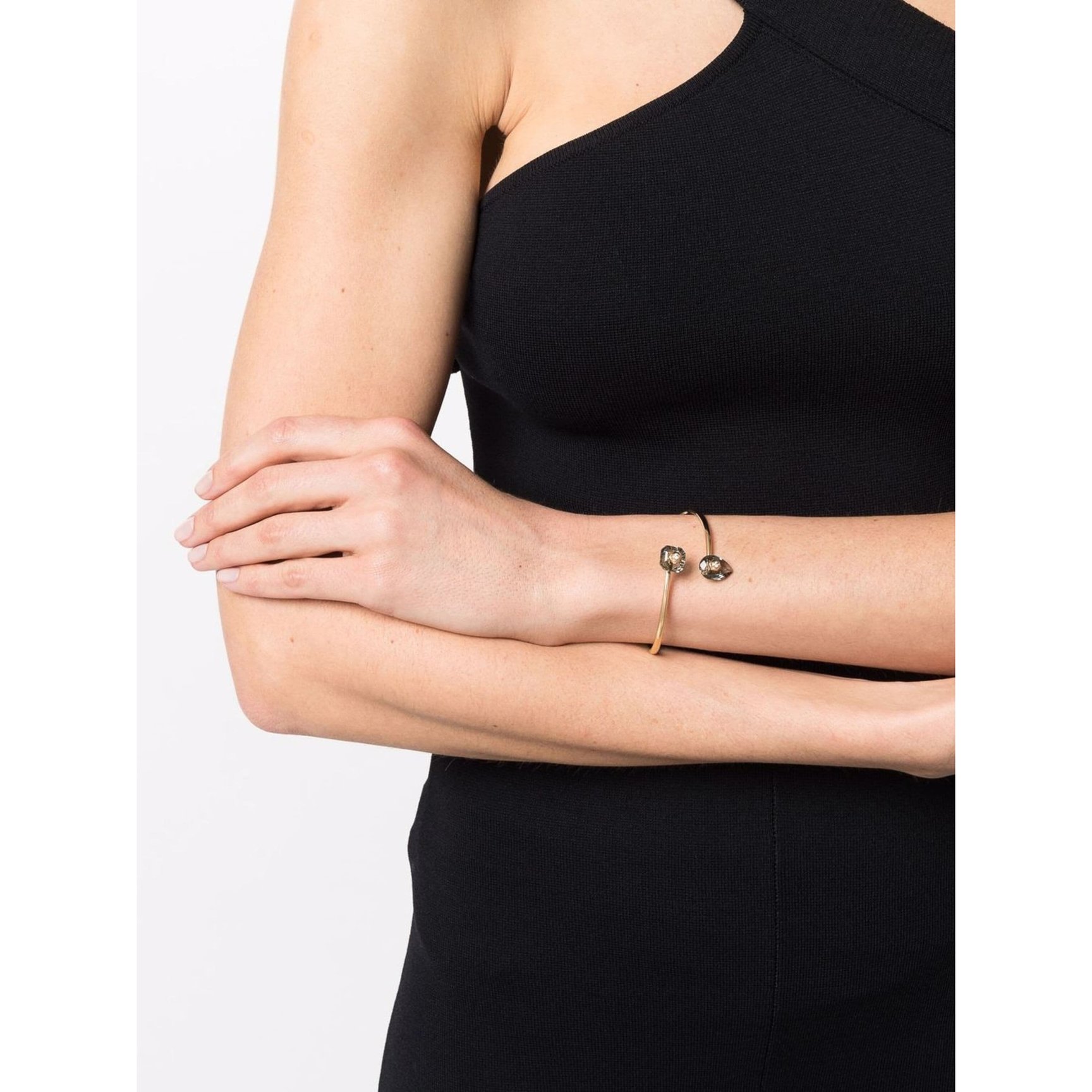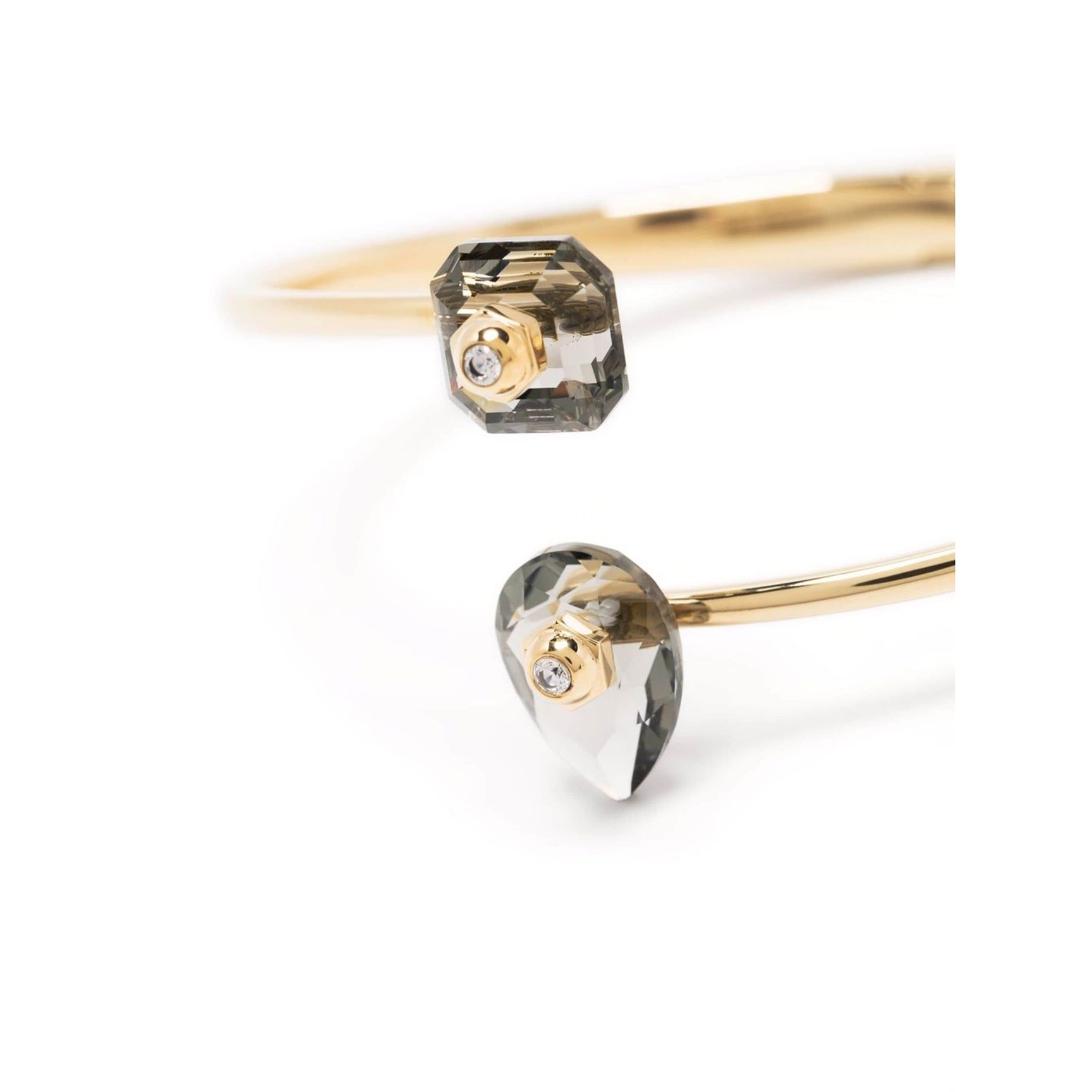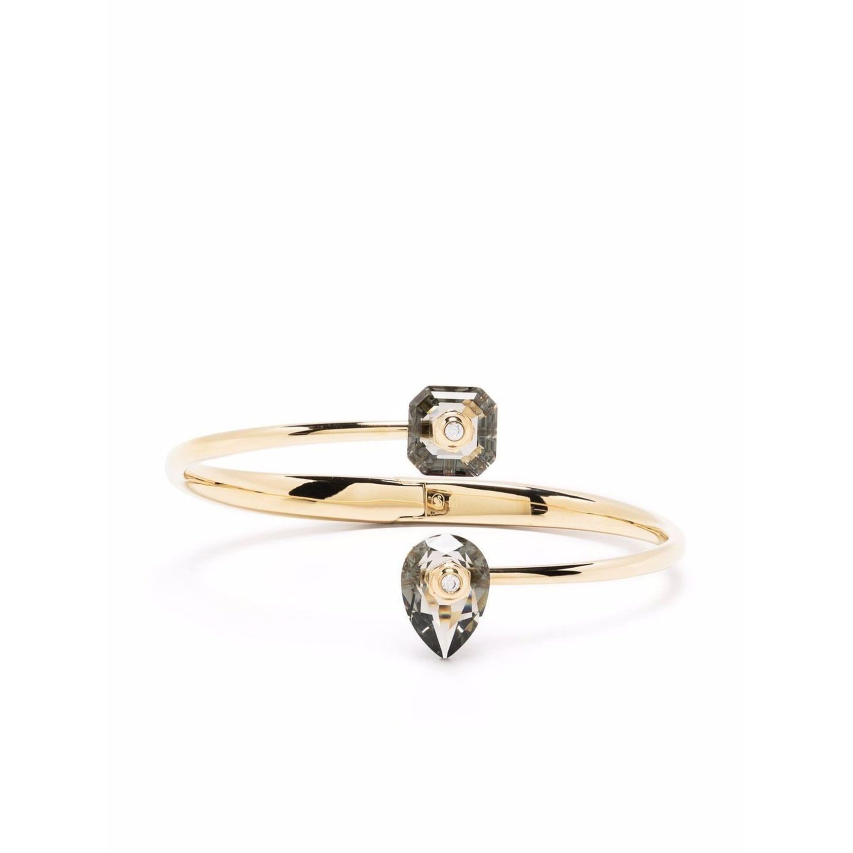 大人っぽいグレーのクリスタルが輝く「スワロフスキー(Swarovski)」のバングル。オープンカフデザインの先端にペアカットとインペリアルカットの2つの対照的なモチーフを載せた、アシンメトリーな美しさとガラス特有の奥行きを満喫できるアイテムです。