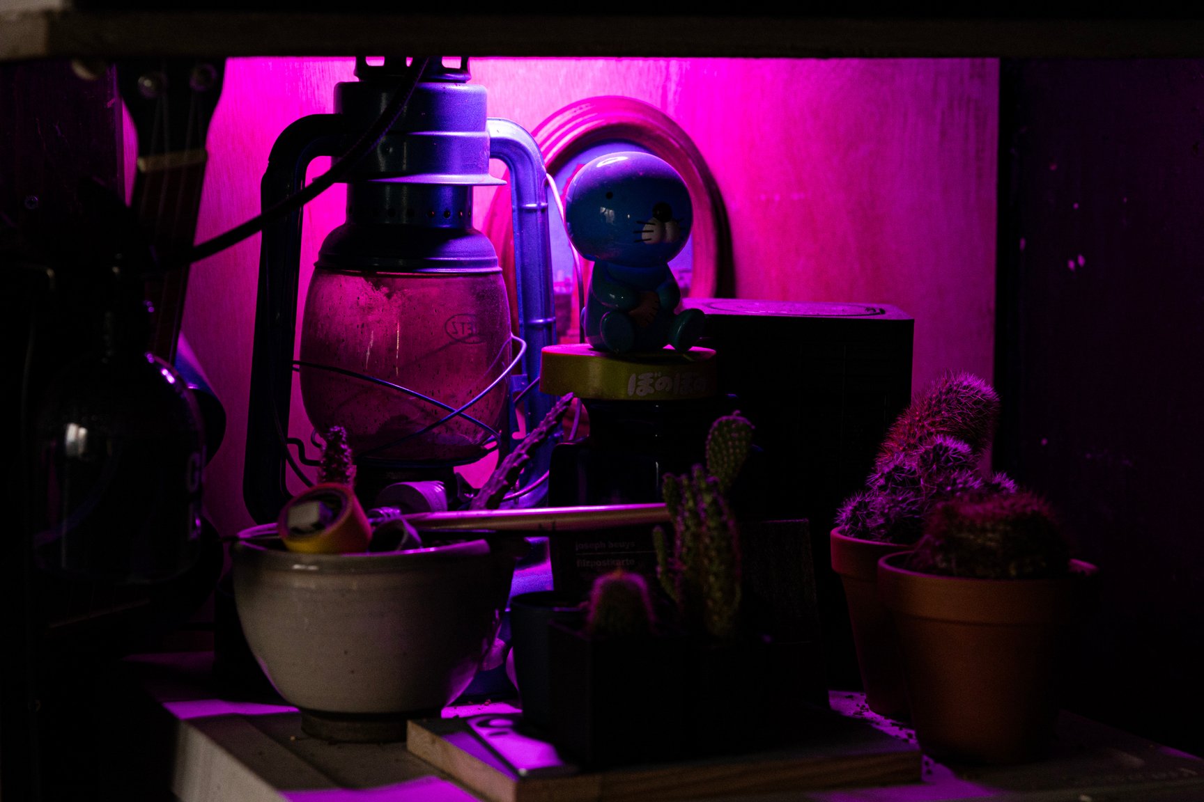 卯城:「このタイミングで一般公開しよう」という戦略的なものではなく、この展示だから一般公開にしました。隼士くんと打ち合わせをしてきた場所は鷹取山の山頂。昼間から日没まで数時間過ごすんですが、そこから見える世界の景色は、自然光で明るくなったり真っ暗になったり、昼間と夜ですごく見え方が変わるんですよ。そういう中で隼士くんが作っている作品や感覚を、キュレーションするにあたって「ライティングをしないことだな」と思い、外光のみを灯りとして使用することにしました。外光だけでやるなら、営業時間は24時間だな、と。
