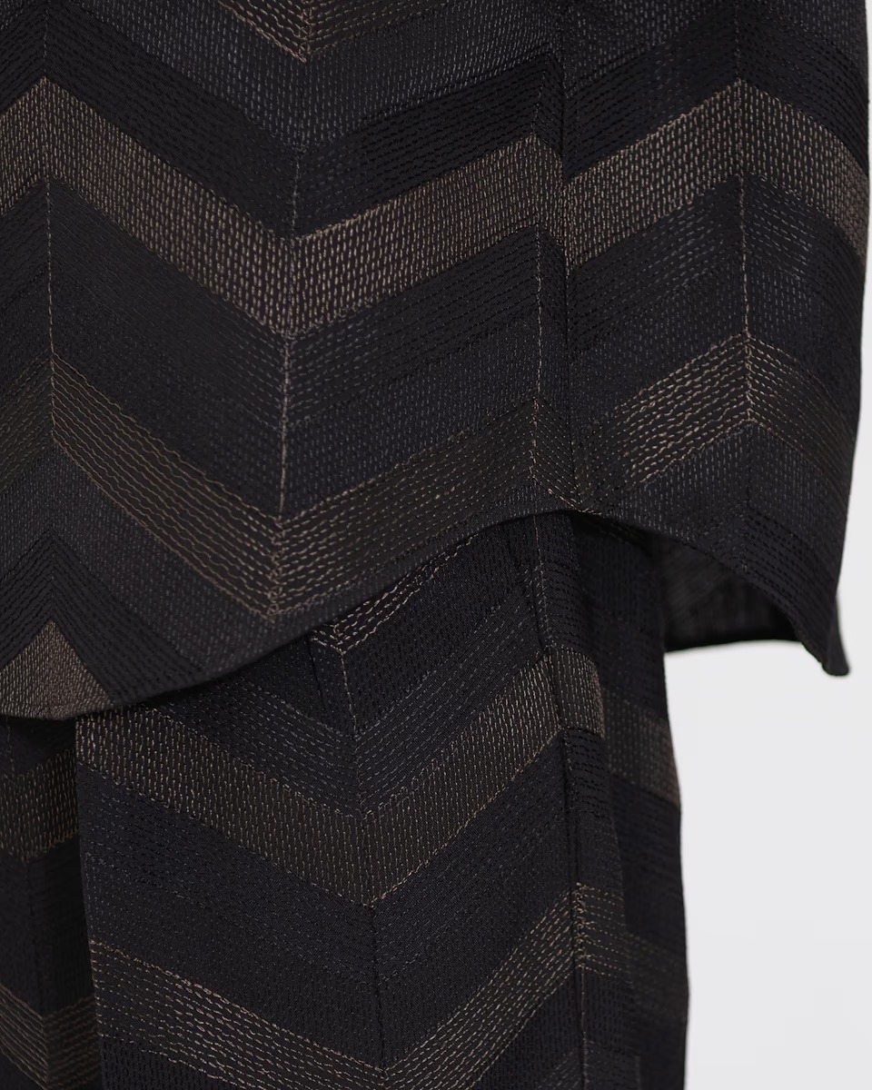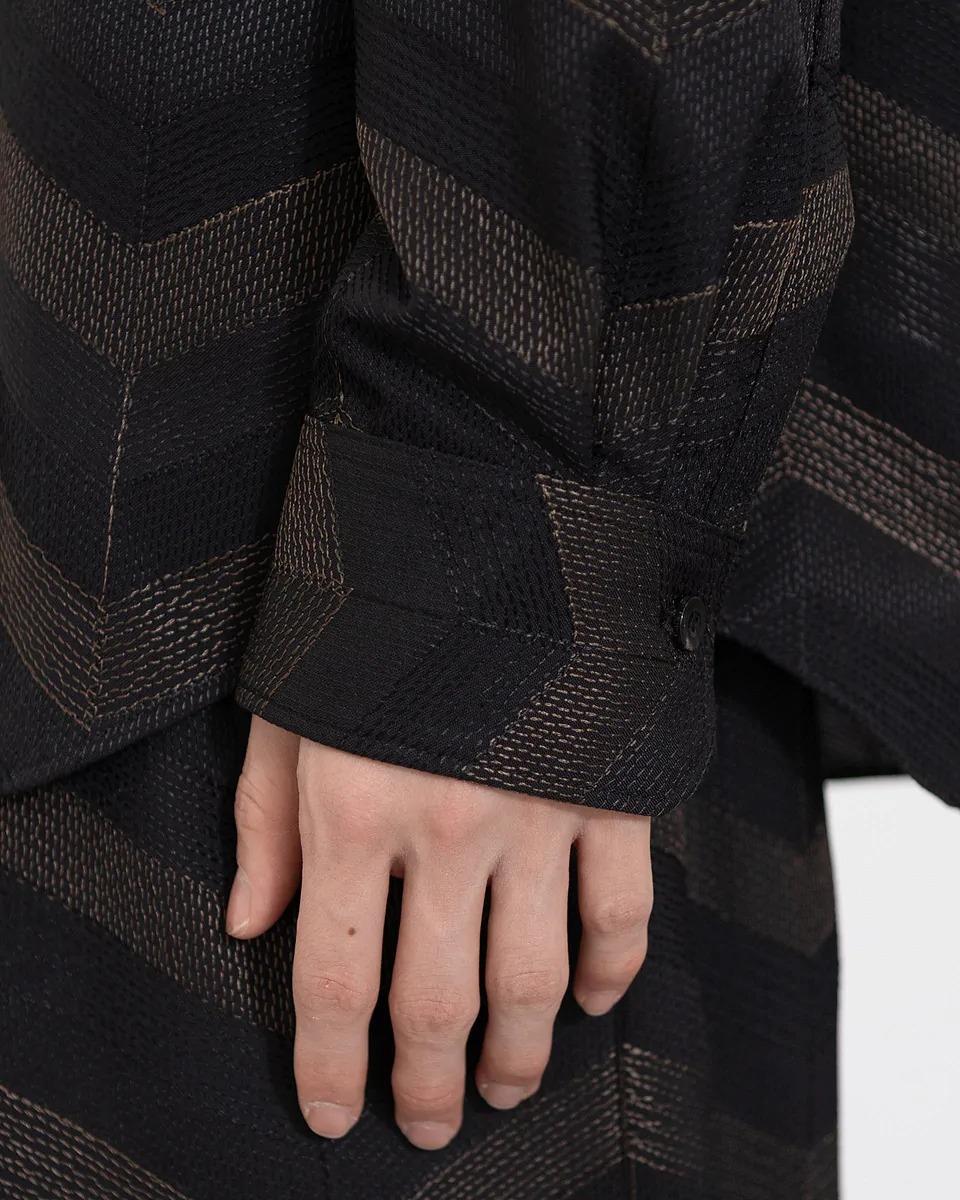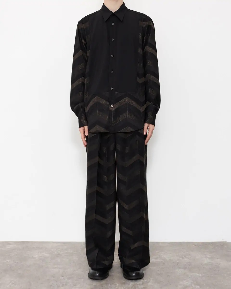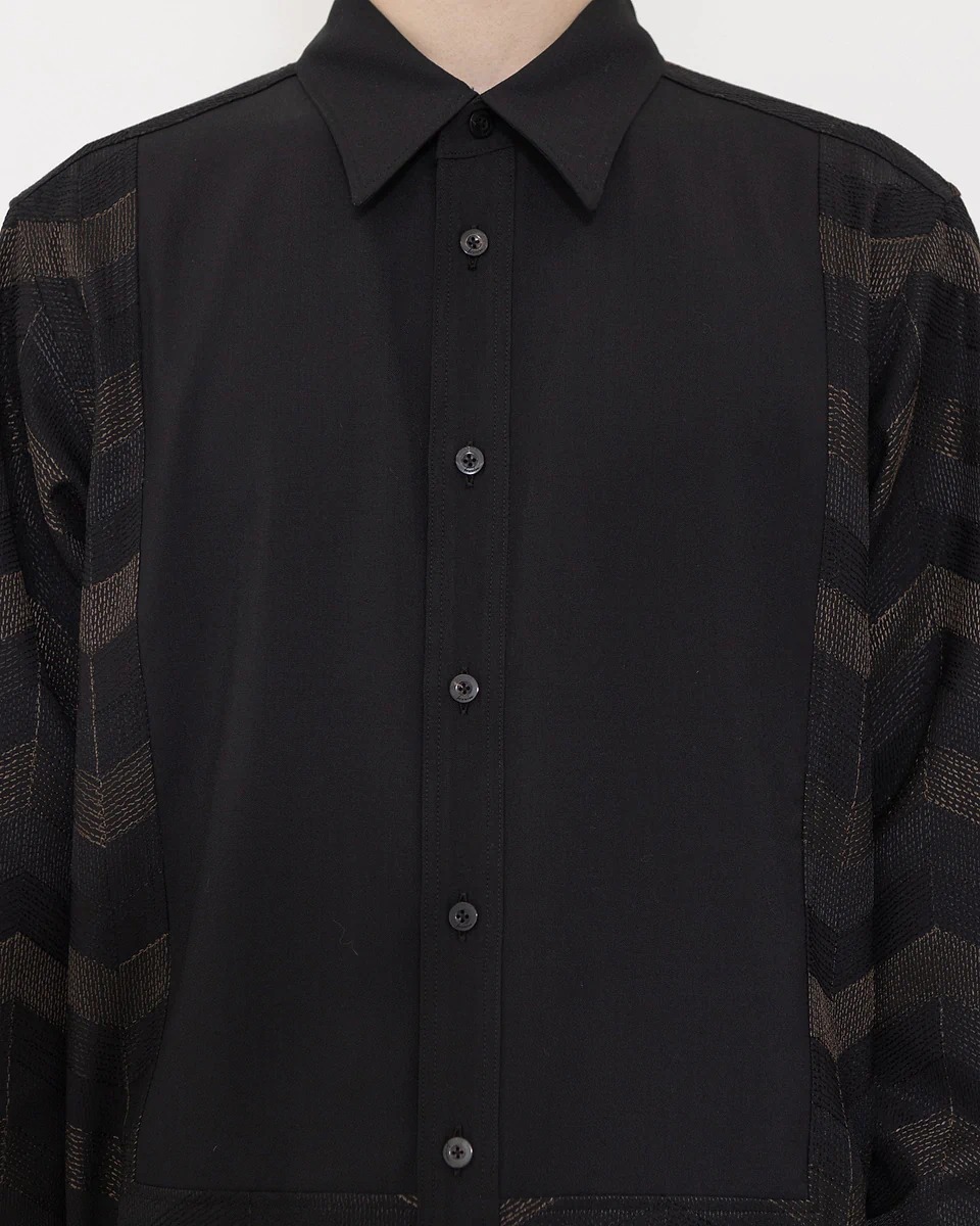 そんな連日届く各ブランドの珠玉の新作の中でも、半年前に見た時から鮮明に印象に残っているアイテムの1つが「イレニサ(IRENISA)」のシャツです。もう周知の事実ですが、「イレニサ」は「ヨウジヤマモト」出身のパタンナーの小林さんと、「サポートサーフェス」での企画?生産?デザインの経験を持つ安倍さんの男性デザイナーデュオが手がけるブランド。男性デザイナーが手がけるメンズブランドと聞くと、質実剛健、武骨、力強さと形容される洋服が想起されがちですが、「イレニサ」の洋服はパワーはありながらも、繊細さやアンニュイさも兼ね備えた不思議な魅力があるのが特徴です。それも2人の経験から裏打ちされる緻密なパターンと、こだわり抜いた素材の成せる技でしょうか。このシャツも尾州にて織られたポリエステルとサマーウールの混紡生地を使い、繊細な刺繍は北陸の刺繍工場にお願いをするという拘りよう。3色の糸を交互に刺しながらヘリンボーン柄のステッチを縦横で入れ替えることで立体的に見せるという、職人技が詰まった1着です。とは言えクドすぎないのは、フロントパネルをソリッドな印象のブラックの生地に切り替えているから。