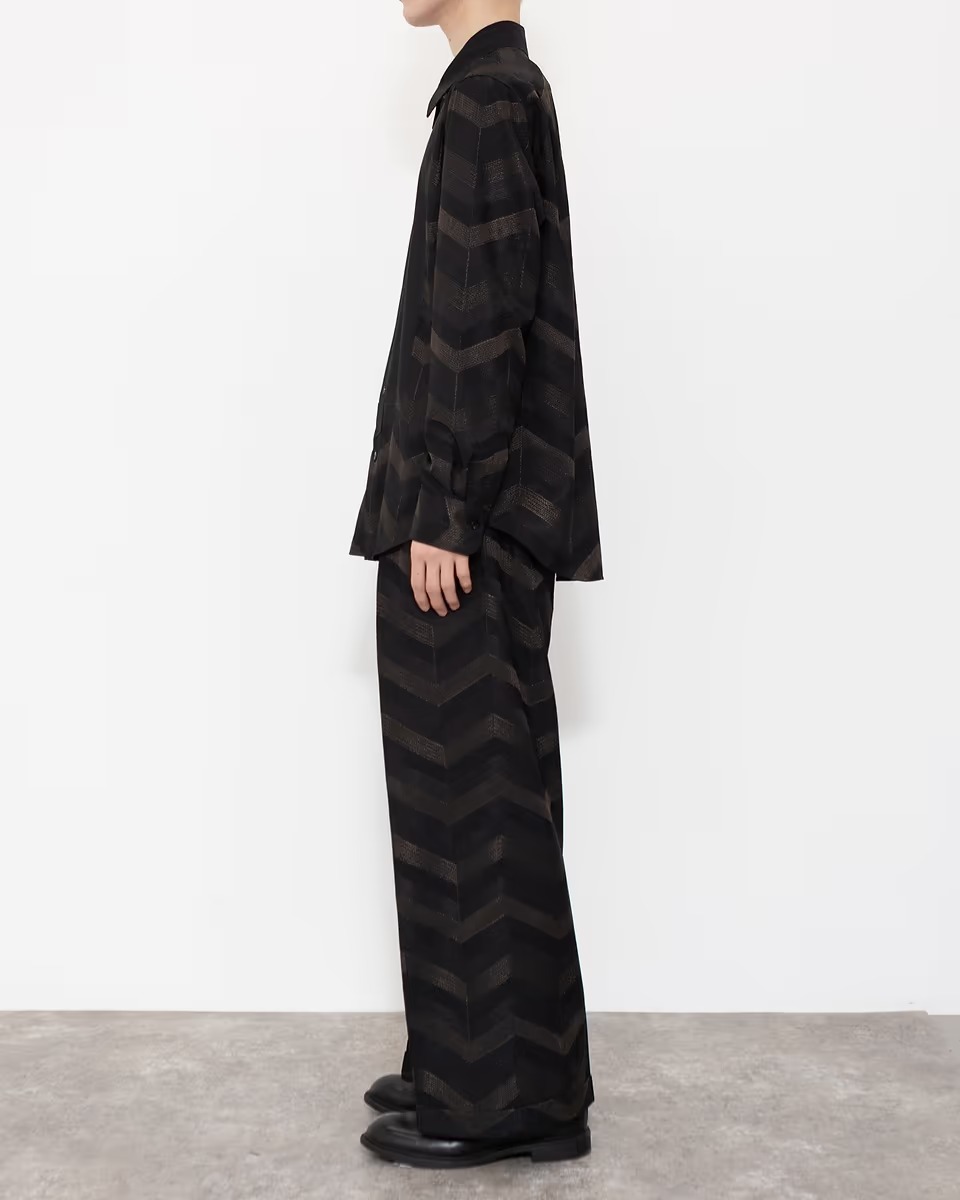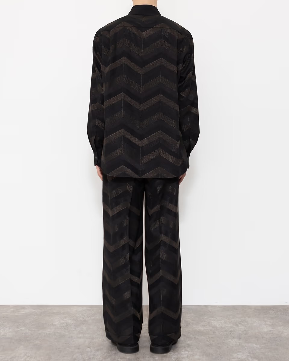 同じ生地?柄のパンツもあり、全身総柄なんてちょっと気が引けちゃいますが、これは絶対セットアップで着たい。そう思わせてくれるくらいかっこいいのです。