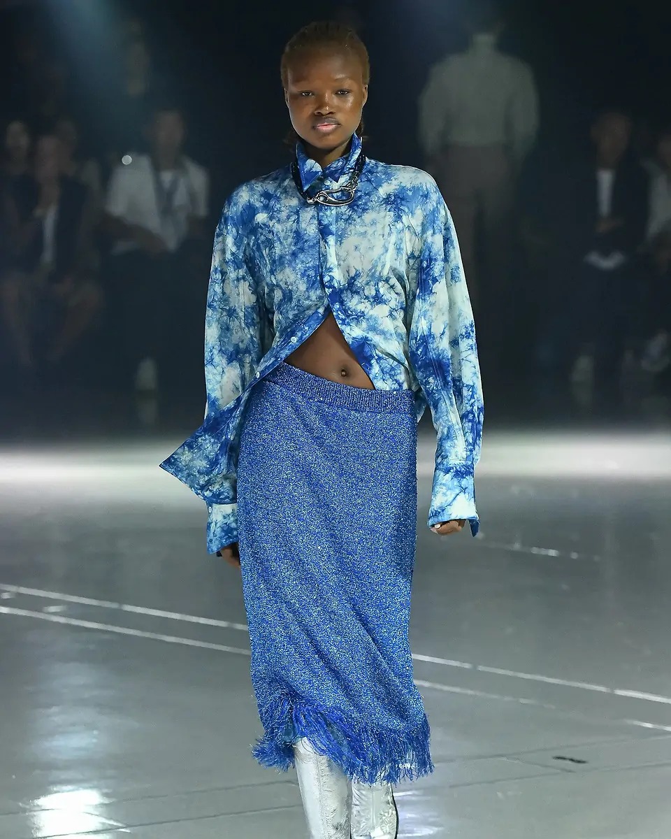 「カナコ サカイ」は、日本が世界に誇る文化とものづくりの技術を、ブランドのクリエイションに乗せて世界に発信していくことを信条とするクールなブランド。その最大の魅力は、産地の職人とタッグを組み、オリジナルで制作しているというこだわりぬいたテキスタイル。そしてそれを活かすクリーンなカッティングと鮮やかなカラーパレットです。そんな「カナコ サカイ」の今シーズンのアイテムの中でも心掴まれたのは、阿波藍の産地として知られる徳島県にアトリエを構えるWatanabe'sが手がけたムラクモ絞りシリーズ。1つ1つ手作業で染め上げられた生地に美しく表現された群雲(ムラクモ)柄は、デザイナーのサカイさんが考える日本的美意識の定義である"偶発性と曖昧さを愛する日本人の精神性"に通じるものを感じます。ウエストにシェイプをかけたメリハリのあるシルエットのシャツと、バイアス使いによってドレープを綺麗に演出したスカートの組み合わせによって、水面の様な美しい輝きを放つテキスタイルをより堪能できるはず。パーティーなどの華やかな場面だけではなく、普段使いでも着回したいアイテムです!