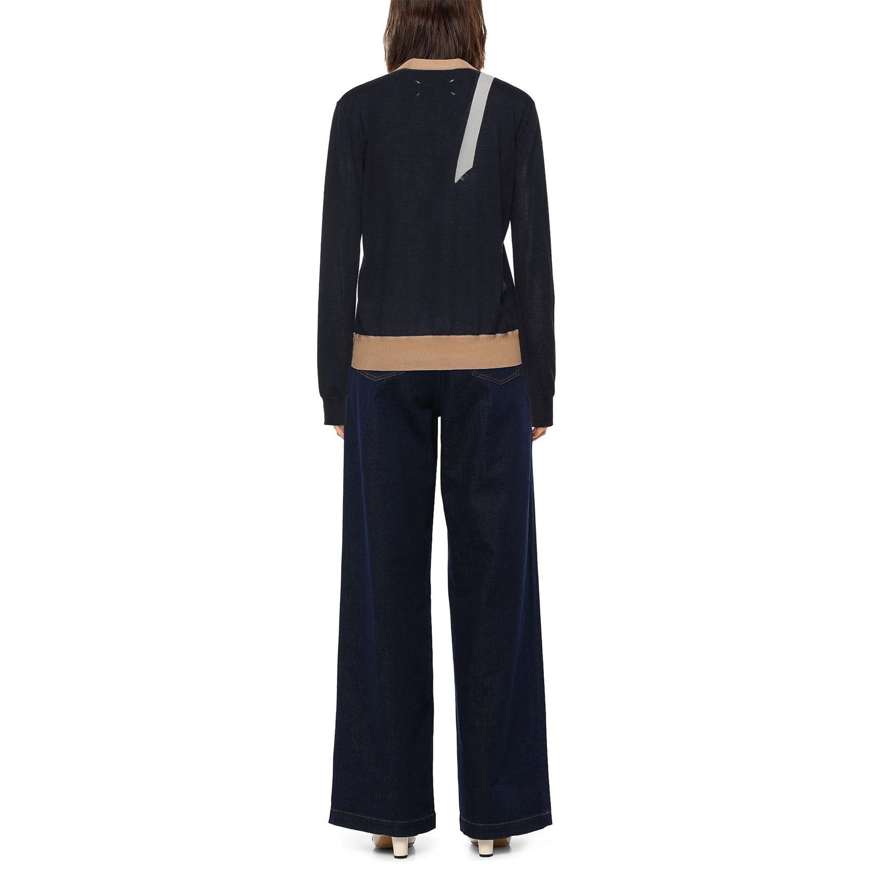 「メゾン マルジェラ(Maison Margiela)」からもうひとつ、シルクのラインディテールが斬新かつエレガントなカーディガンをチョイス。バイカラーのニットに異素材を組み込んだ、ファッションの面白さを堪能できる一枚です。首元にはホワイトステッチが縫い込まれています。