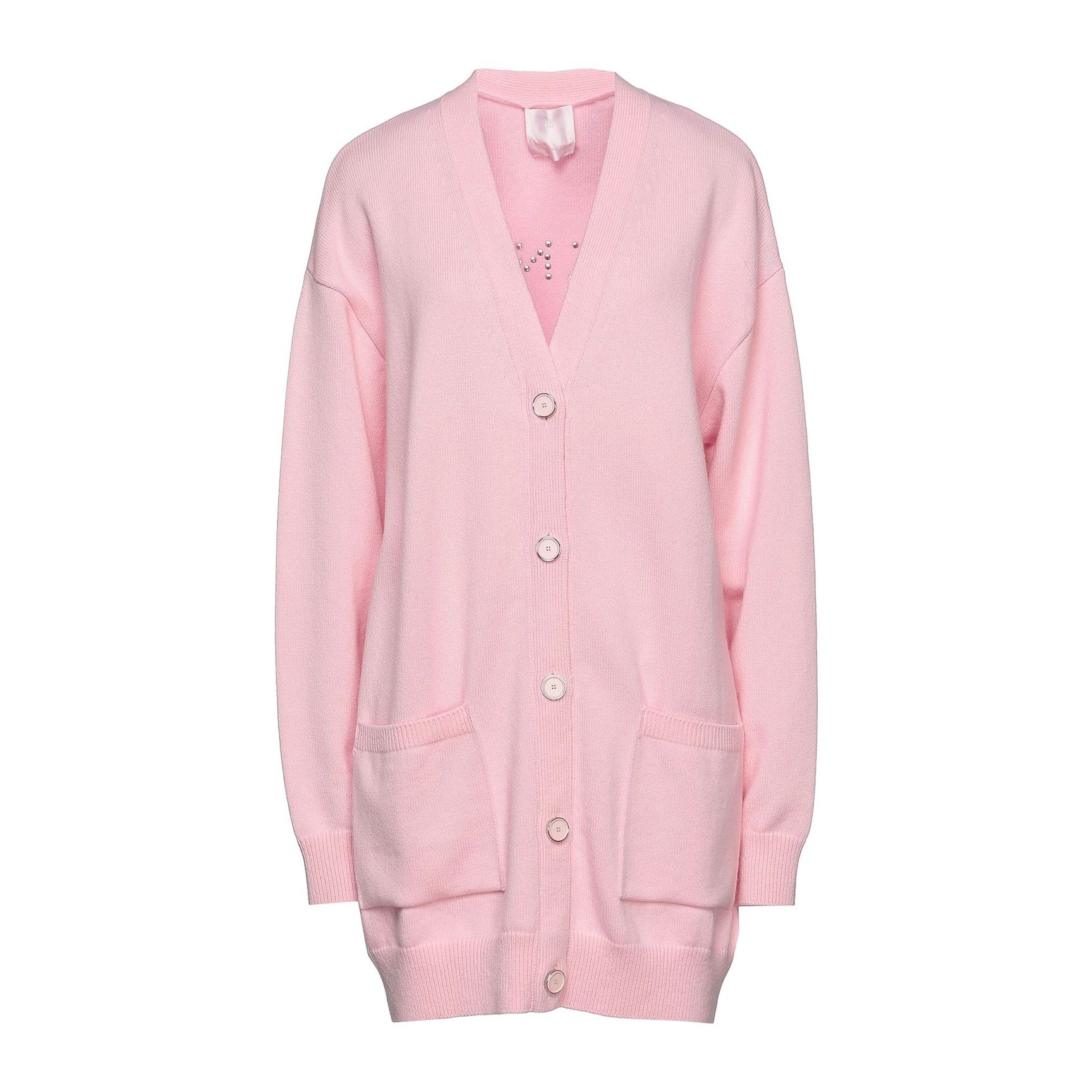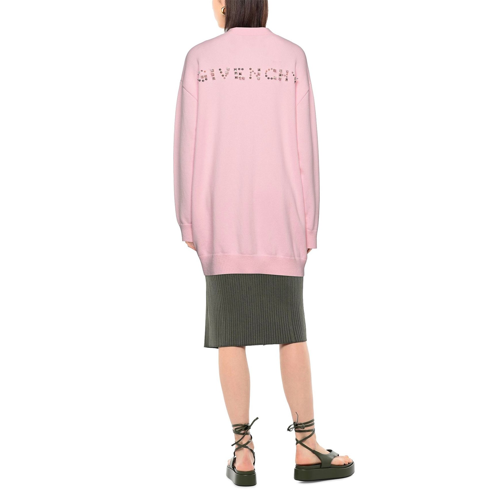 最後にご紹介するのは、可憐なピンクにパンクなロゴがパッチされた「ジバンシィ(GIVENCHY)」のカーディガン。プレーンな無地のボディに浮かぶスタッズやクリスタルが、ジュエリーのように光りレタリングロゴを眩く演出します。ゆったりとした、ロングタイプのシルエットです。