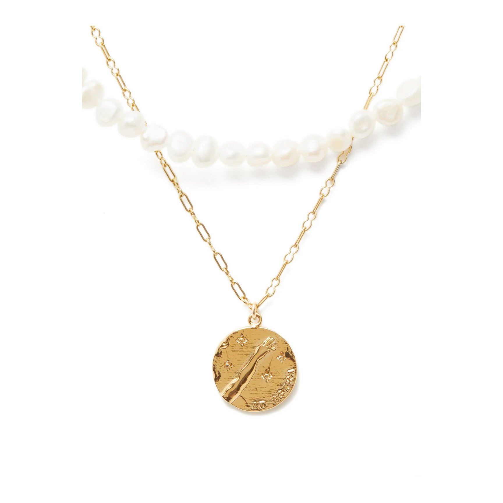 「バイ アローナ(BY ALONA)」のネックレスは、ラテン語で星へを意味する”ad astra”の文字を掲げる、モチーフペンダントとバロックパールのチョーカーをドッキング。ひとつで華美な首元を完成させるデザインで、お守りジュエリーにもぴったりです。