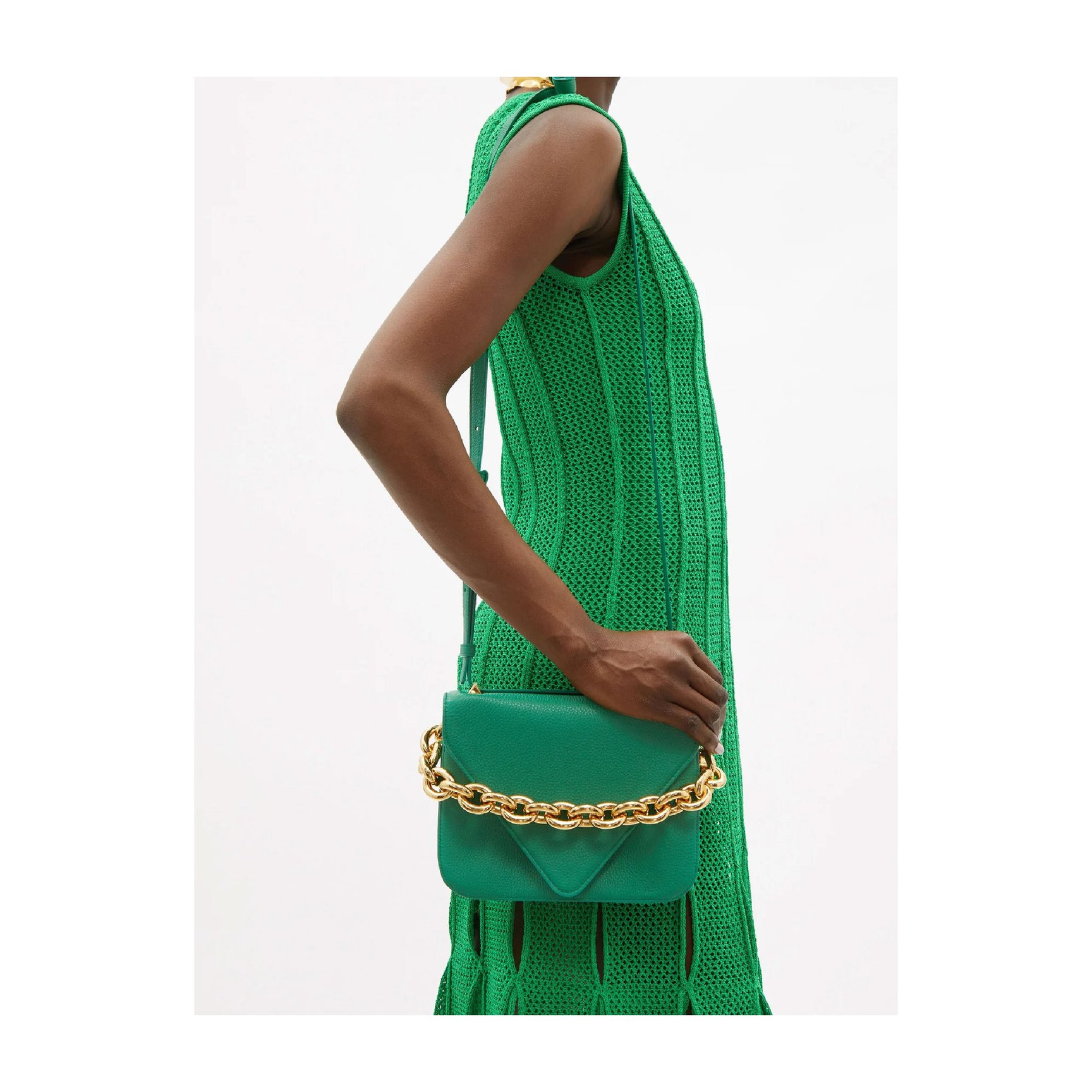 頑張った1年の集大成として手にしたいのは、ずっと気になっていたブランドの名品バッグ。リストインするに相応しい「ボッテガ?ヴェネタ(BOTTEGA VENETA)」の「マウント」は、今年6月のリリース以来常に注目の的です。モードに煌めくシリーズの中から、トレンド感溢れるボッテガグリーンのショルダーをチョイス。スタイリングのアクセントとなる明るいグリーンとチャンキーなチェーンは、主役級の存在感を放ちます。