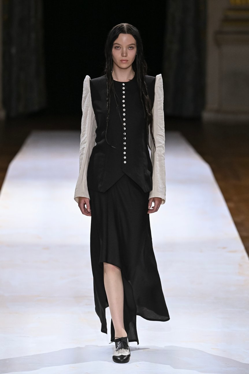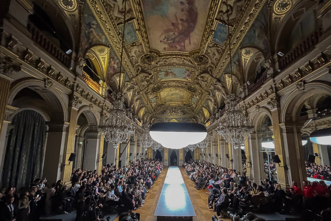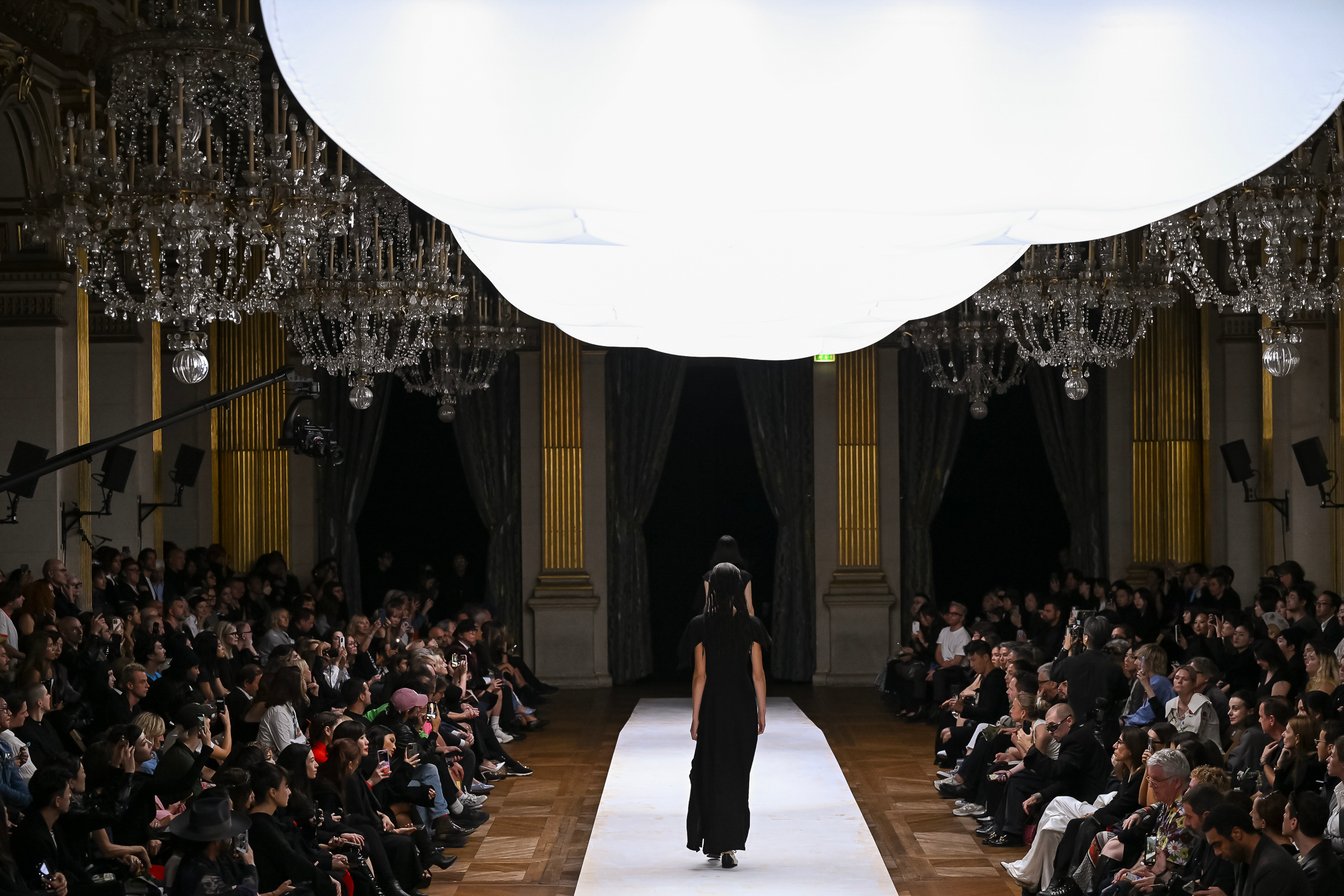 パリ?ファッションウィーク5日目の9月29日、日が暮れかけた19時のパリ市庁舎(オテル?ドゥ?ヴィル)前に、黒い人だかりができていた。ここは「ヨウジヤマモト(Yohji Yamamoto)」がランウェイショーを毎シーズン開催している会場。今回の2024年春夏コレクションも、大きなシャンデリアが垂れ下がる大広間にランウェイが設置された。フロントロウには「ヴェトモン(VETEMENTS)」のグラム?ヴァザリア(Guram Gvasalia)や、「キッドスーパー(KidSuper)」のコルム?ディレイン(Colm Dillane)といったデザイナーらの姿もあった。