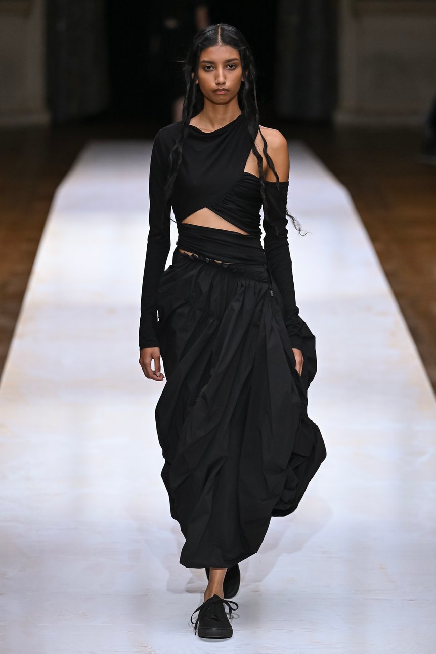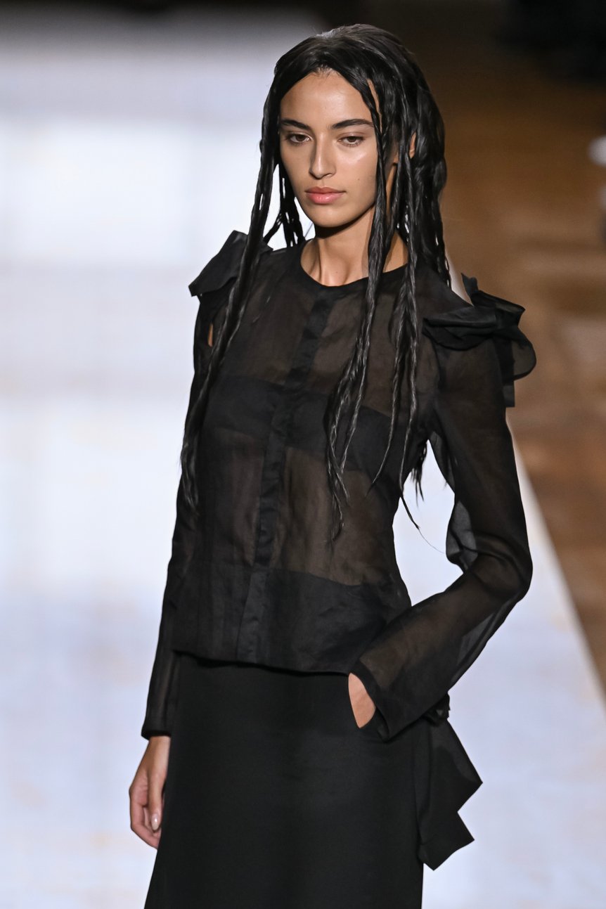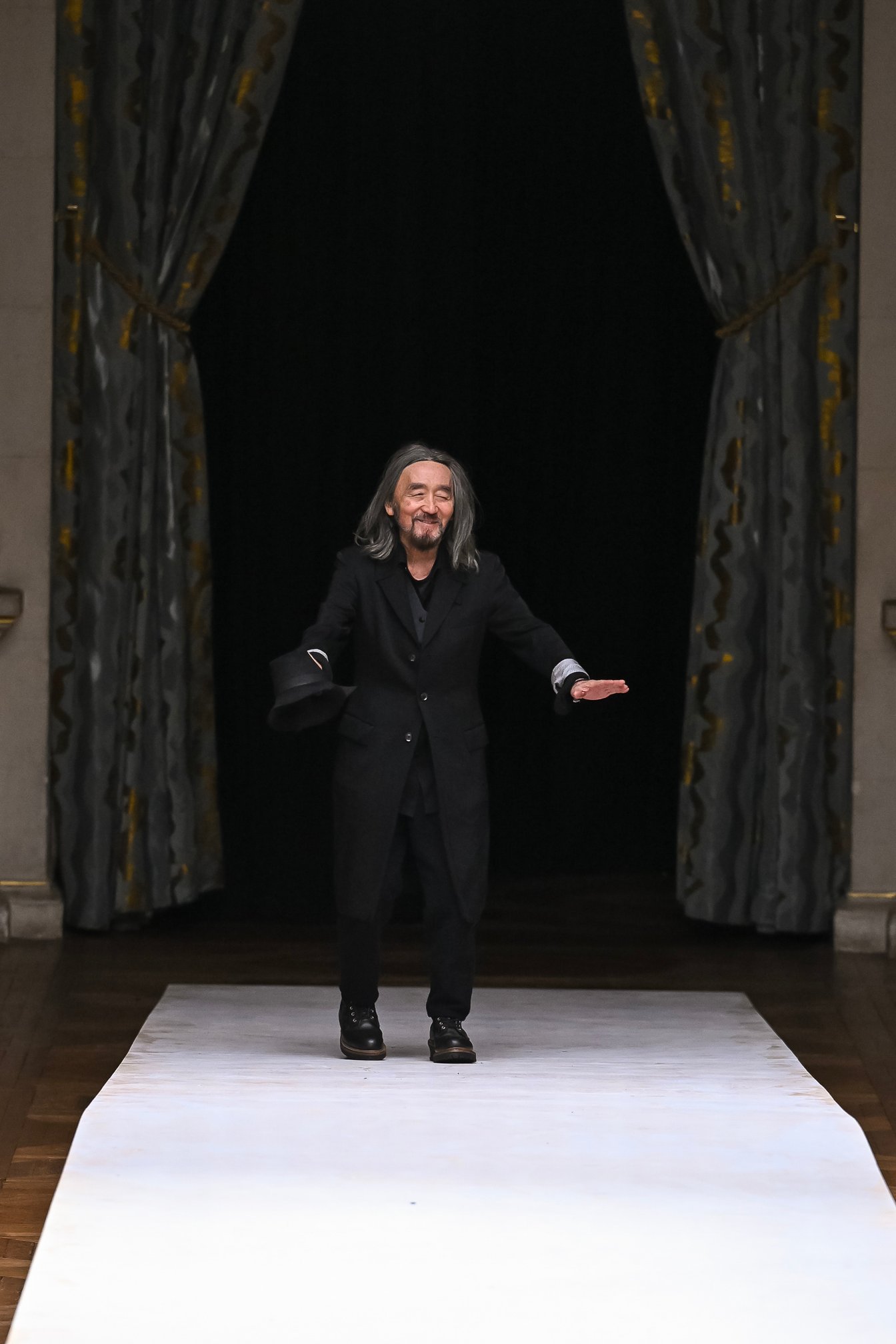 パリ?ファッションウィーク5日目の9月29日、日が暮れかけた19時のパリ市庁舎(オテル?ドゥ?ヴィル)前に、黒い人だかりができていた。ここは「ヨウジヤマモト(Yohji Yamamoto)」がランウェイショーを毎シーズン開催している会場。今回の2024年春夏コレクションも、大きなシャンデリアが垂れ下がる大広間にランウェイが設置された。フロントロウには「ヴェトモン(VETEMENTS)」のグラム?ヴァザリア(Guram Gvasalia)や、「キッドスーパー(KidSuper)」のコルム?ディレイン(Colm Dillane)といったデザイナーらの姿もあった。