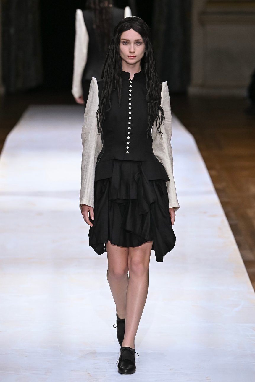 白くペンキが塗られた質素な板がランウェイとなり、煌々と照らすライトの下に登場したファーストルックは、黒のボディに白の袖を付けたノーカラージャケットのセットアップ。クラシカルで清楚なイメージを2ルック目も引き継ぎながらも、スカートが膝上のミニ丈となり新鮮な印象を与えた。