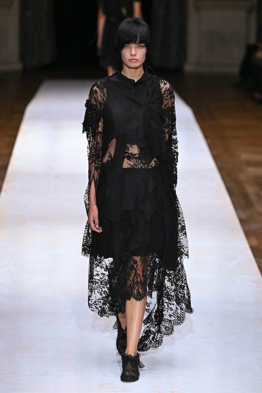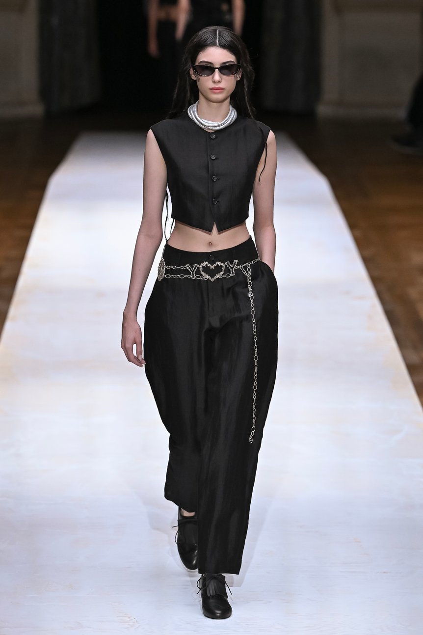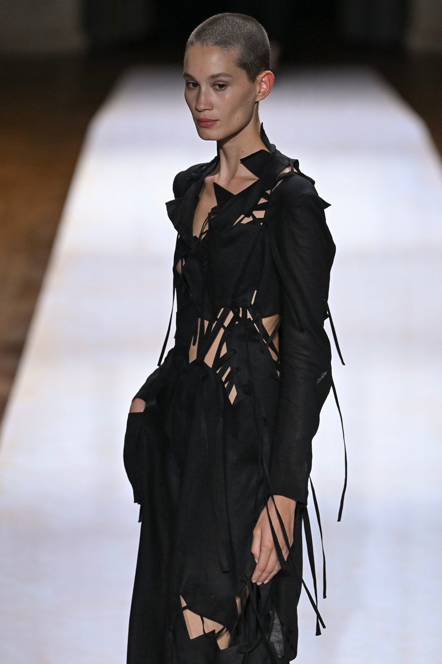 背中や脇腹を切り裂かれたように斜めに入ったスラッシュ部分からレースを覗かせたり、分断されたピースを細いリボンでつないだディテール、そして短丈のベストとメンズライクなパンツを合わせたヘソ出しスタイルなど。これだけ肌を露出していても決して性的な印象を与えず、強さと儚さ、フェミニンとマニッシュが絶妙に混じり合ったバランスは、ヨウジヤマモトならではだろう。