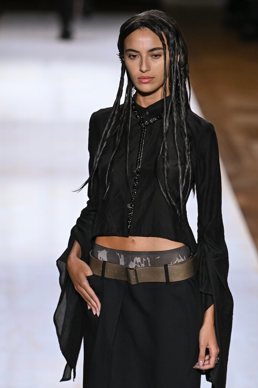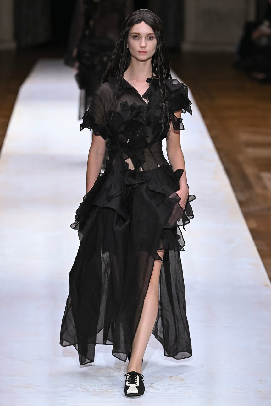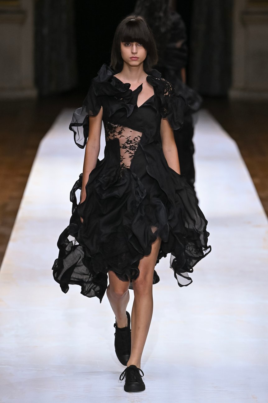 背中や脇腹を切り裂かれたように斜めに入ったスラッシュ部分からレースを覗かせたり、分断されたピースを細いリボンでつないだディテール、そして短丈のベストとメンズライクなパンツを合わせたヘソ出しスタイルなど。これだけ肌を露出していても決して性的な印象を与えず、強さと儚さ、フェミニンとマニッシュが絶妙に混じり合ったバランスは、ヨウジヤマモトならではだろう。