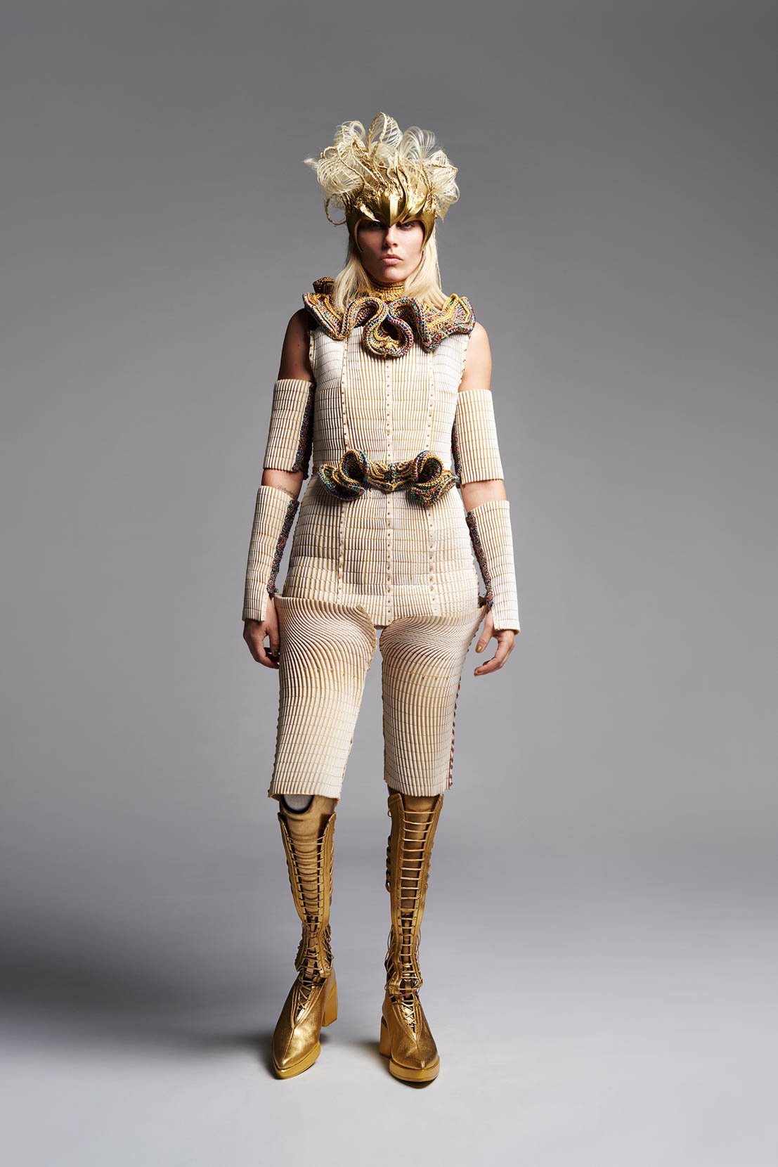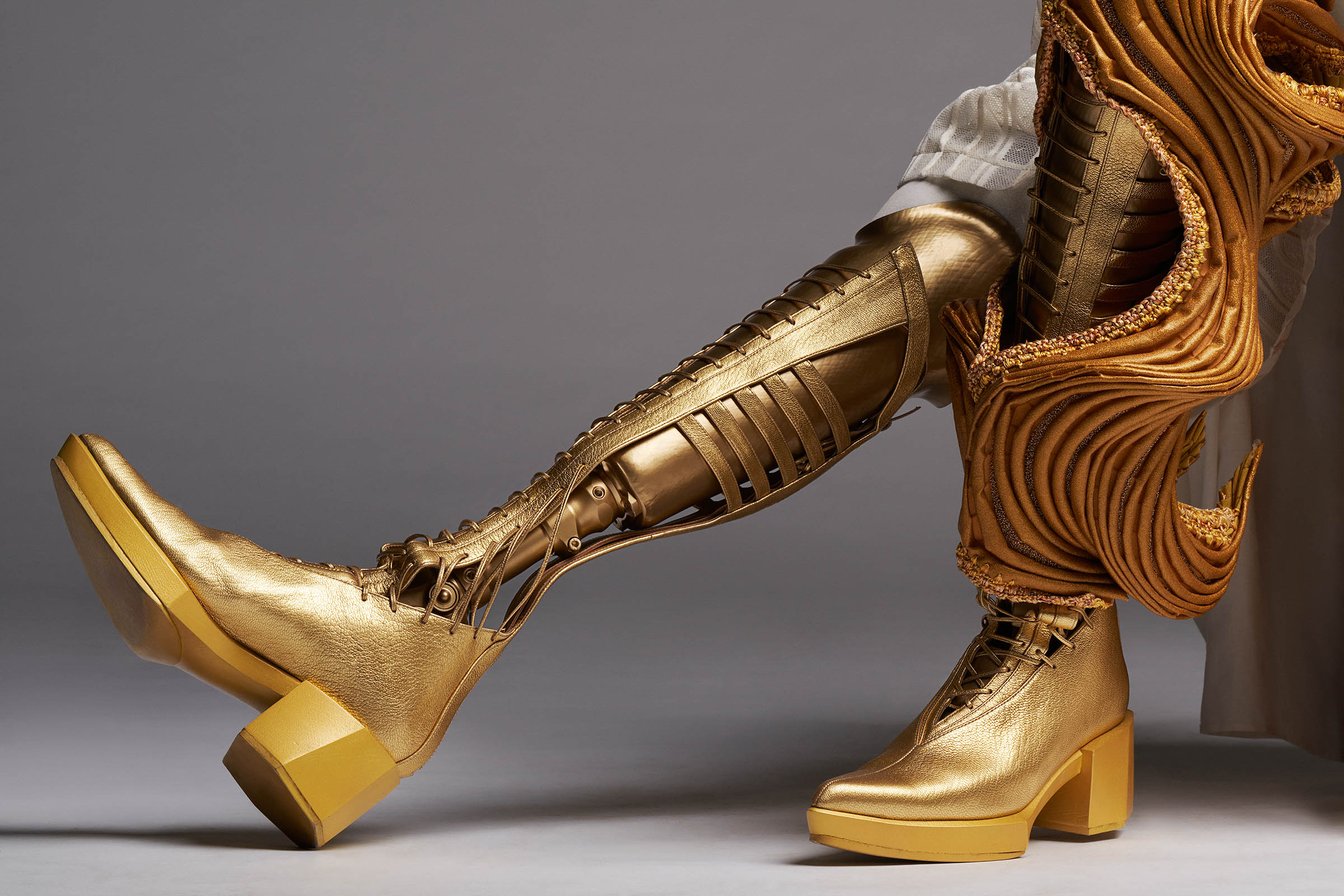 ドレスの他に、クチュールピースとローレンのゴールドの義足に調和するシューズを制作。レースアップのシューズは、靴紐が義足と一体化している。ローレンは通常用とハイヒール用の義足をオケージョンによって履き替えるそうで、「自分の体を交換し、体自身をデザインしている」という行為に、中里は"ファッションの未来"を感じたという。