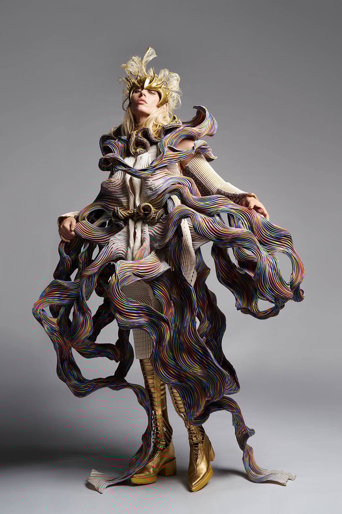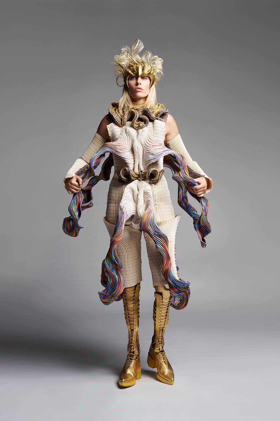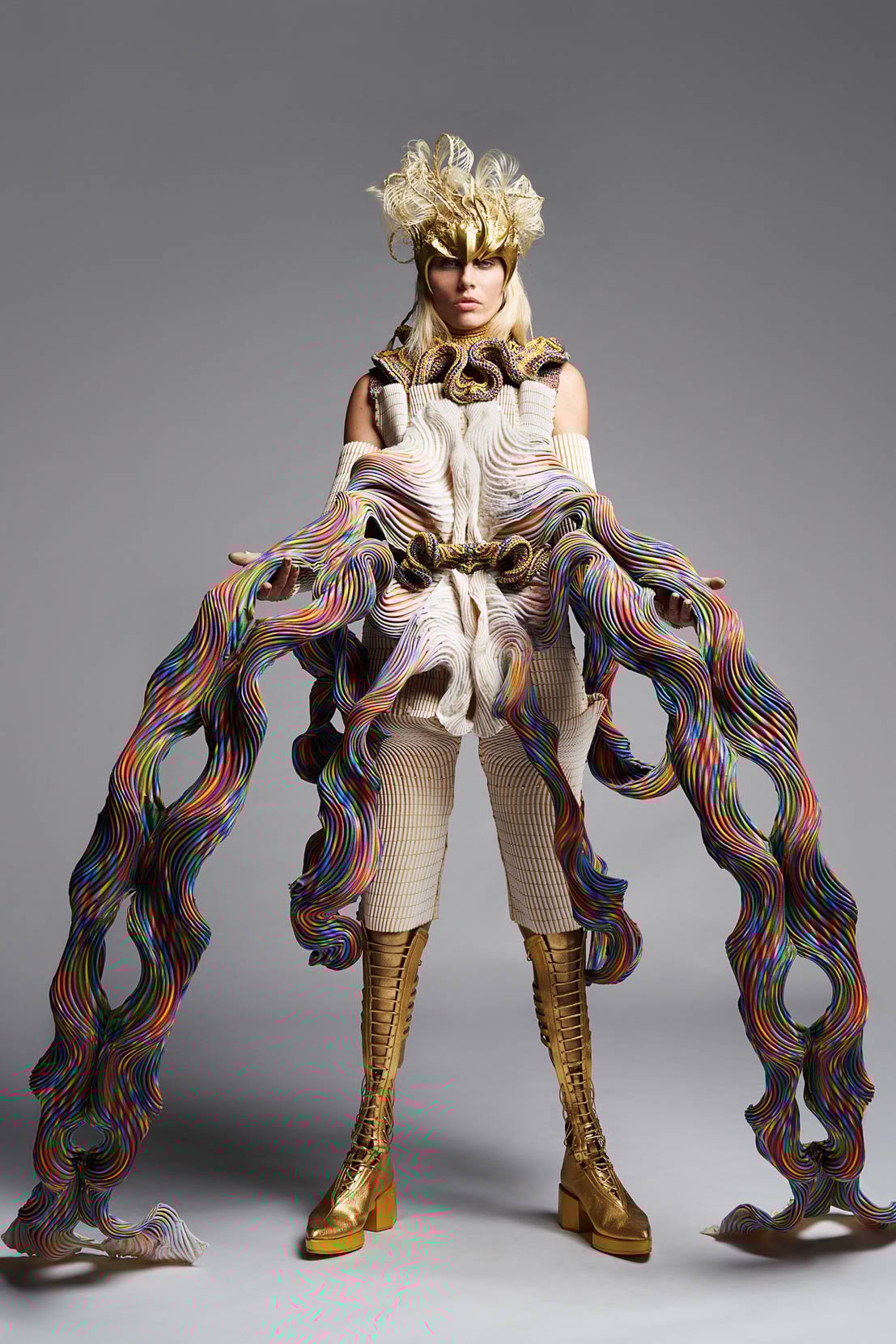 中里はまず、ローレンの採寸データをコンピューターに取り込み、数値的な情報を"布に記憶させる"という作業を行った。ローレンが愛するという自然から取り入れられた色彩を、江戸時代から伝わる着物など異なる布をつぎはぎにする手法「ボロ」のイメージで配色し、スパイバー開発の微生物発酵によって作られるタンパク質素材「ブリュード?プロテイン(Brewed Protein?)」の生地に印刷。液体に浸すと生地が縮んで形が変化し、体のラインに沿ったテキスタイルパーツが出来上がる。この最先端技術「バイオスモーキング(BioSmocking)」で制作された28枚のユニットを組み合わせ、ローレンの体型にぴったりと沿う一着のクチュールピースを完成させた。組み合わせ次第で8通りのピースに変化する構造で、完成形は、重力を感じさせない立体的なシルエットに仕上がった。これは中里が「記憶を可視化し、記憶など目に見えないものをまとう」姿を具現化したものだという。
