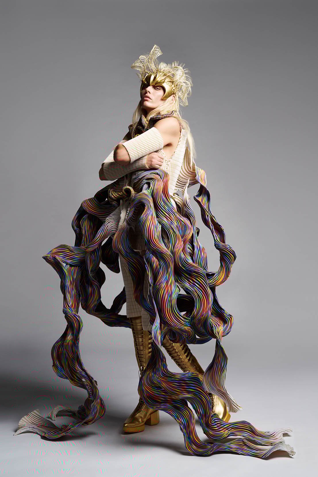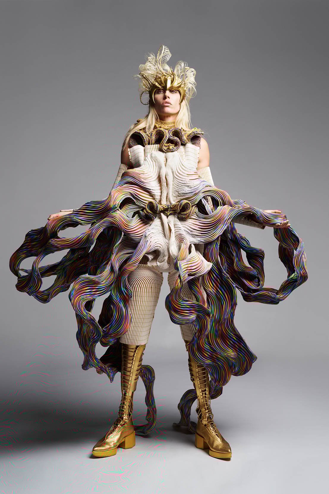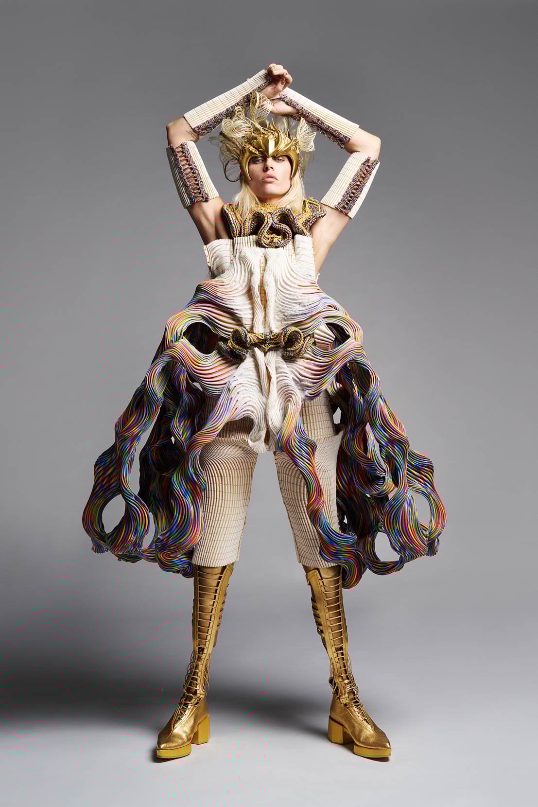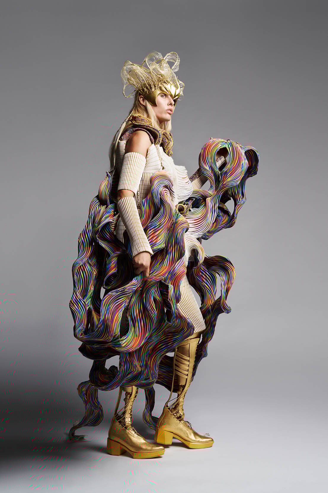 中里はまず、ローレンの採寸データをコンピューターに取り込み、数値的な情報を"布に記憶させる"という作業を行った。ローレンが愛するという自然から取り入れられた色彩を、江戸時代から伝わる着物など異なる布をつぎはぎにする手法「ボロ」のイメージで配色し、スパイバー開発の微生物発酵によって作られるタンパク質素材「ブリュード?プロテイン(Brewed Protein?)」の生地に印刷。液体に浸すと生地が縮んで形が変化し、体のラインに沿ったテキスタイルパーツが出来上がる。この最先端技術「バイオスモーキング(BioSmocking)」で制作された28枚のユニットを組み合わせ、ローレンの体型にぴったりと沿う一着のクチュールピースを完成させた。組み合わせ次第で8通りのピースに変化する構造で、完成形は、重力を感じさせない立体的なシルエットに仕上がった。これは中里が「記憶を可視化し、記憶など目に見えないものをまとう」姿を具現化したものだという。