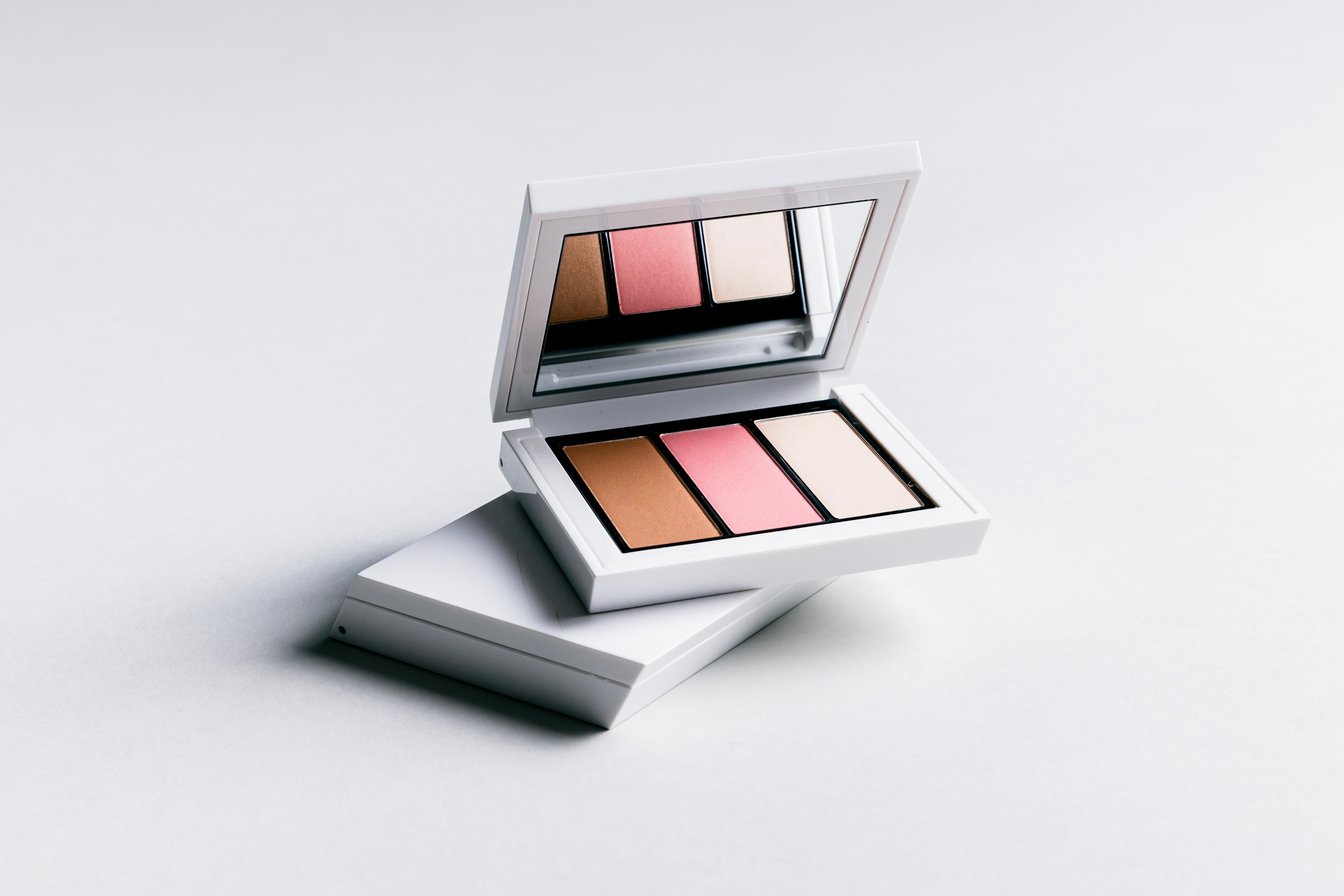 3色入りのフェイスパレットがぴったりです。少しダークな色のブロンザーを軽く頬骨の上にのせてコントゥアリングしたら、中央のピーチカラーを頬にプラス。ハイライターを頬骨の一番高いところや顎にのせれば、微細なラメがベースメイクに立体感をもたらします。それから「ティントバームリップスティック」もおすすめしたいアイテム。ゴールドとシルバーのラメが入っていて、シマーな輝きで唇に艶を与えるんです。2つのアイテムでヘルシーで魅力的なルックが完成しますよ。