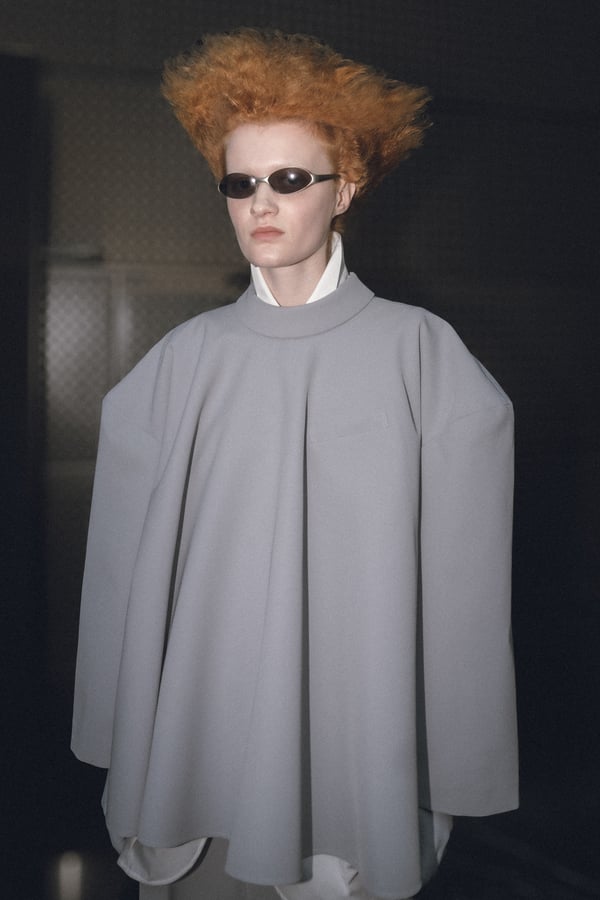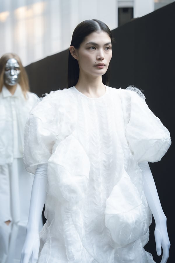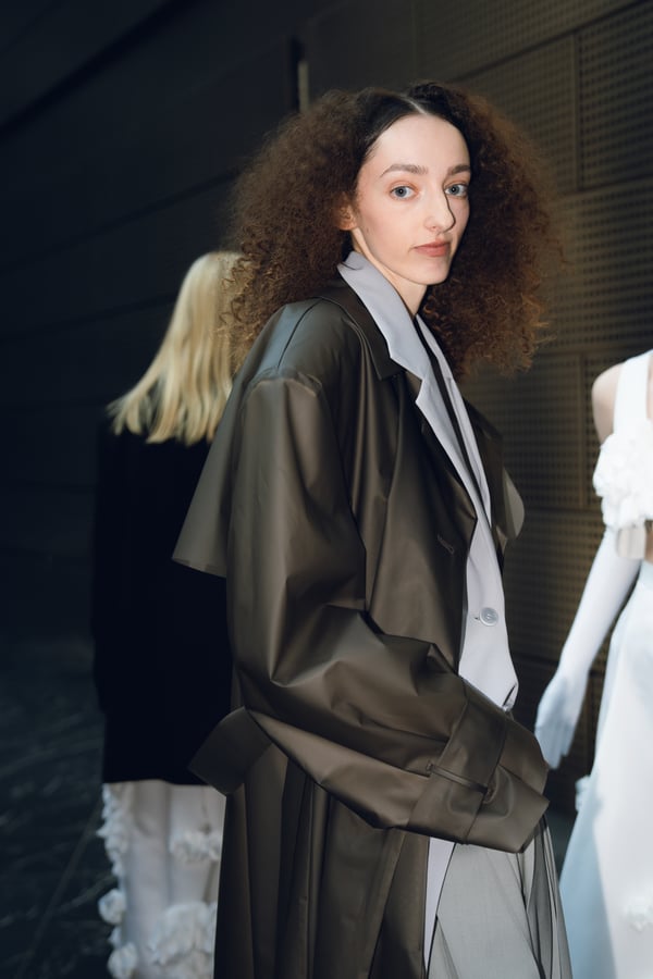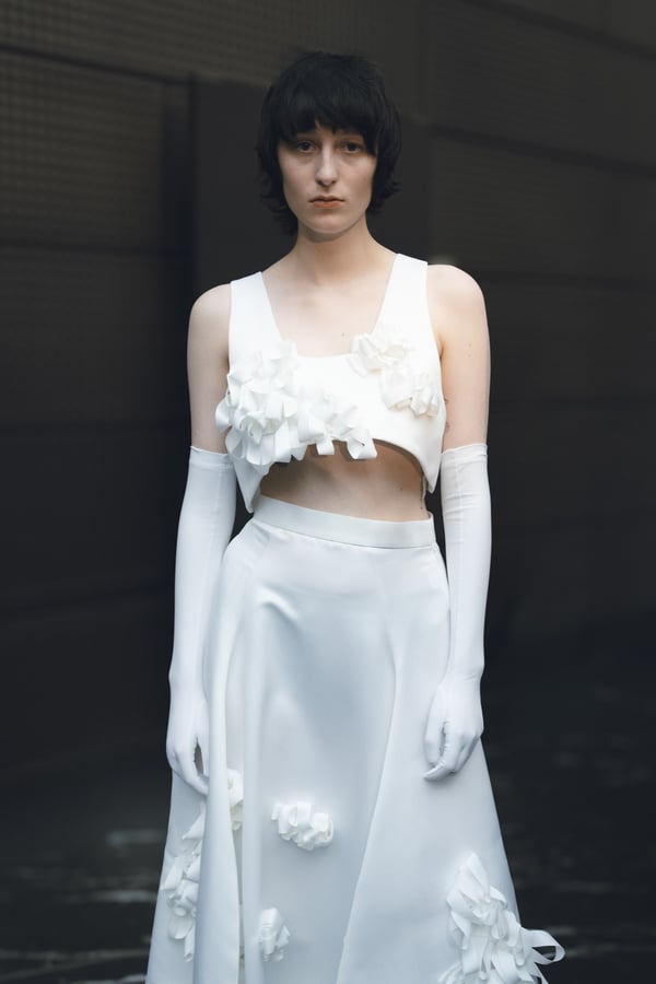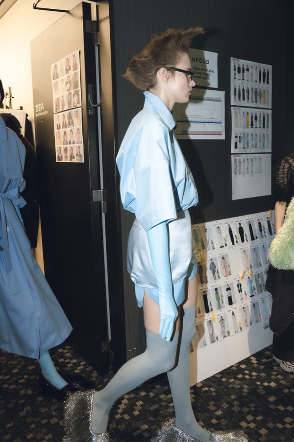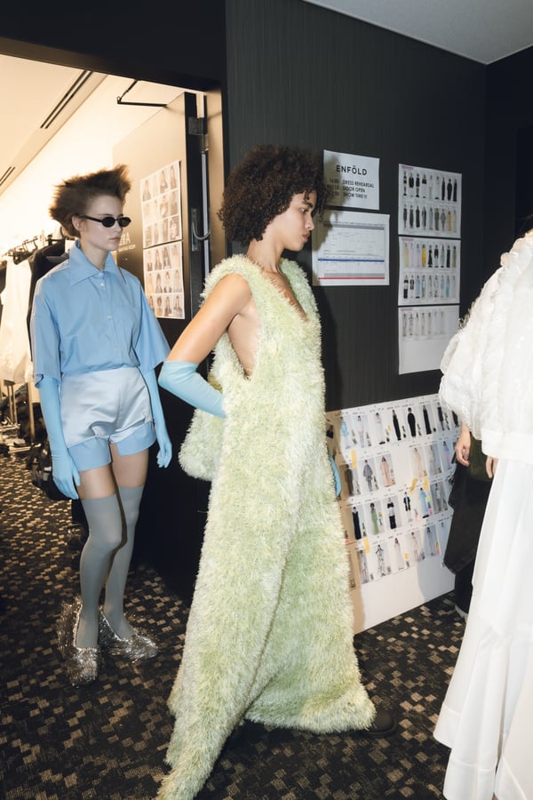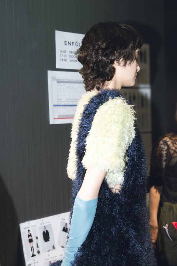 植田は「ショーで表現したことは物語の中に限定されたものではなく、ブランドの進化も表現している」と話し、身体を覆い包むようなフォルムが特徴のエンフォルドらしさに捻りを加えていった。モデルの動きとともに、コートの下の鮮やかな色使いのインナーがあらわになるスタイルや、ベストやビスチェにロンググローブを掛け合わせたルック、ボディスーツにニーソックスを合わせたスタイリングも目を引いた。全てを覆い隠すのではなく、時に大胆に露出することで、ブランドコンセプトに対する新しい挑戦を試みた。
