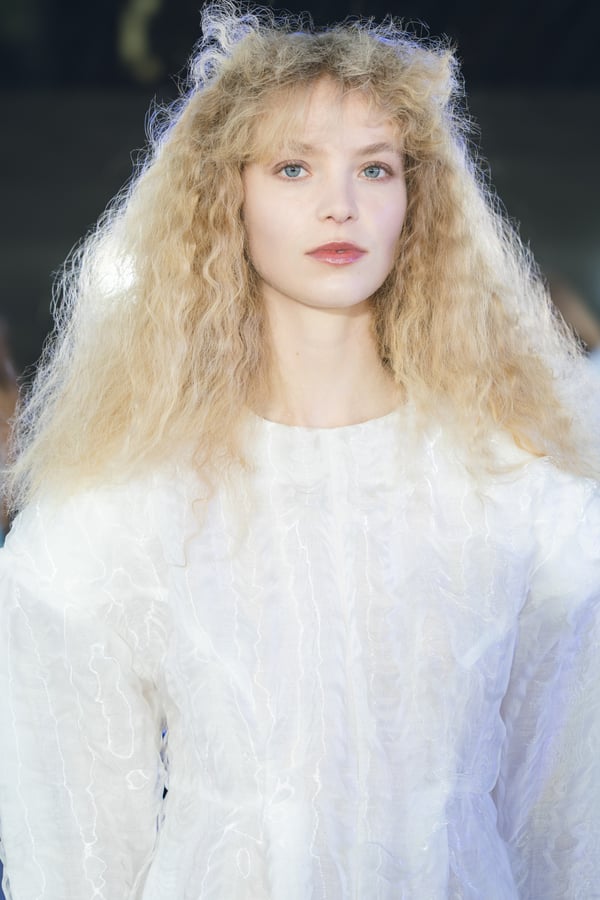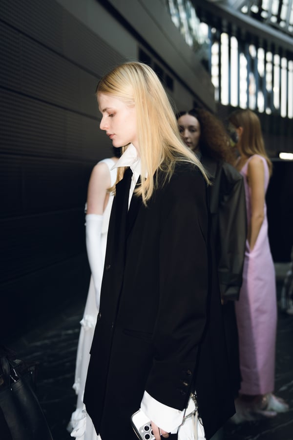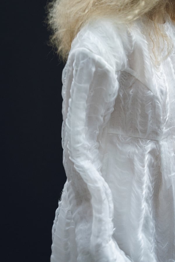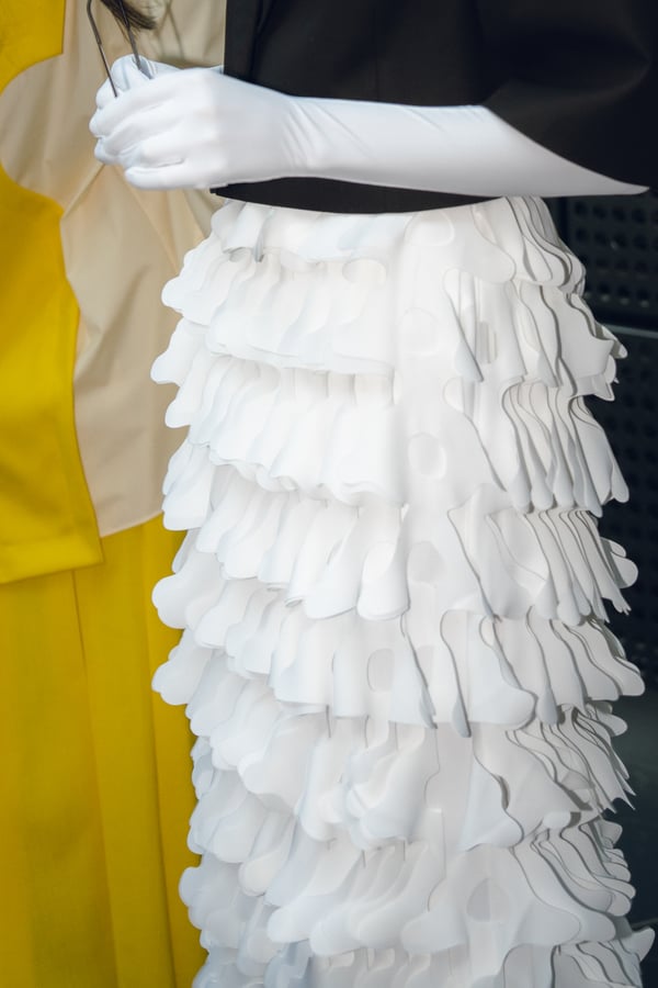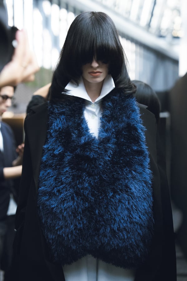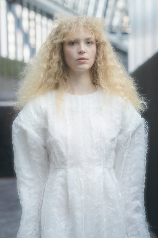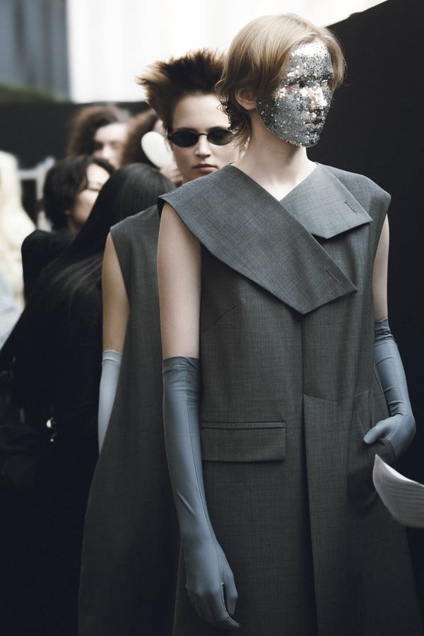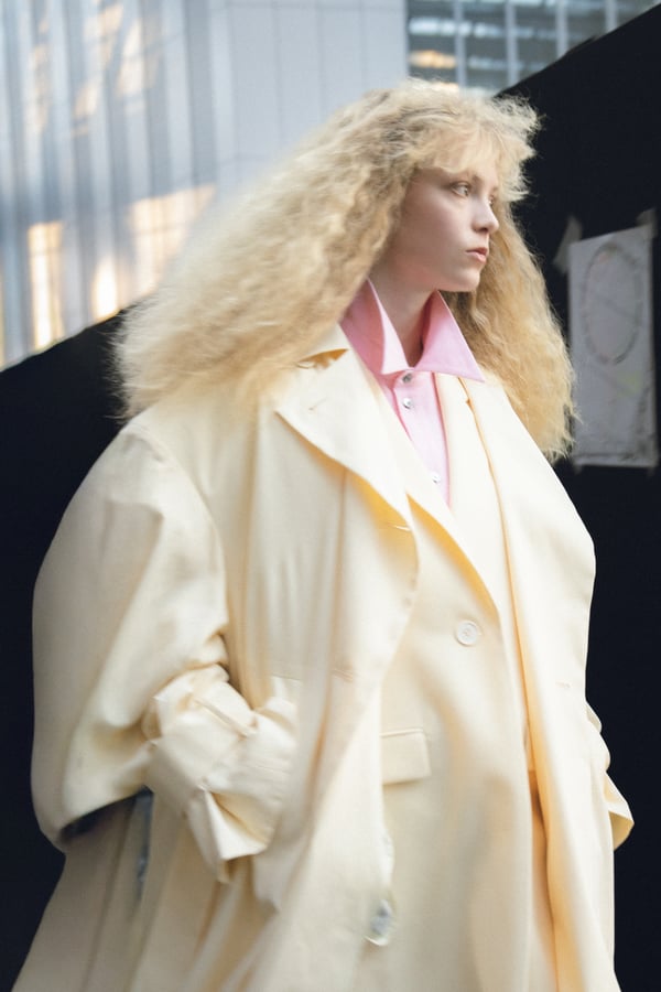 植田は「ショーで表現したことは物語の中に限定されたものではなく、ブランドの進化も表現している」と話し、身体を覆い包むようなフォルムが特徴のエンフォルドらしさに捻りを加えていった。モデルの動きとともに、コートの下の鮮やかな色使いのインナーがあらわになるスタイルや、ベストやビスチェにロンググローブを掛け合わせたルック、ボディスーツにニーソックスを合わせたスタイリングも目を引いた。全てを覆い隠すのではなく、時に大胆に露出することで、ブランドコンセプトに対する新しい挑戦を試みた。
