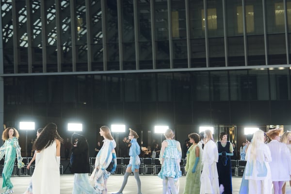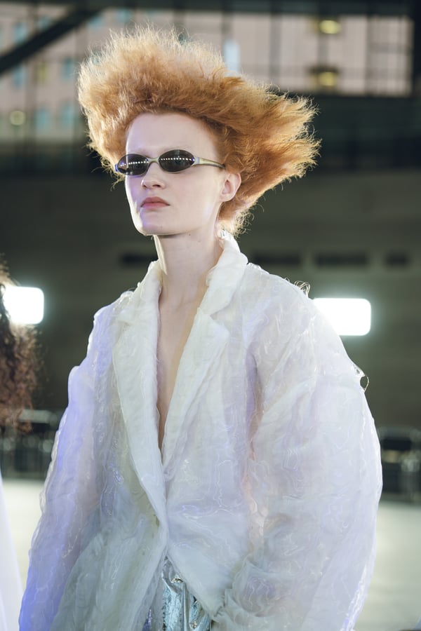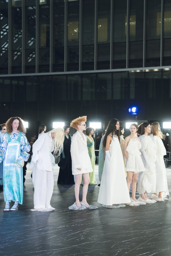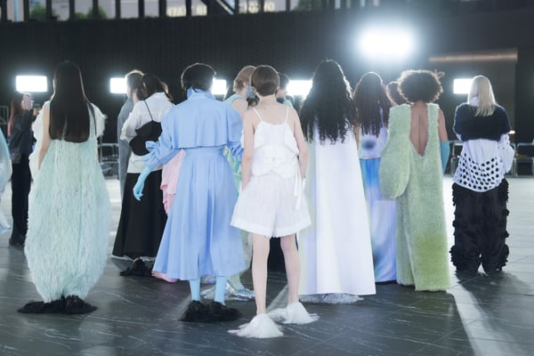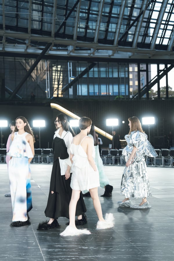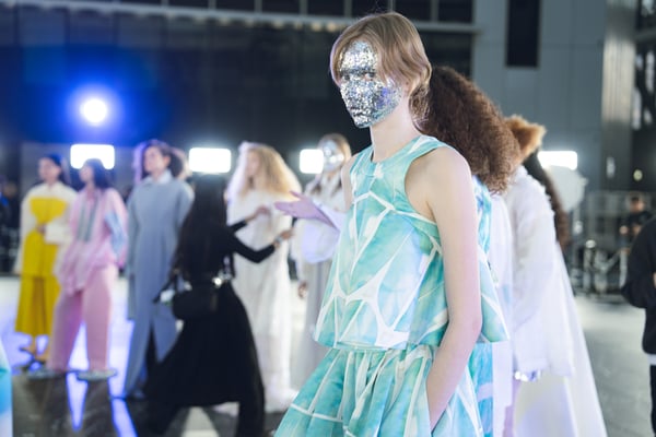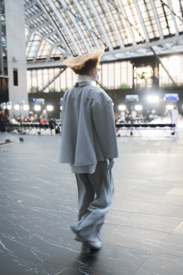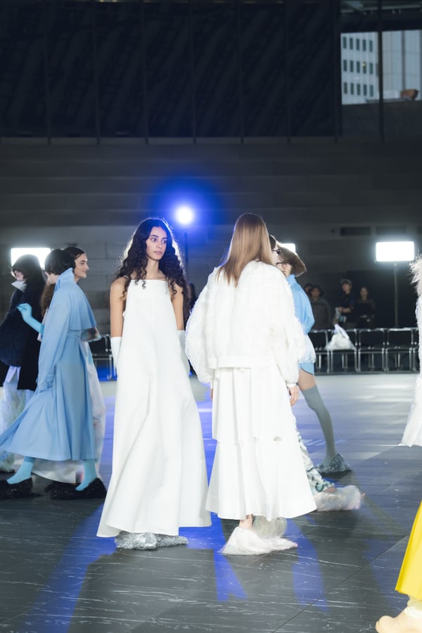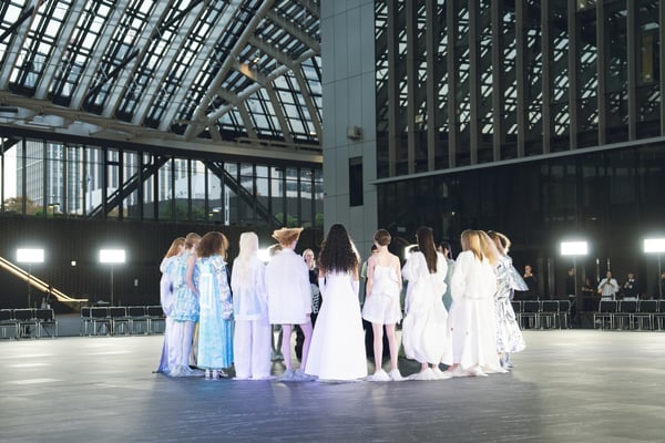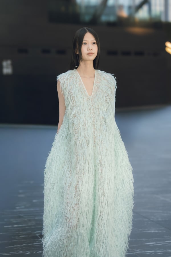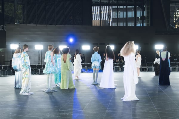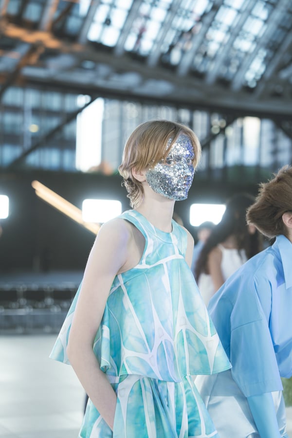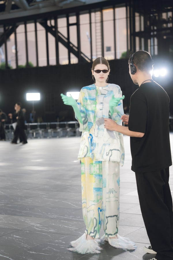 今季のテーマは、「未知との共鳴」「違いを受け入れ、形を変えて進化する感覚」といったアイデアソースから、「ECHO PLANET」と題した。植田は、「1つの正しさだけではなく、いくつもの感性の層が共鳴し合う理想の世界を表現したかった」と語り、惑星の浮遊感をイメージしたという煙がステージ中央から上がりショーがスタートした。