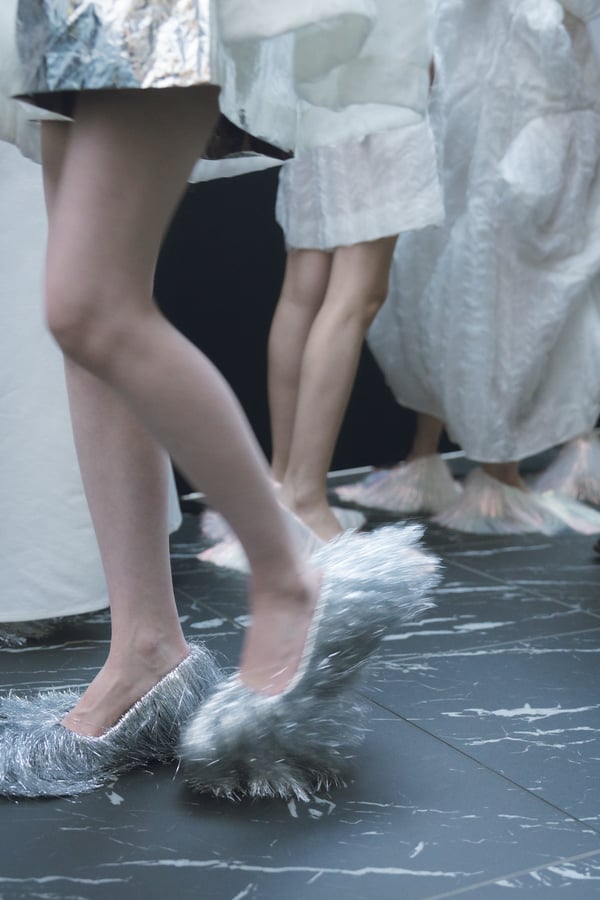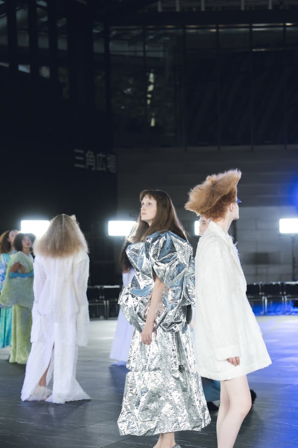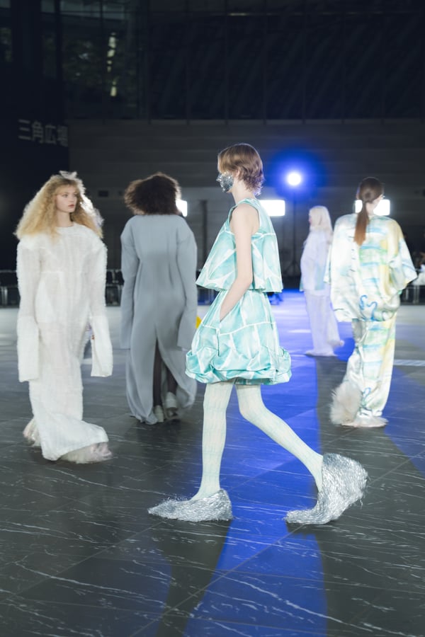 ファーストルックはUFOを彷彿とさせるバケットハットに短丈のタンクトップとショートパンツのスタイリング。帽子を目深に被ったモデルが観客と目を合わせずに進む様子は、未知の生物との遭遇を予期させた。重力に逆らったヘアスタイルや、メタリックな仮面のようなメイクといった、SF的な演出も随所に取り込まれた。星の煌めきを落とし込んだ編み地のニーハイソックスや、グラフィックをあしらったタイツ、ロンググローブといった小物がスタイリングのアクセントに。煙が立ちこめる“地表“を闊歩するかのようなモデルの足元を彩った、カラフルなバリエーションのフリンジシューズはショーピースとして制作したという。