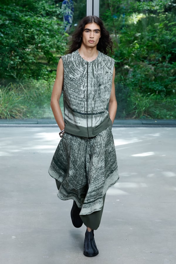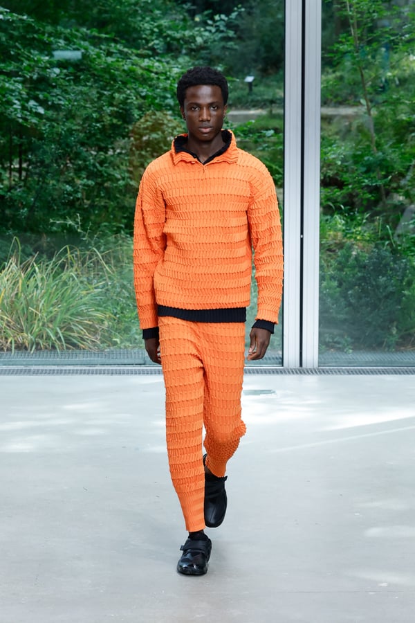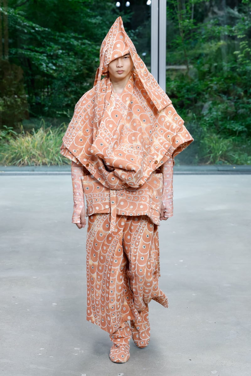 イッセイ ミヤケが展開するメンズブランド「アイム メン(IM MEN)」が、パリで2度目のファッションショーを開催した。会場は移転準備のため現在閉館中のカルティエ財団現代美術館?ジャン?ヌーヴェル建築。陶芸家?加守田章二の作品を「衣服にしてまといたい」という発想からスタートした同コレクション「DANCING TEXTURE」は、「一枚の布」というフィロソフィーと加守田作品の多面的な質感を融合し、多様な糸や織りの構造、先端技術を掛け合わせて製作した重層的なテキスタイルを主役にしたアイテムで構成された。会場には、マットな朱と白い波模様のコントラストが印象的な作品「彩色 壺」を表現したテキスタイル「EARTH」の生地が天井から吊るされ、全身を同生地に包んだパフォーマーが登場。布と一体化し、布が生命を得たかのように躍動した。