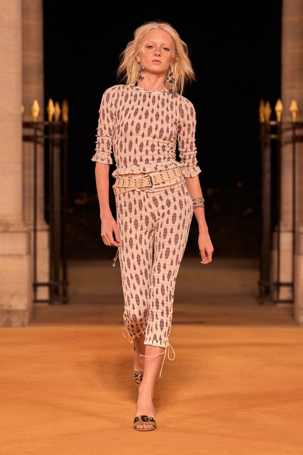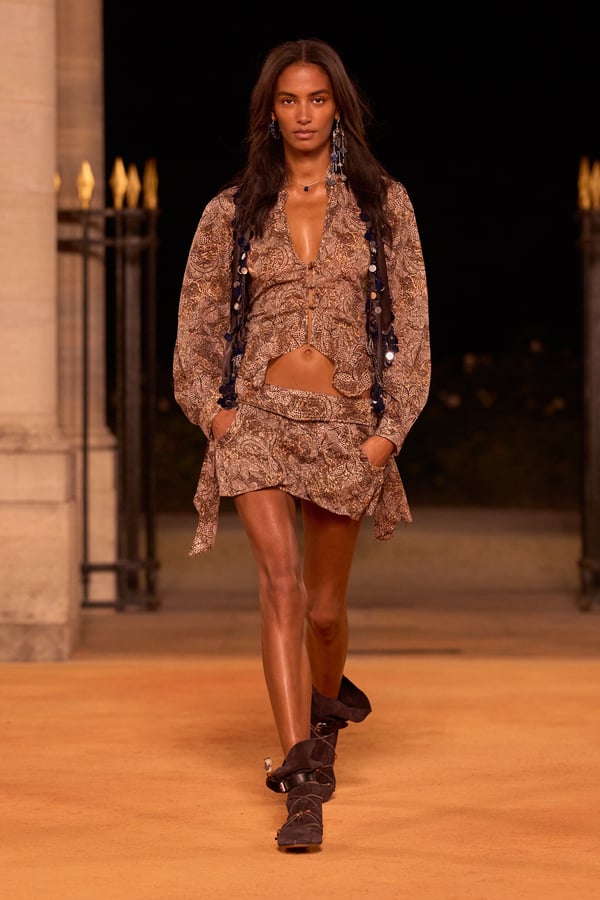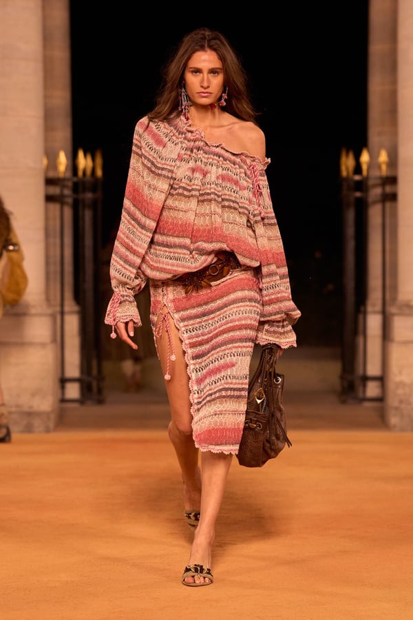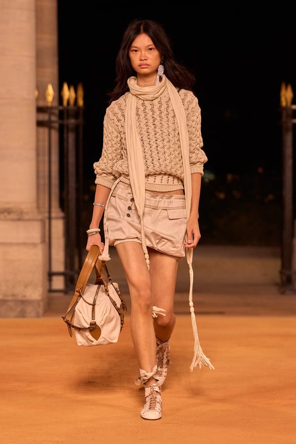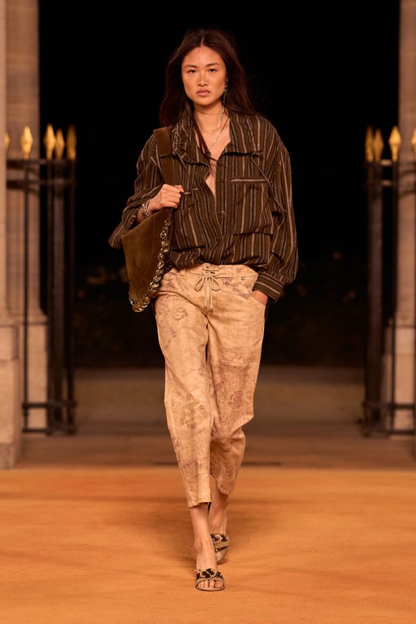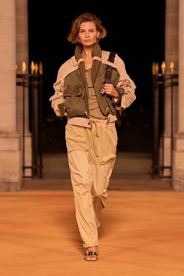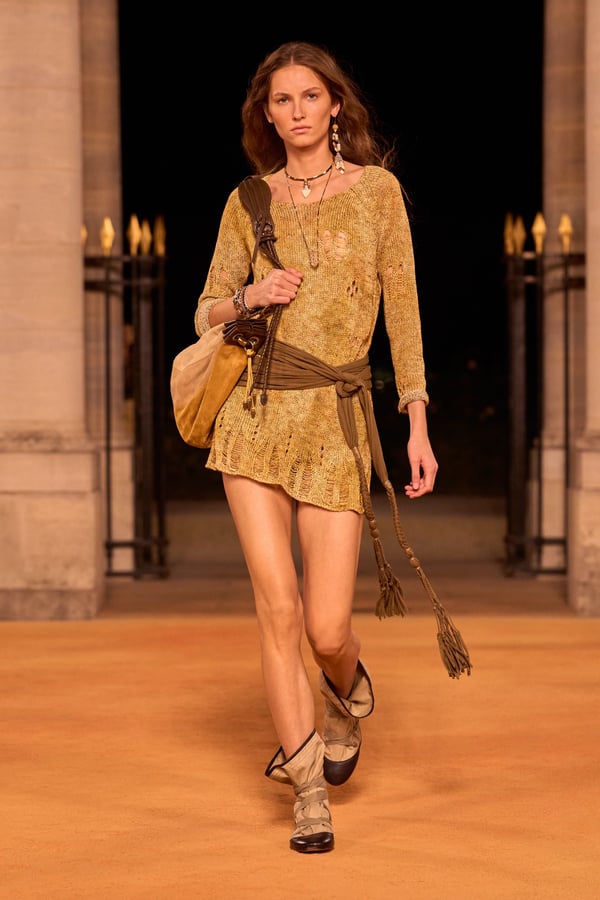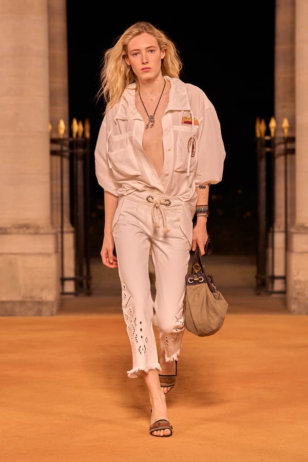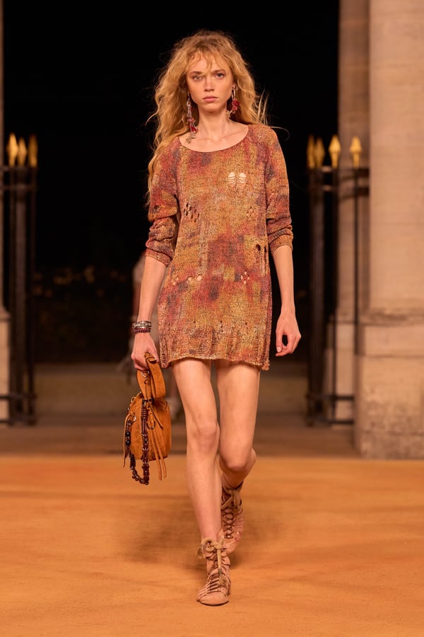 「イザベル?マラン(ISABEL MARANT)」2026年春夏コレクションは、会場に敷きめられた赤土に呼応して太陽に導かれ旅に出る女性の物語を軸にワードローブを展開。ウォッシュドシルクやエンボスレザー、樹皮のようなジュエリーや刺繍がデザインされ、軽やかに揺れるクロシェやラッフル、ビーズ付きフリンジ、巻きスカーフに加え、カーゴトラウザーやフラップ付きジャケットでユーティリティを融合した。ドレスはノットで結びヘルシーに素肌をのぞかせ、メンズ?ウィメンズともにボタンダウンシャツやサマーニットで抜け感を演出。サンドやエクリュから夕暮れのブラック、星空を想起させるカモフラージュまで、自然の色彩を移ろうように描いた。なお、本シーズンからキム?ベッカー(Kim Bekker)がクリエイティブディレクターとしてコレクション制作にあたり、創業デザイナーのイザベル?マランは引き続きブランドに関わっていくものの、ショーの表舞台からは引退することが発表された。