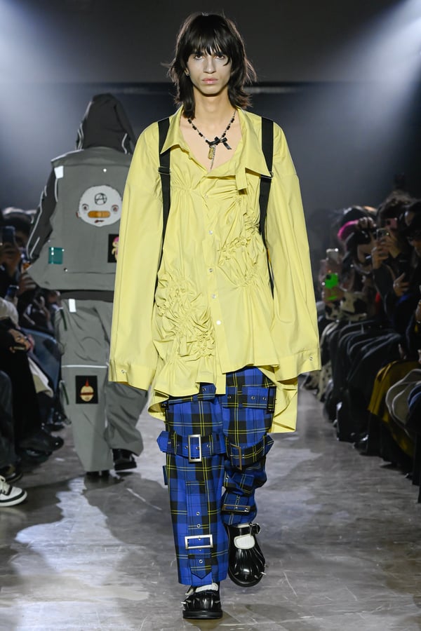 ディテールには、カットアウトやタータンチェック、ボンテージ、セーフティピンなどが用いられ、素材はジャカードからリフレクターまで多岐にわたる。製作においては、ビスポークテーラリングの技術を持つチームとの協業を継続し、仕立ての知見を取り入れたという。
