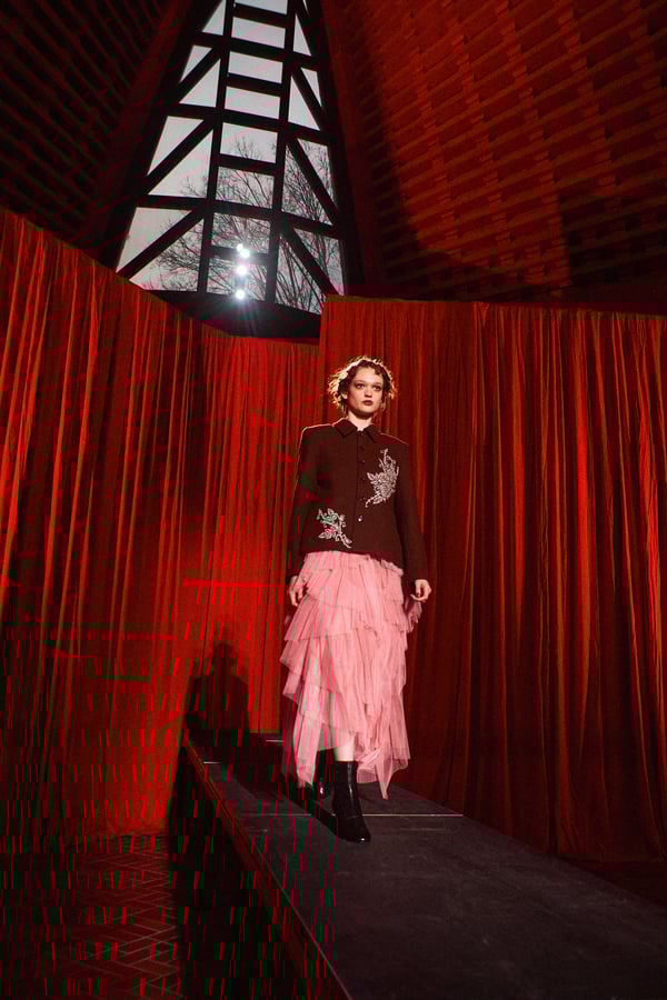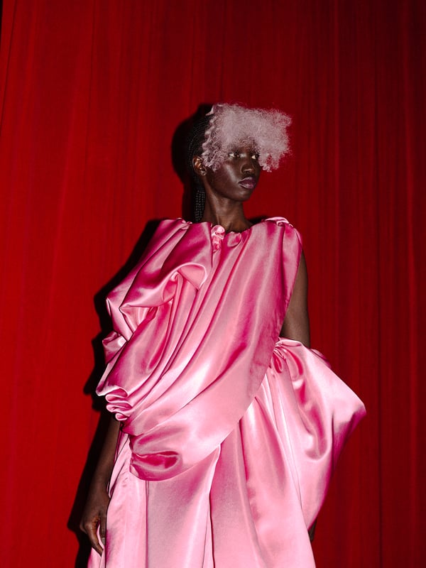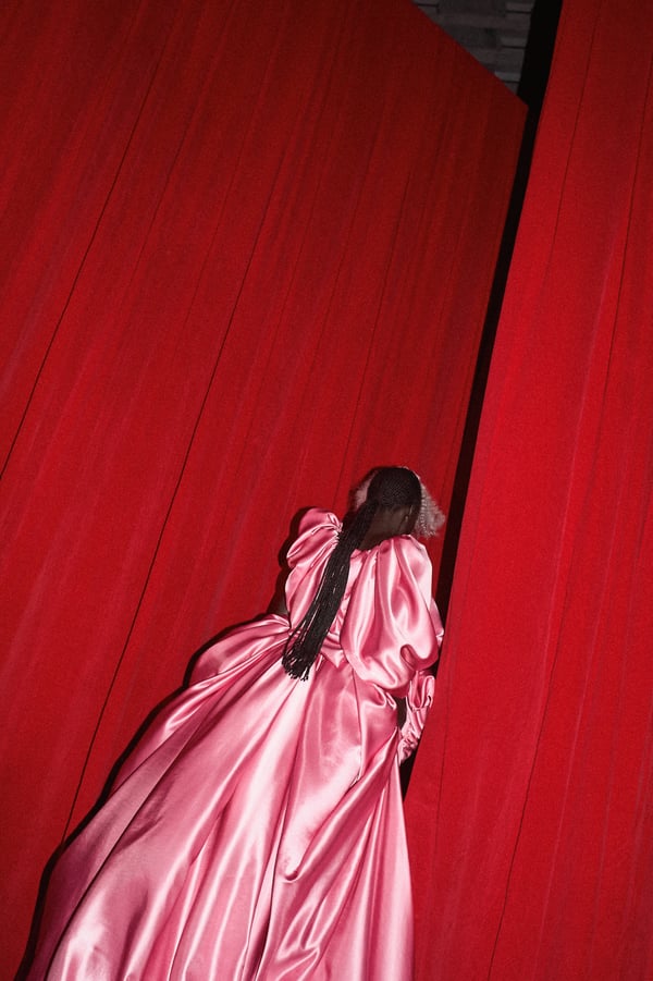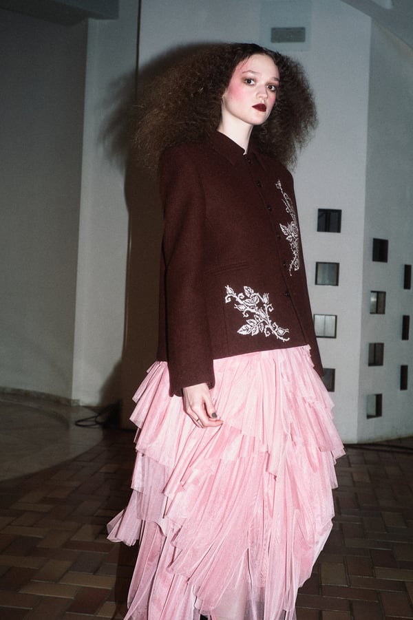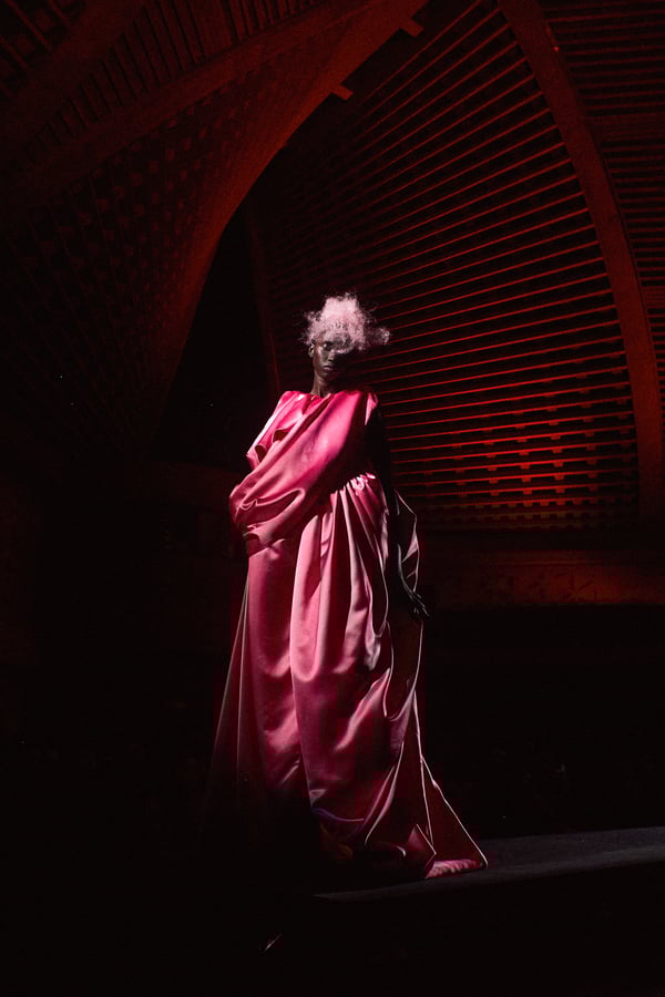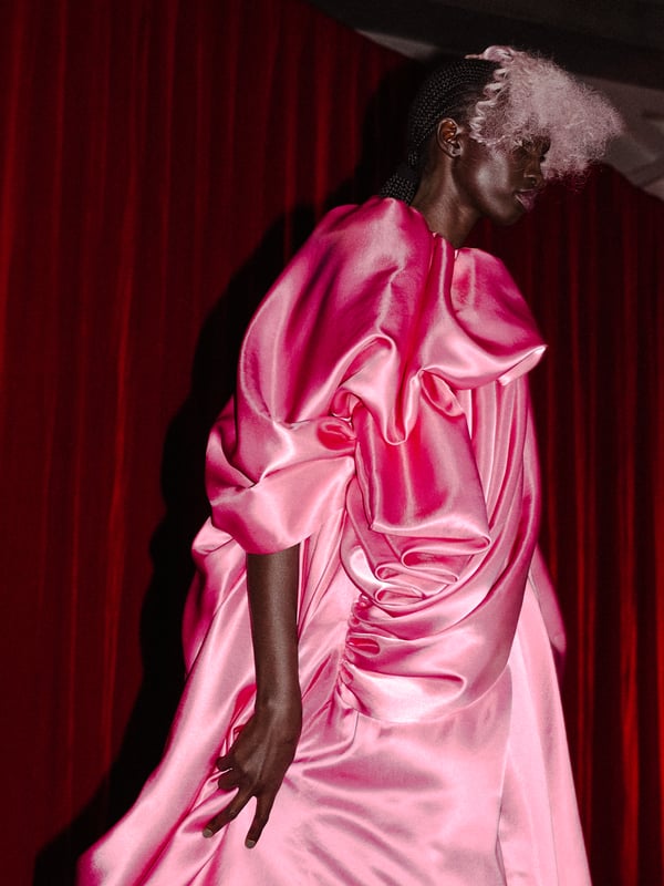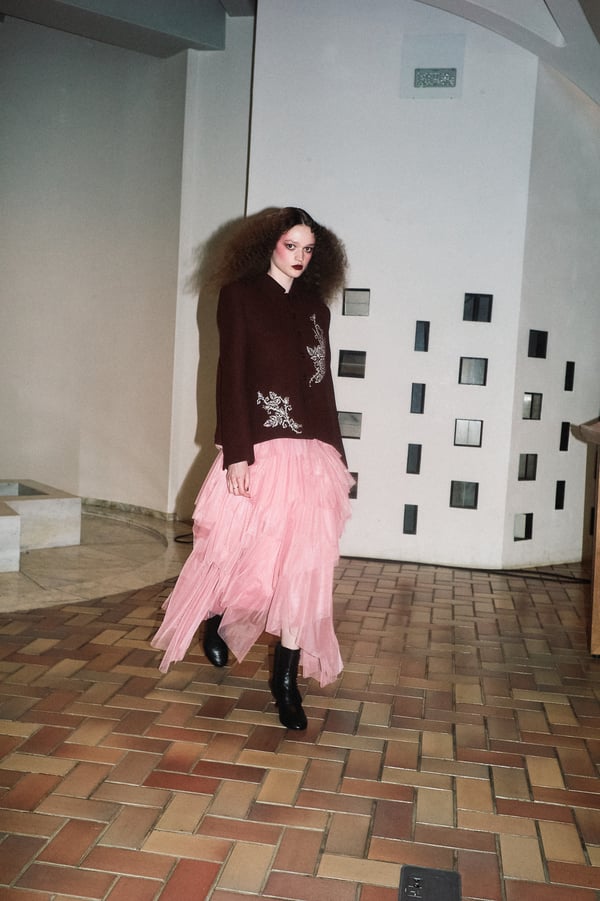 コレクションは、“秩序の花々の間からほのかにゆらめくカオス”というブランドのコンセプトに立ち返り、「今デザイナーが作りたいものだけ」を純粋に製作。肩パッド入りのクラシックなブラックコートから、ブラウンのレザーセットアップ、そして大胆にドレープをあしらった鮮やかなピンク色のサテンドレスまで、そして大胆にドレープをあしらった鮮やかなピンク色のサテンのドレスまで、異なる印象のアイテムを幅広いカラーパレットで混ぜ合わせることで、周りが決めた「ヴィヴィアーノらしさ」に収まらないスタイルを表現したという。