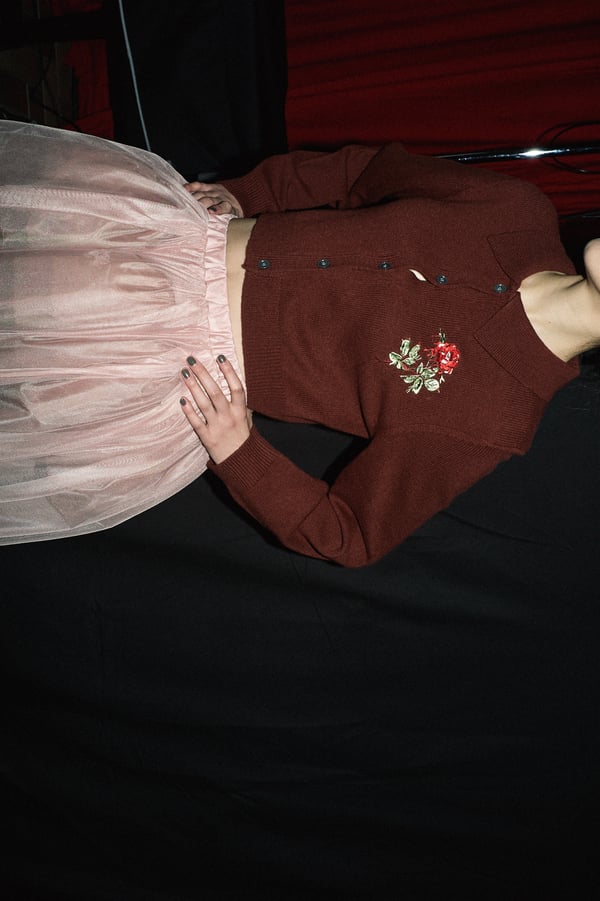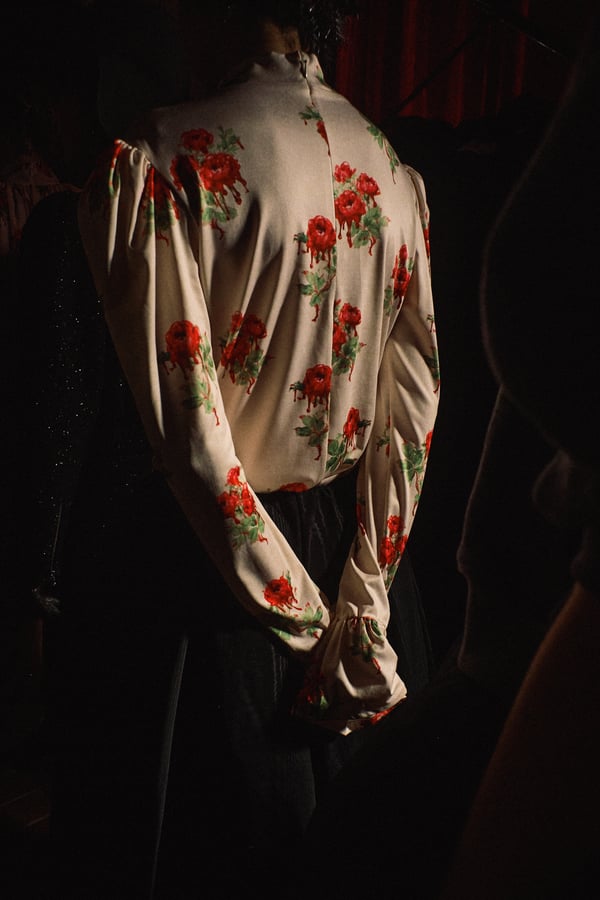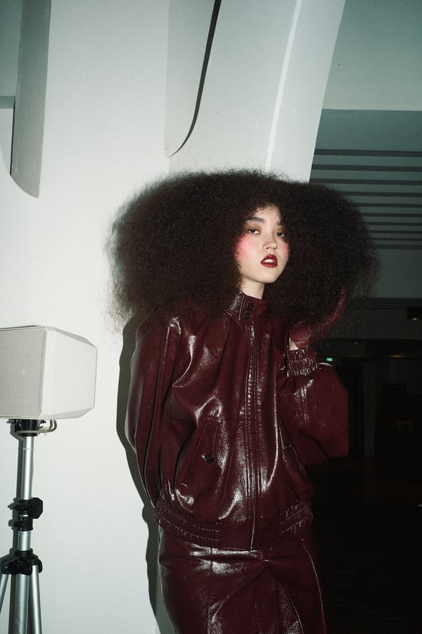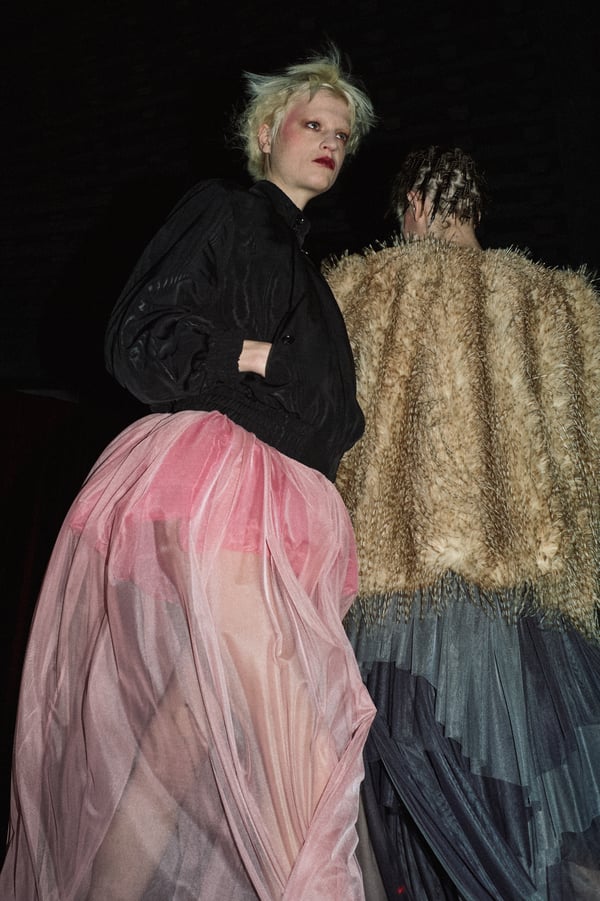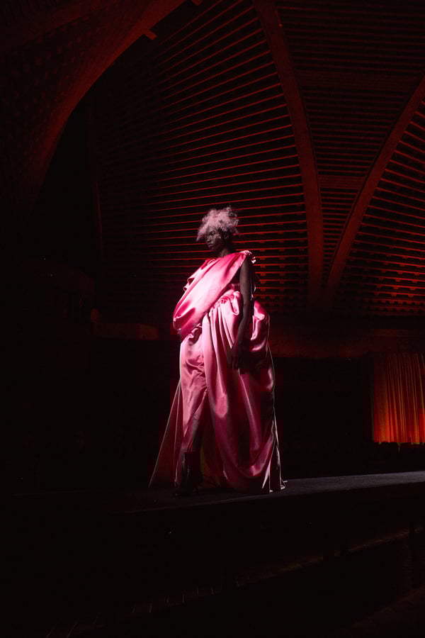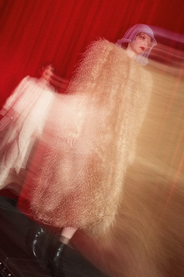 コレクションは、“秩序の花々の間からほのかにゆらめくカオス”というブランドのコンセプトに立ち返り、「今デザイナーが作りたいものだけ」を純粋に製作。肩パッド入りのクラシックなブラックコートから、ブラウンのレザーセットアップ、そして大胆にドレープをあしらった鮮やかなピンク色のサテンドレスまで、そして大胆にドレープをあしらった鮮やかなピンク色のサテンのドレスまで、異なる印象のアイテムを幅広いカラーパレットで混ぜ合わせることで、周りが決めた「ヴィヴィアーノらしさ」に収まらないスタイルを表現したという。
